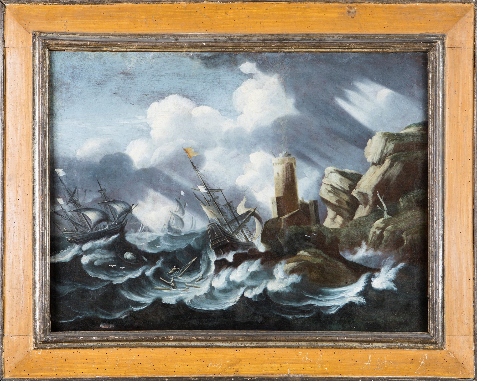 olio su tela cm 70x95 - in cornice: cm 100x123 Bartolomeo Pedon (bottega di) olio su tela cm 70x95 - in cornice: cm 100x123 Il tema del mare in tempesta divenne, per numerosi pittori del XVII e XVIII secolo, un espediente formidabile per sperimentare sofisticati virtuosismi pittorici. Bartolomeo Pedon, importante vedutista veneziano, rappresentò in questo senso un modello a cui ispirarsi. La tela qui proposta, con gli efficaci colpi di luce e il grande senso di movimento, si inserisce a giusto titolo tra le produzioni a egli collegabili.