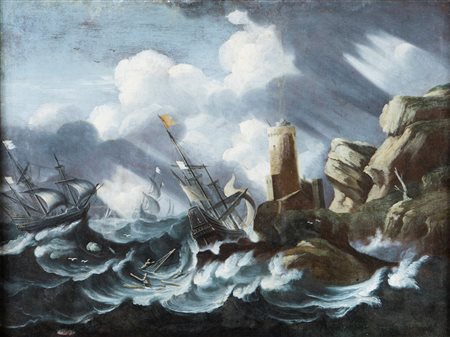 Bartolomeo Pedon (bottega di) (Venezia, 1665 - Venezia, 1732) Mare in tempesta con velieri e faro