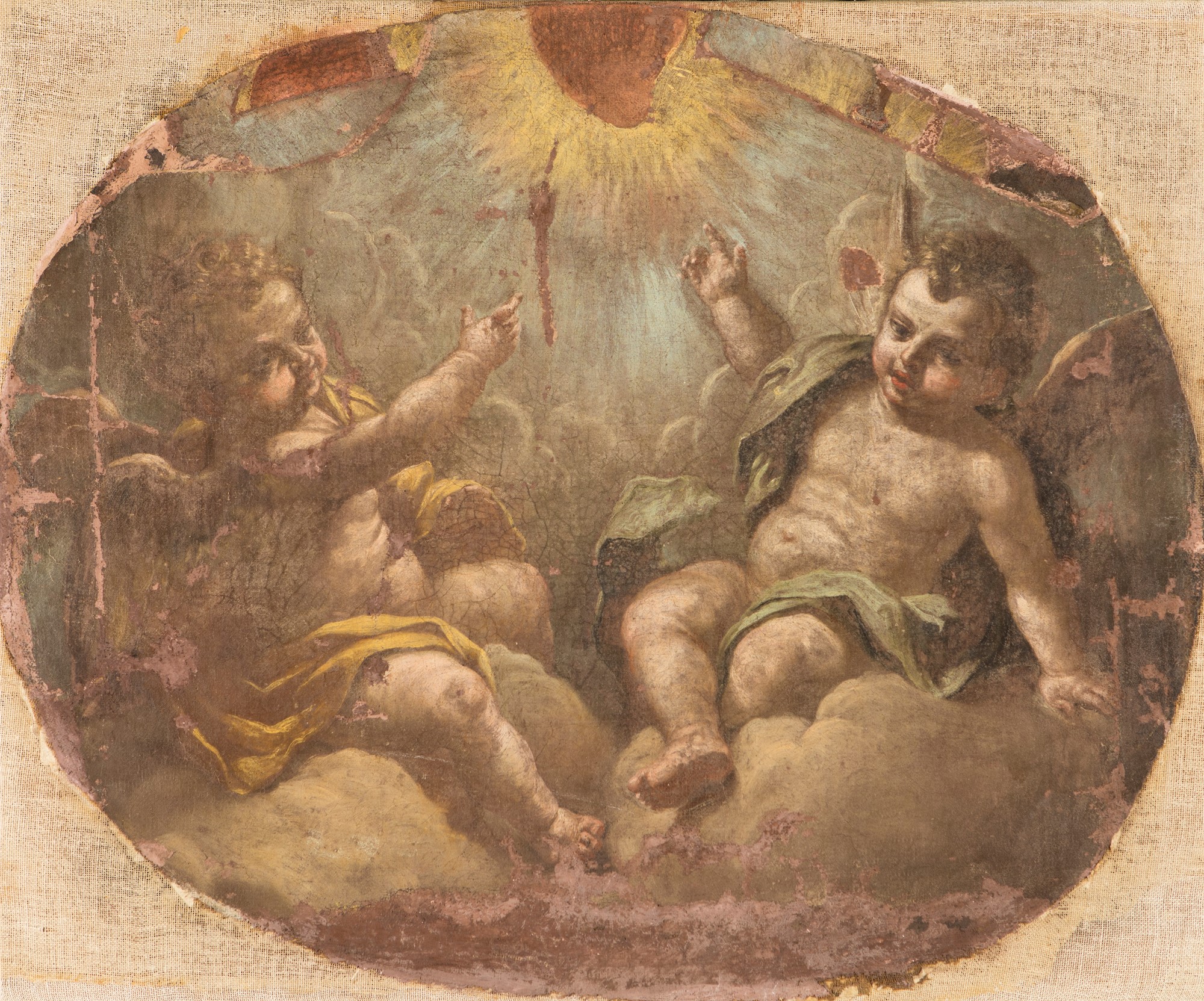 olio su tela cm 64x76 Scuola Genovese del XVII secolo olio su tela cm 64x76 La raffigurazione dei due putti, su un tappeto di nubi, colpisce per la grande qualità dei panneggi e per il sapiente uso della luce.