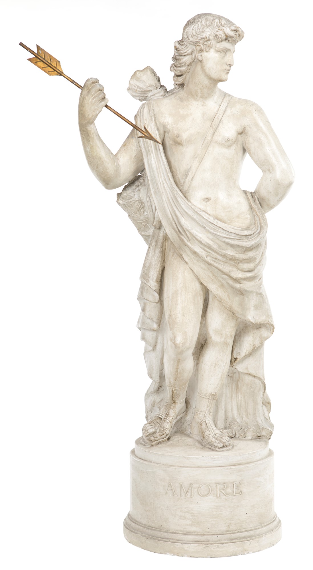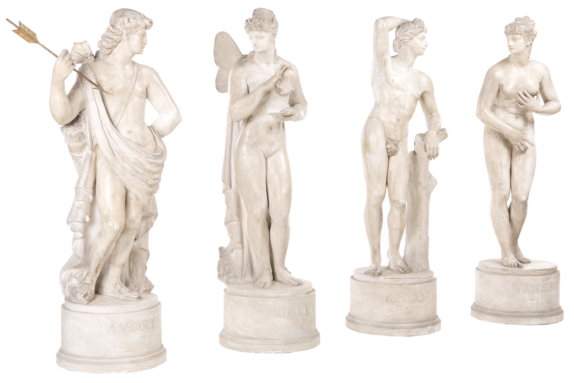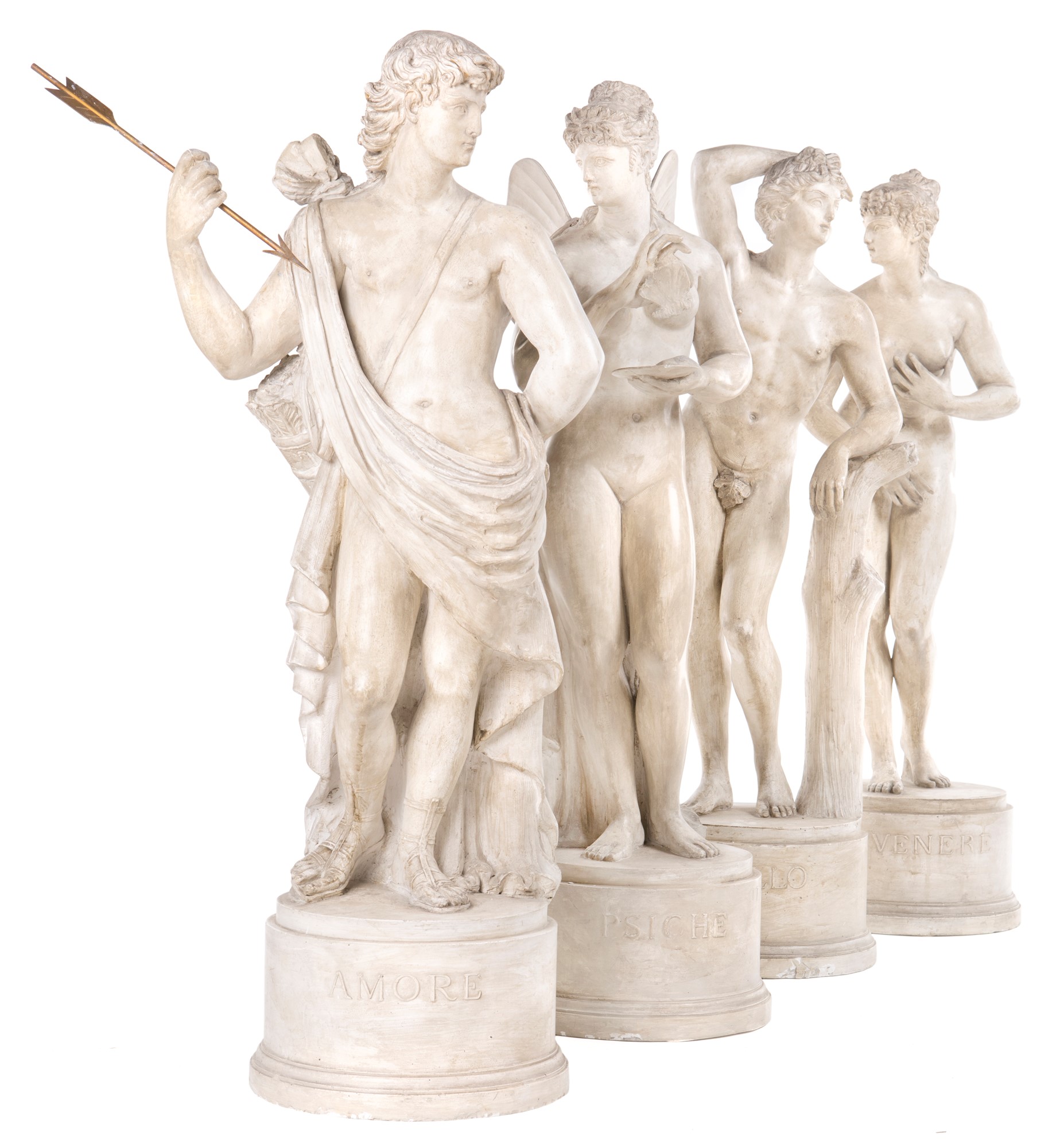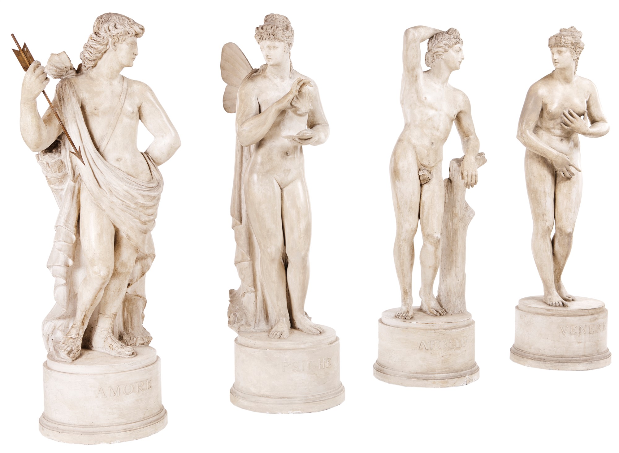 altezza cm 103 Adamo Tadolini altezza cm 103 raffiguranti Amore, Psiche, Apollo e Venere desunti dal repertorio classico. Ognuna reca sulla base monogramma A.T. erroneamente ricondotto in passato allo scultore danese Albert (Bertel) Thorwaldsen (Copenaghen 1770 - 1844), massimo rappresentante del neoclassicismo in scultura e maggior rivale di Antonio Canova. Rotture e lievi mancanze.