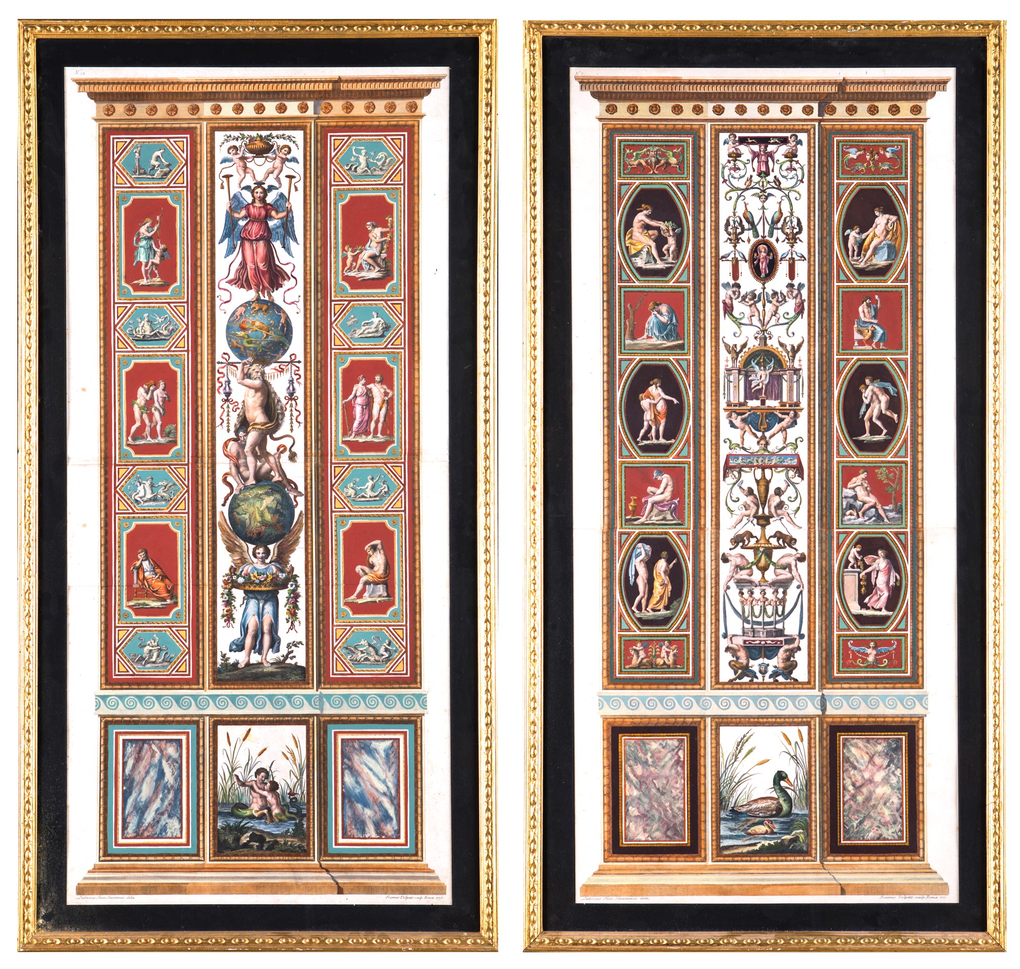 due incisioni acquerellate con la cornice: cm 115x59,5 Giovanni Volpato due incisioni acquerellate con la cornice: cm 115x59,5 su disegno di Ludovico Teseo; datate 1775 e 1776