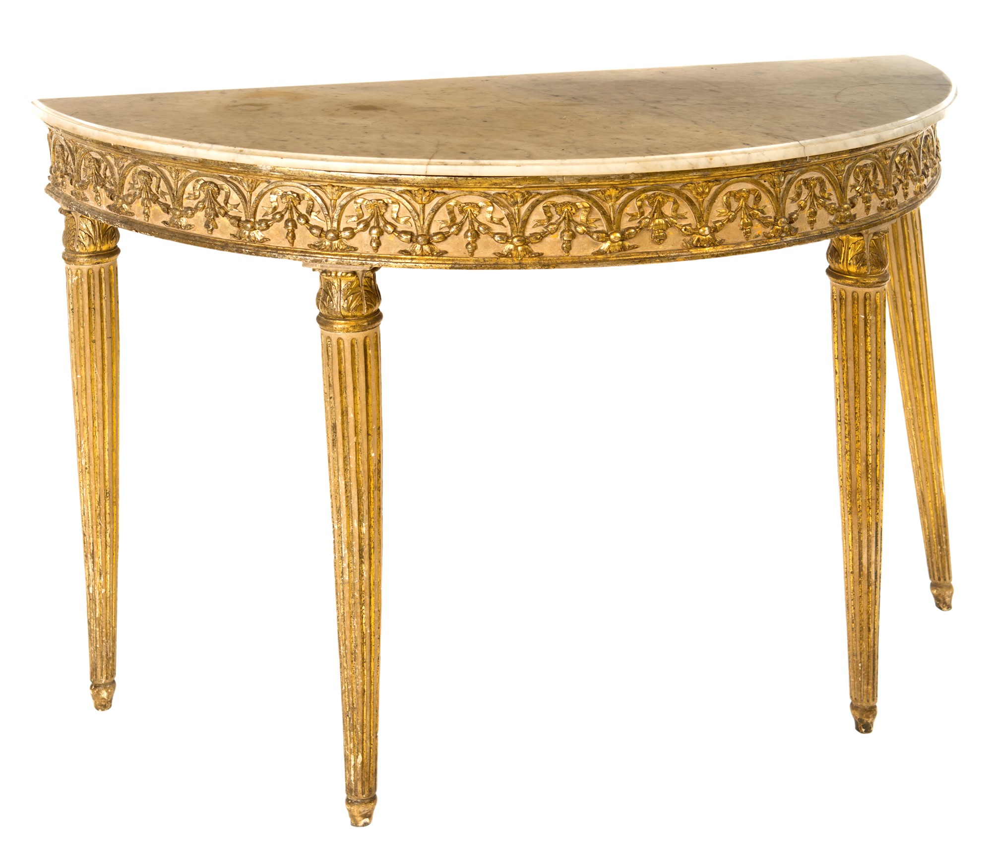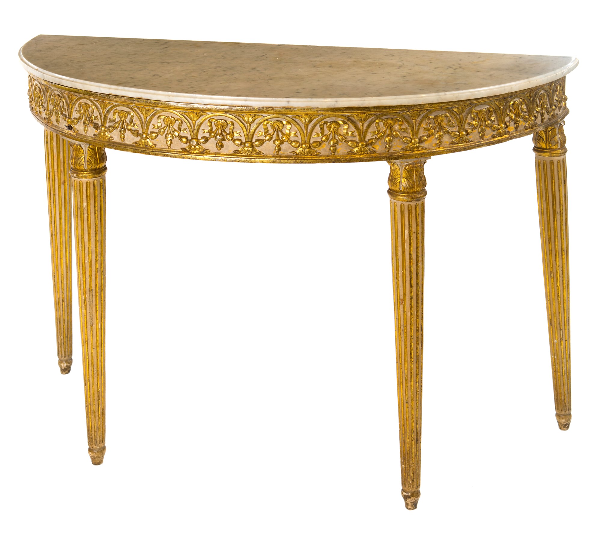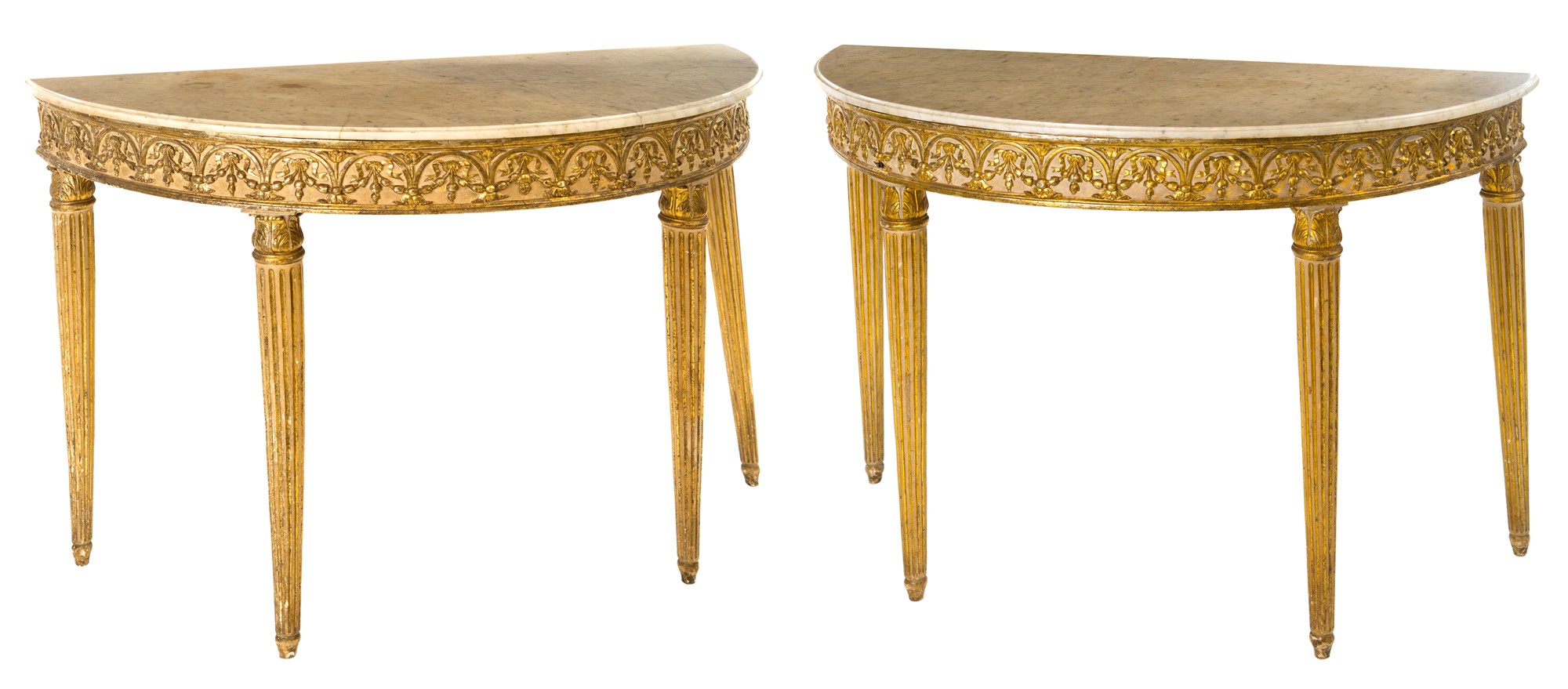 Coppia di consoles a demilune in legno dorato, fine del XVIII secolo