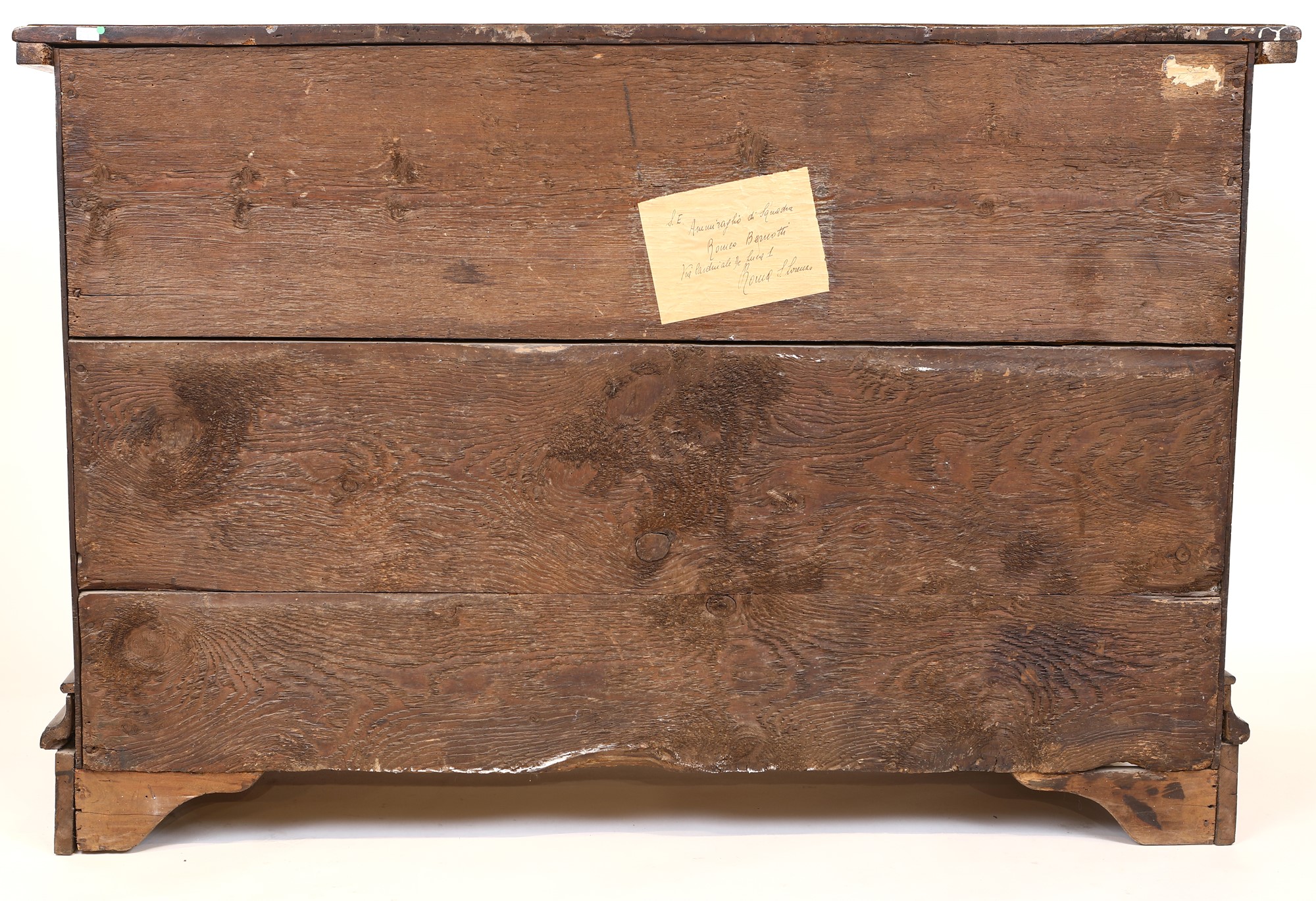 cm 106x67,5x162 cm 106x67,5x162 con facciata mistilinea suddivisa in tre cassetti con intarsi a volute vegetali variamente ricurve e fiori; bocchette e maniglie in bronzo, piedi a mensola