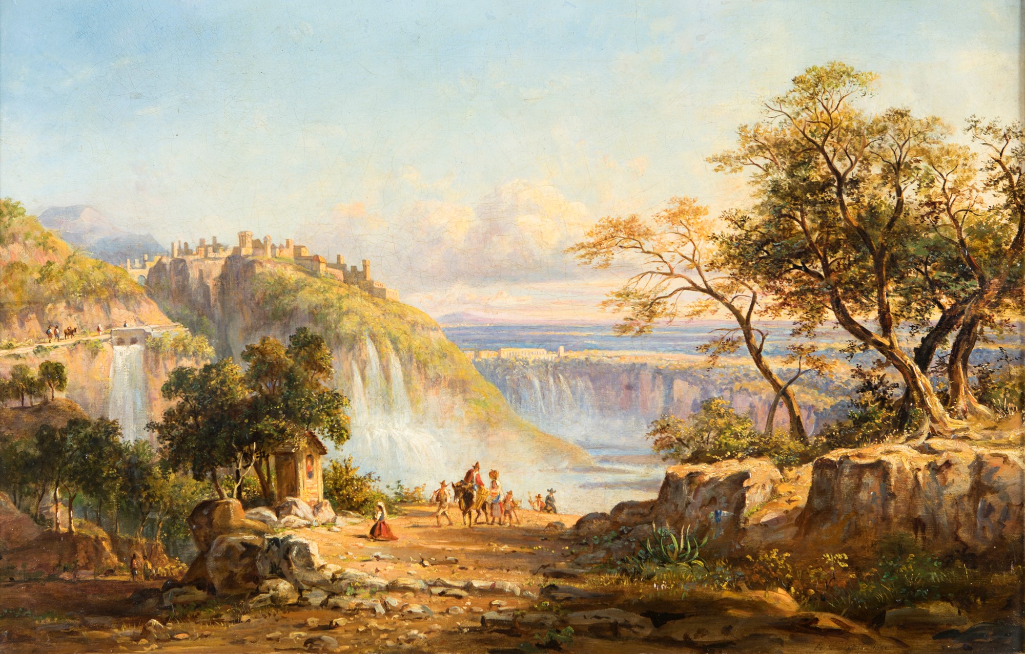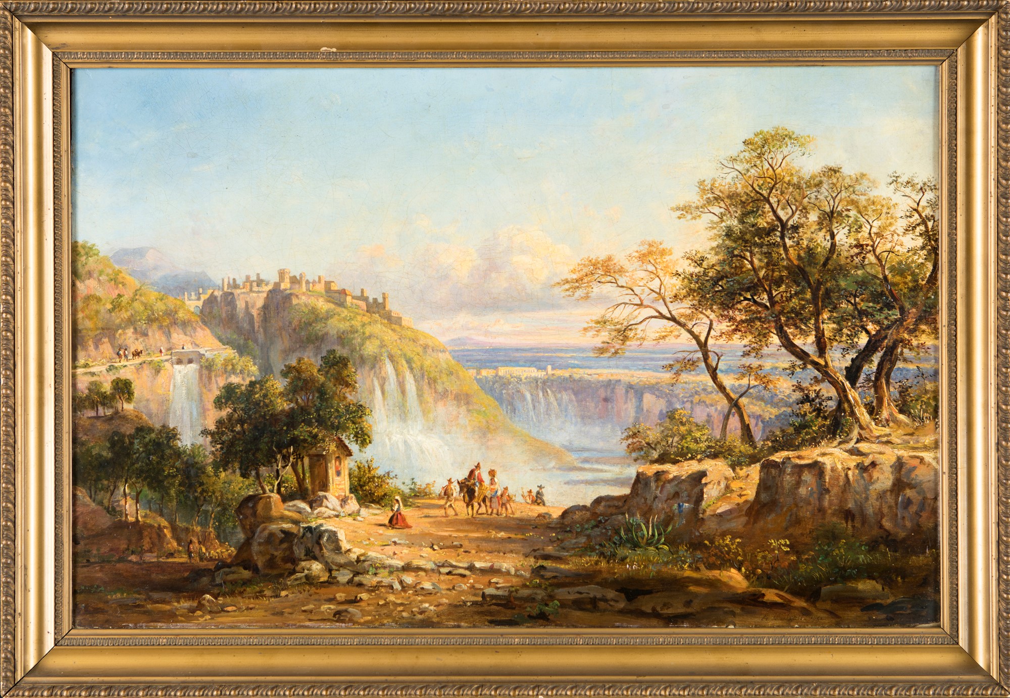 olio su tela cm 45x68 - in cornice: cm 54x78,5 Arthur John Strutt olio su tela cm 45x68 - in cornice: cm 54x78,5 Firmato e datato in basso a destra: A. J. Strutt 1841. Il dipinto, raffigurante un paesaggio con cascate e città sullo sfondo, è opera di un importante paesaggista e archeologo inglese che si stabilì in Italia nel 1831. Strutt passerà alla cronaca per aver intrapreso un viaggio a piedi verso il sud Italia, da Roma a Palermo, le cui osservazioni furono raccolte nel fortunato libro, "A pedestrian tour in Calabria & Sicily" (Un viaggio a piedi in Calabria e in Sicilia), a cui molti paesaggisti si riferirono negli anni successivi. Come vediamo, i colori lucenti e l'equilibrata composizione confermano l'alta qualità dei suoi dipinti