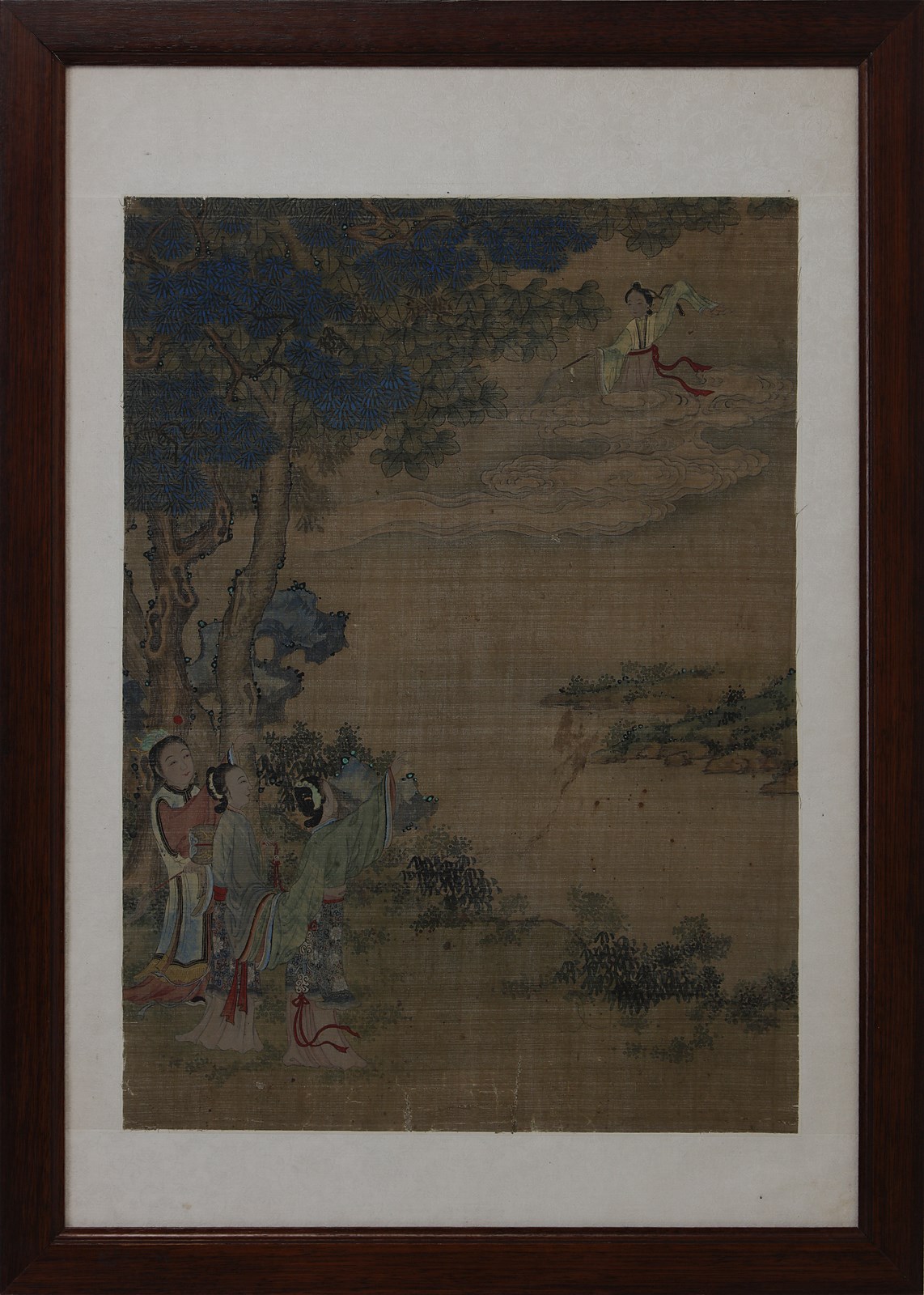 Cina, dinastia Qing, XVIII-XIX secolo . . Cm 35,00 x 50,00. Raffigurante un gruppo di tre donne sulla sinistra e immortale femminile taoista su nuvola in alto a destra. Cornice presente