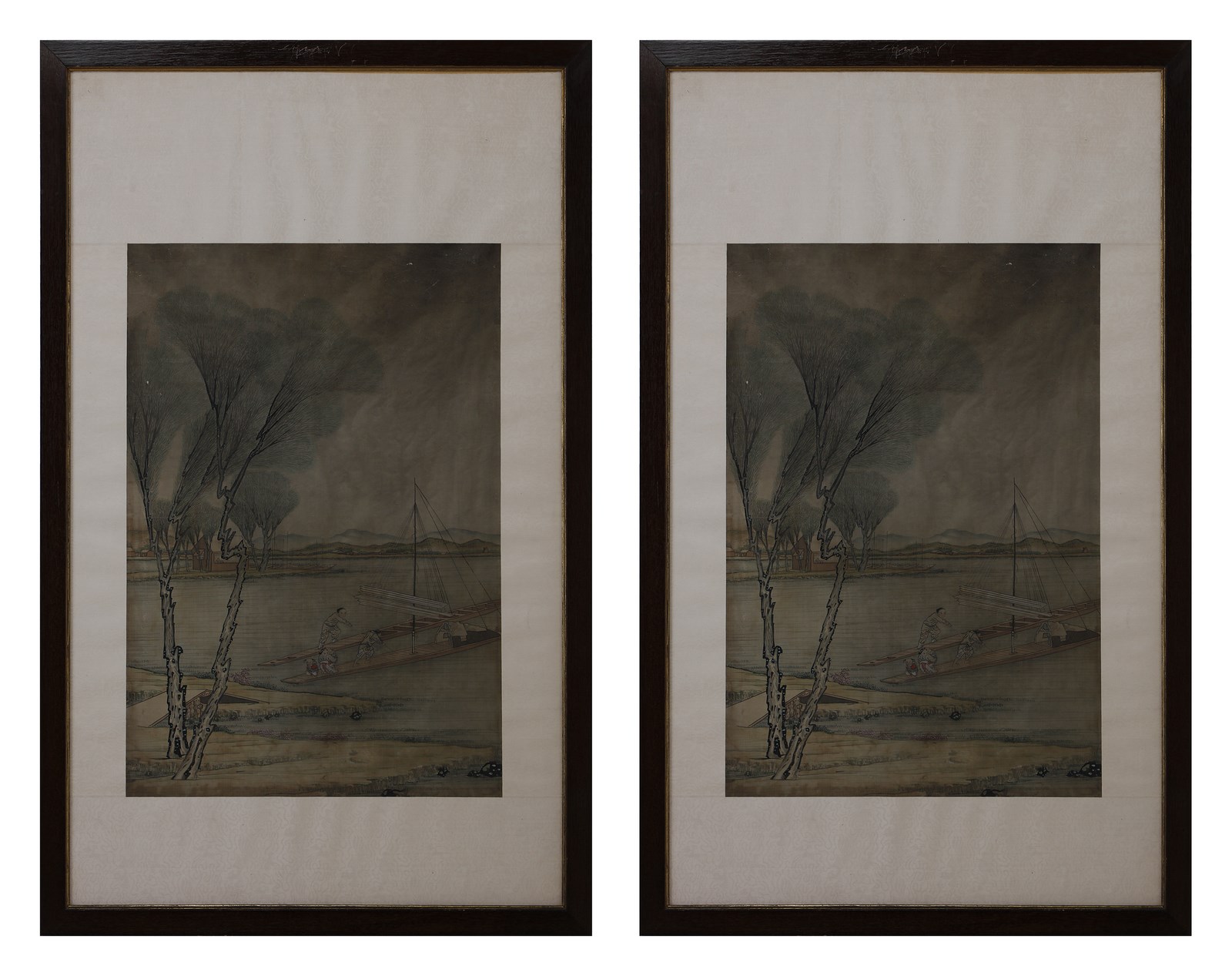 Arte Cinese Coppia di dipinti a tema lacustre.