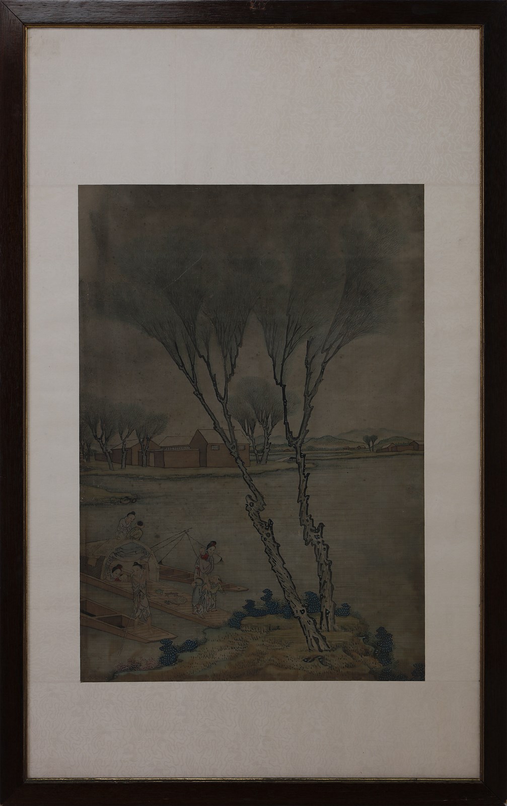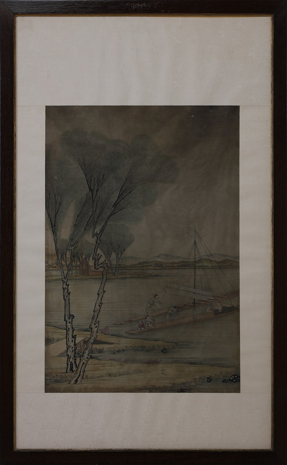 Cina, dinastia Qing, XVIII-XIX secolo. . Cm 39,00 x 57,00. Dipinti inchiostro e colori su seta raffiguranti personaggi su imbarcazioni. Cornice presente