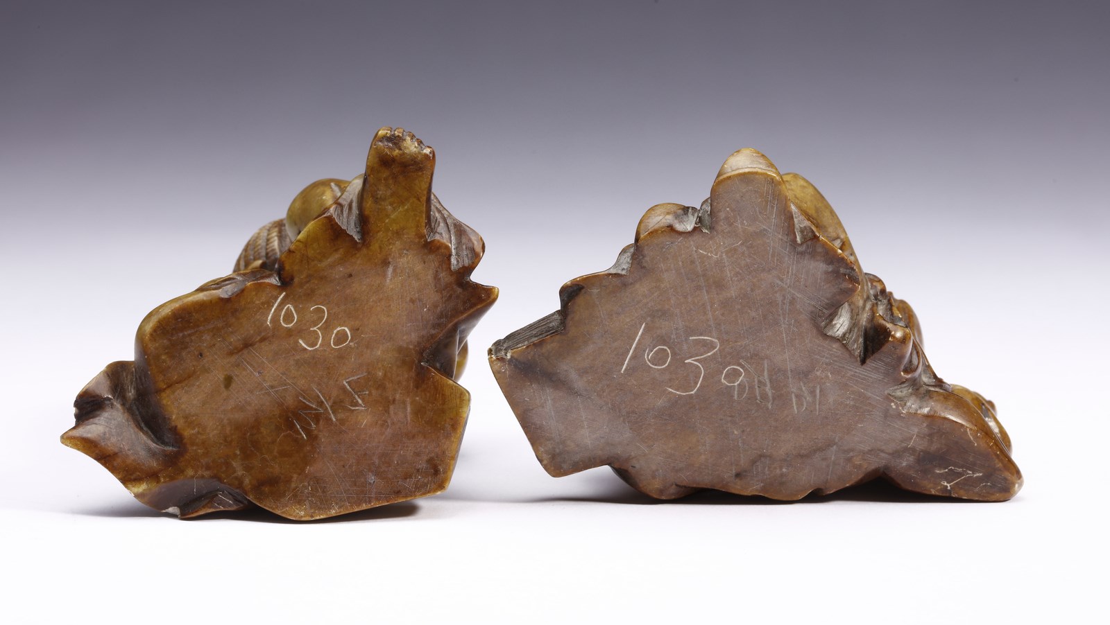 Cina, XIX secolo . . Cm 9,50 x 8,50. Uno raffigurante un anziano con botte, l'altro raffigurante un uomo con una scimmia.