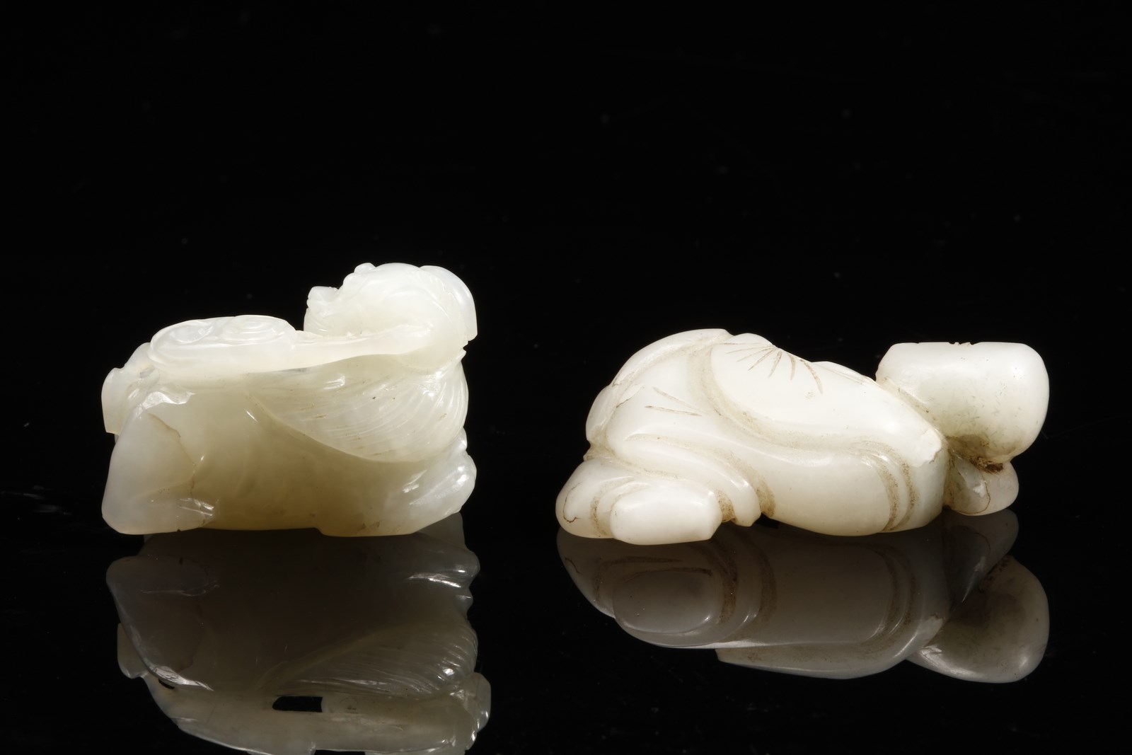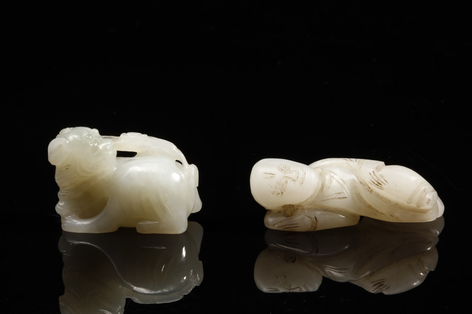 Arte Cinese Due intagli in giada bianca raffiguranti leone e bambino