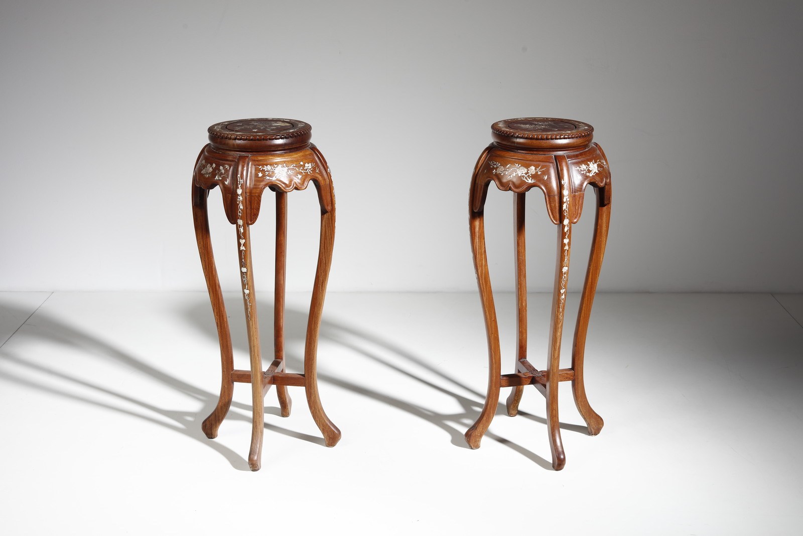 Filippine, XIX secolo . . Cm 40,00 x 92,00. Coppia di alti tavolini in legno duro contraddistinti da gambe arcuate, piano circolare e decorati con delicati intarsi floreali in madreperla.