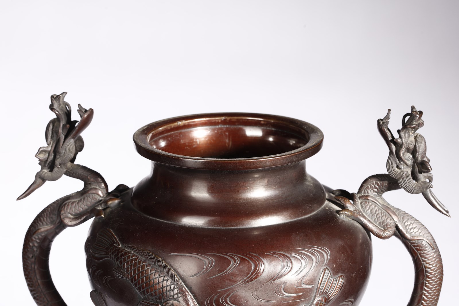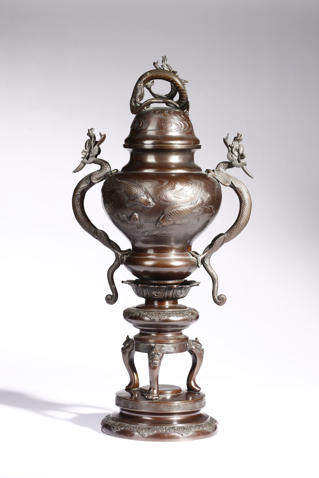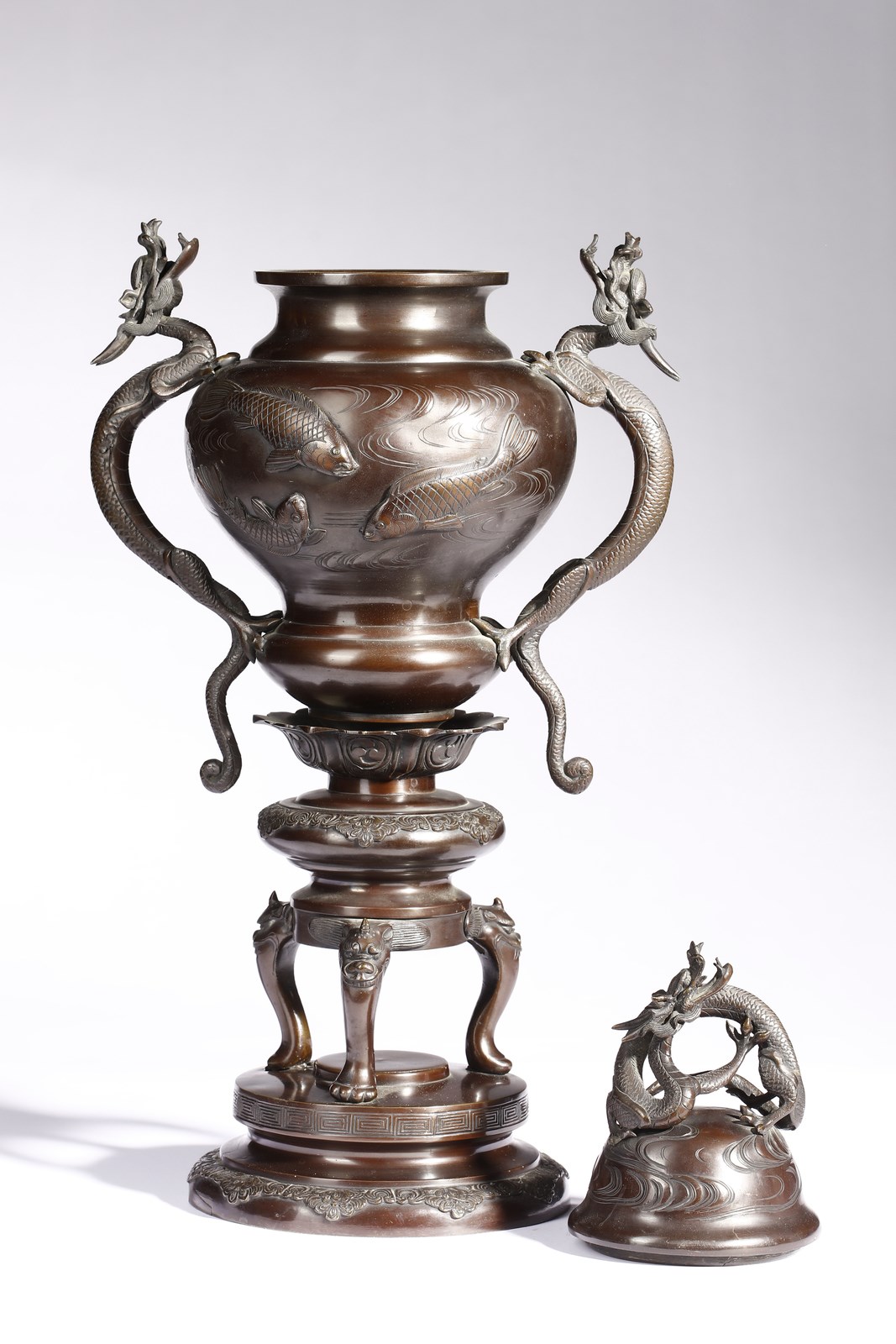 Giappone, XIX secolo. . Cm 23,00 x 67,00 x 33,00. Grande e composita fusione in bronzo a patina bruna, il corpo del contenitore decorato con pesci, i manici e l'impugnatura del coperchio in forma di dragoni e la base poggiante su tripode con protomi leonine.