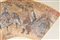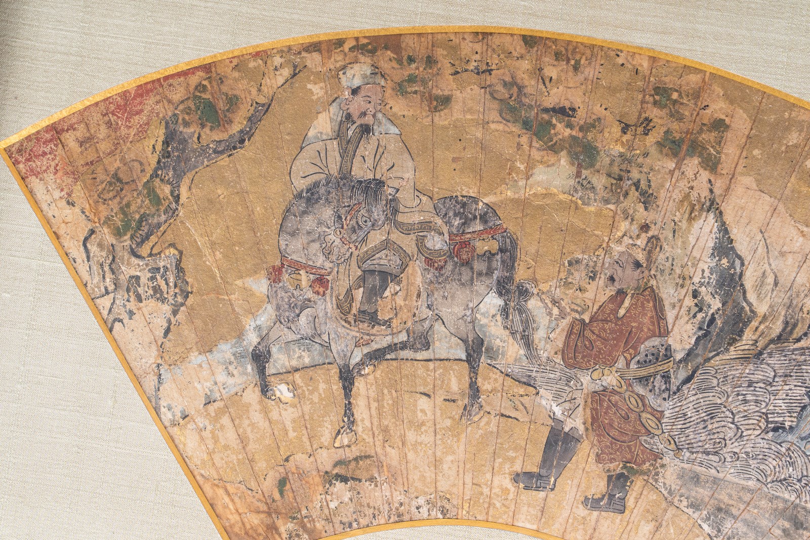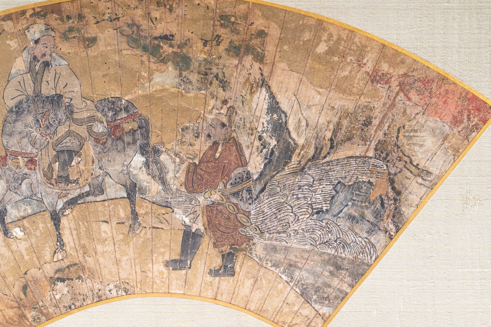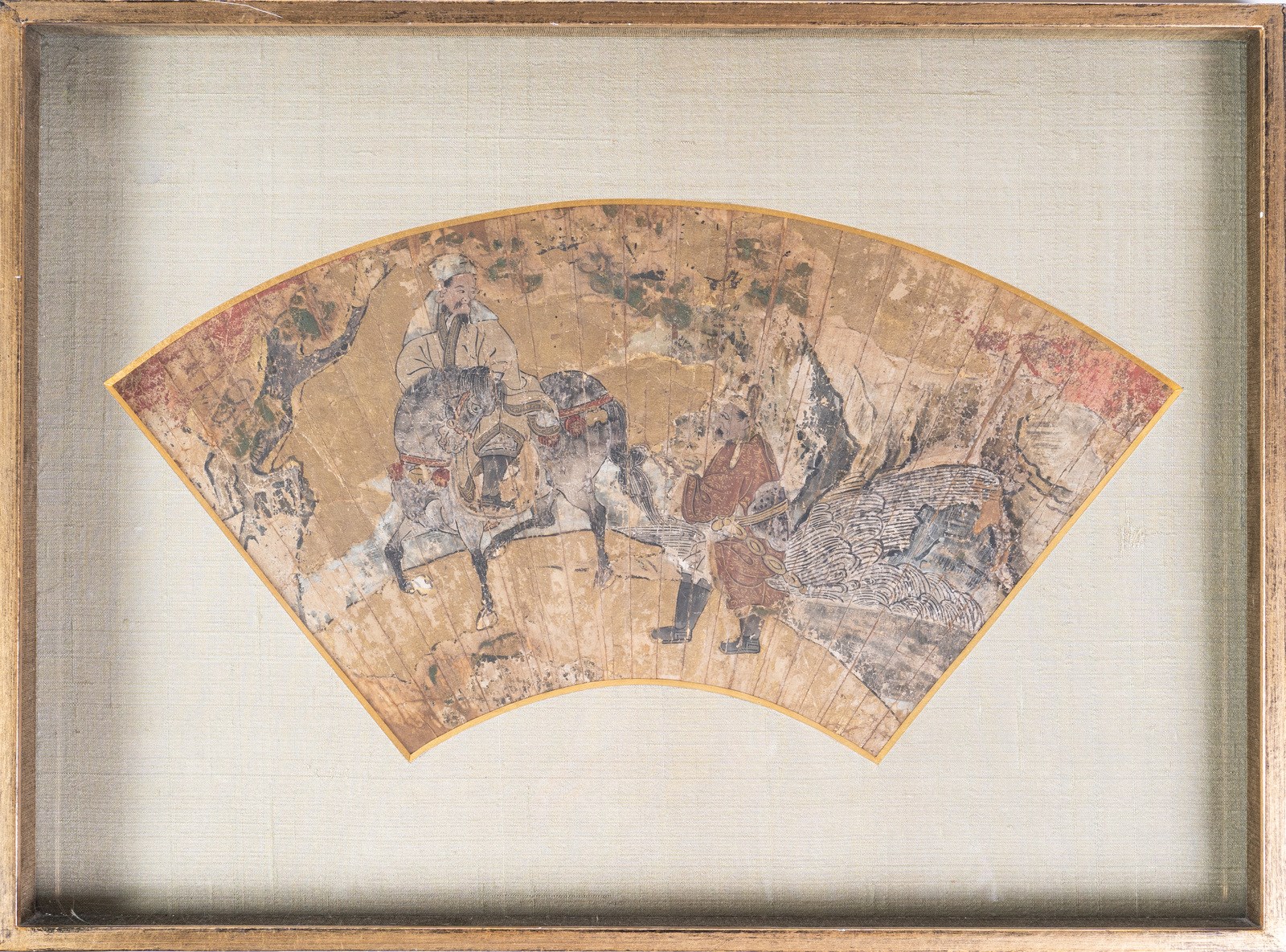 Giappone o Corea, XVIII-XIX secolo. . Cm 39,00 x 19,00. Ventaglio parzialmente dipinto con applicazioni a foglia oro raffigurante due personaggi di cui uno a cavallo.