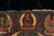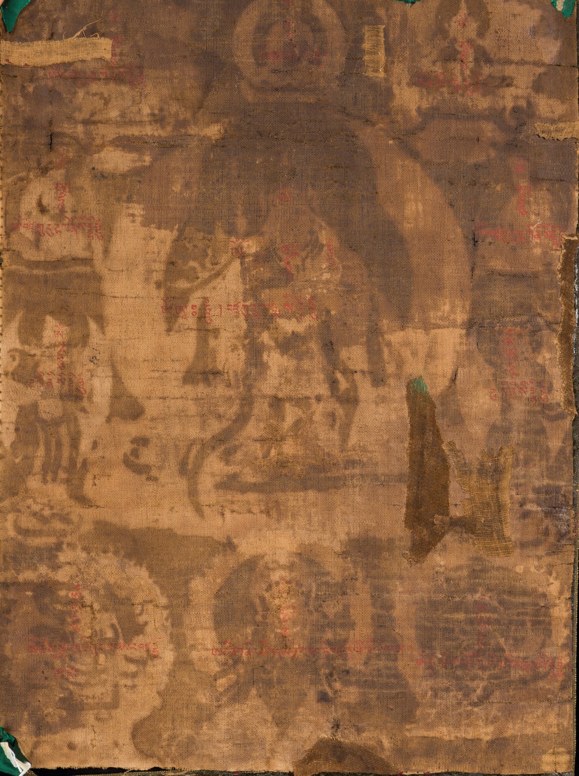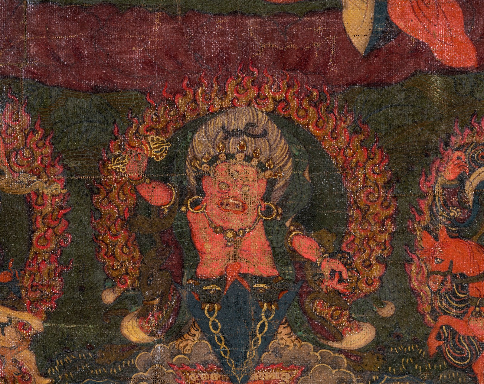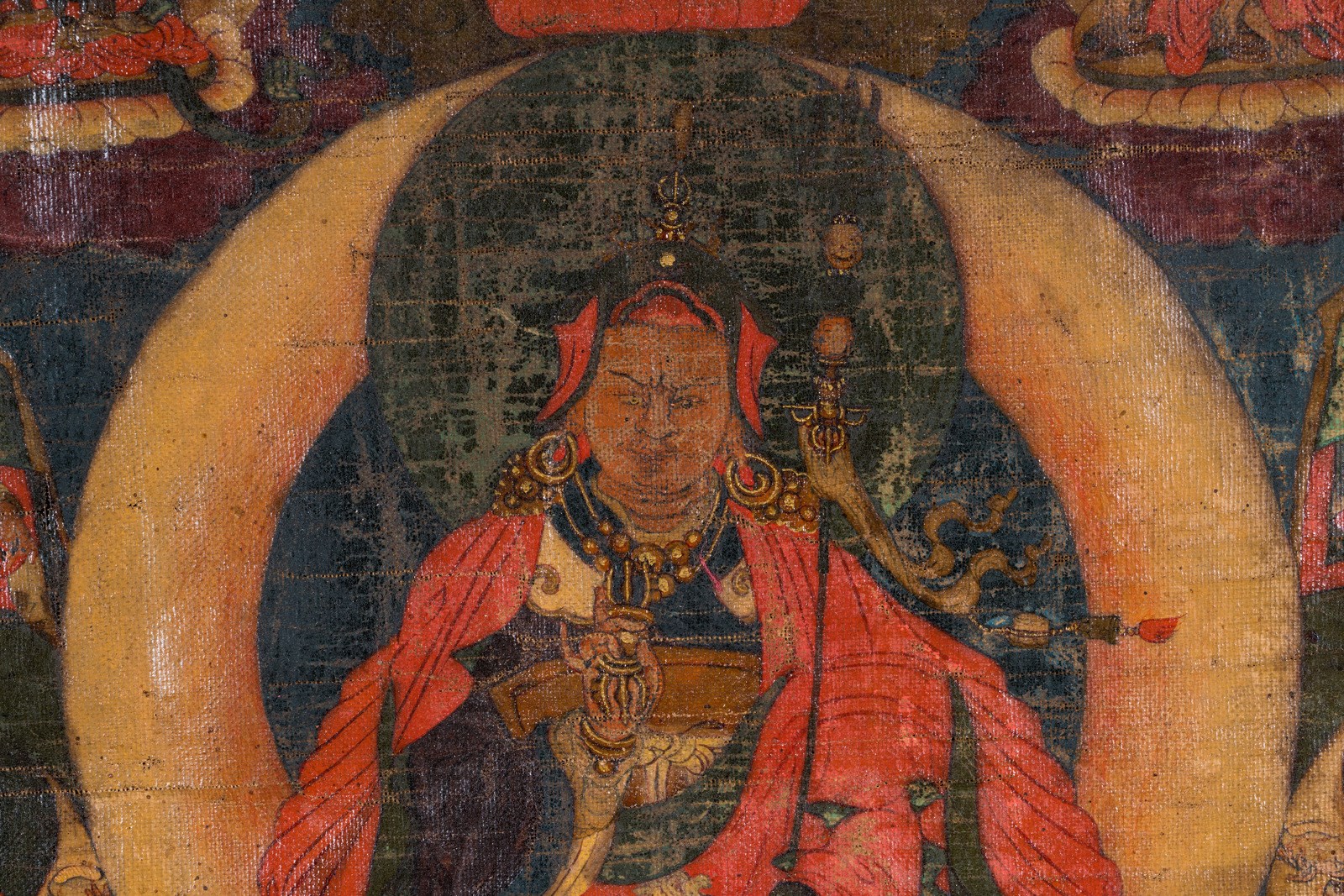 Bhutan, XVIII-XIX secolo. . Cm 37,00 x 51,00. Pittura su tela raffigurante il maestro Padmasambhava, ritratto nella sua più canonica rappresentazione e dalle ampie vesti rosse. Tiene nella mano sinistra una Kapala fumante, nella destra un Vajra. Appoggiata sulla spalla porta la bacchetta Khatvanga, che lo identifica come detentore di poteri magici. Intorno a se sono ritratti ulteriori dieci personaggi tra i quali é possibile distinguere nell’ordine superiore: il Boddhisattva Avalokitesvara ed il Buddha trascendente Amitabha. Nella porzione inferiore della pittura si nota invece la presenza di Palden-Lhamo e di Guru Dragpur dal corpo di Phurbu, una delle manifestazioni irate sempre di Padmasambhava.