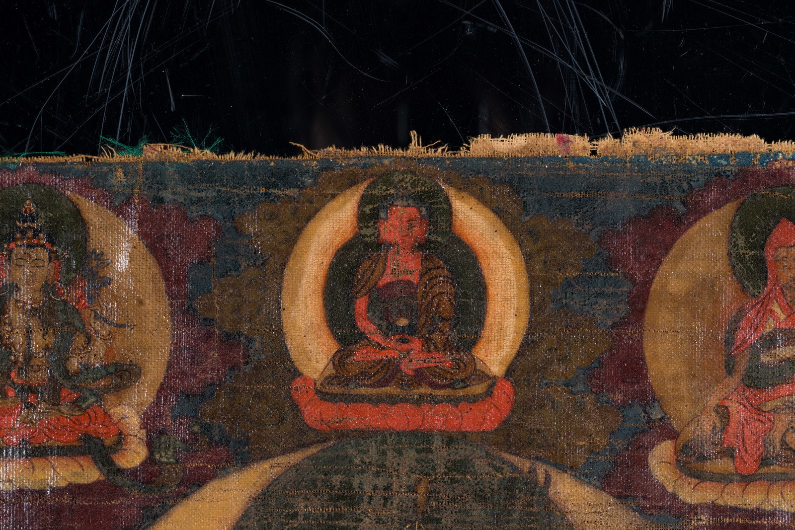 L'abbigliamento dei tre personaggi religiosi ritratti, identifica la thangka come apparente al lignaggio Drukpa.
