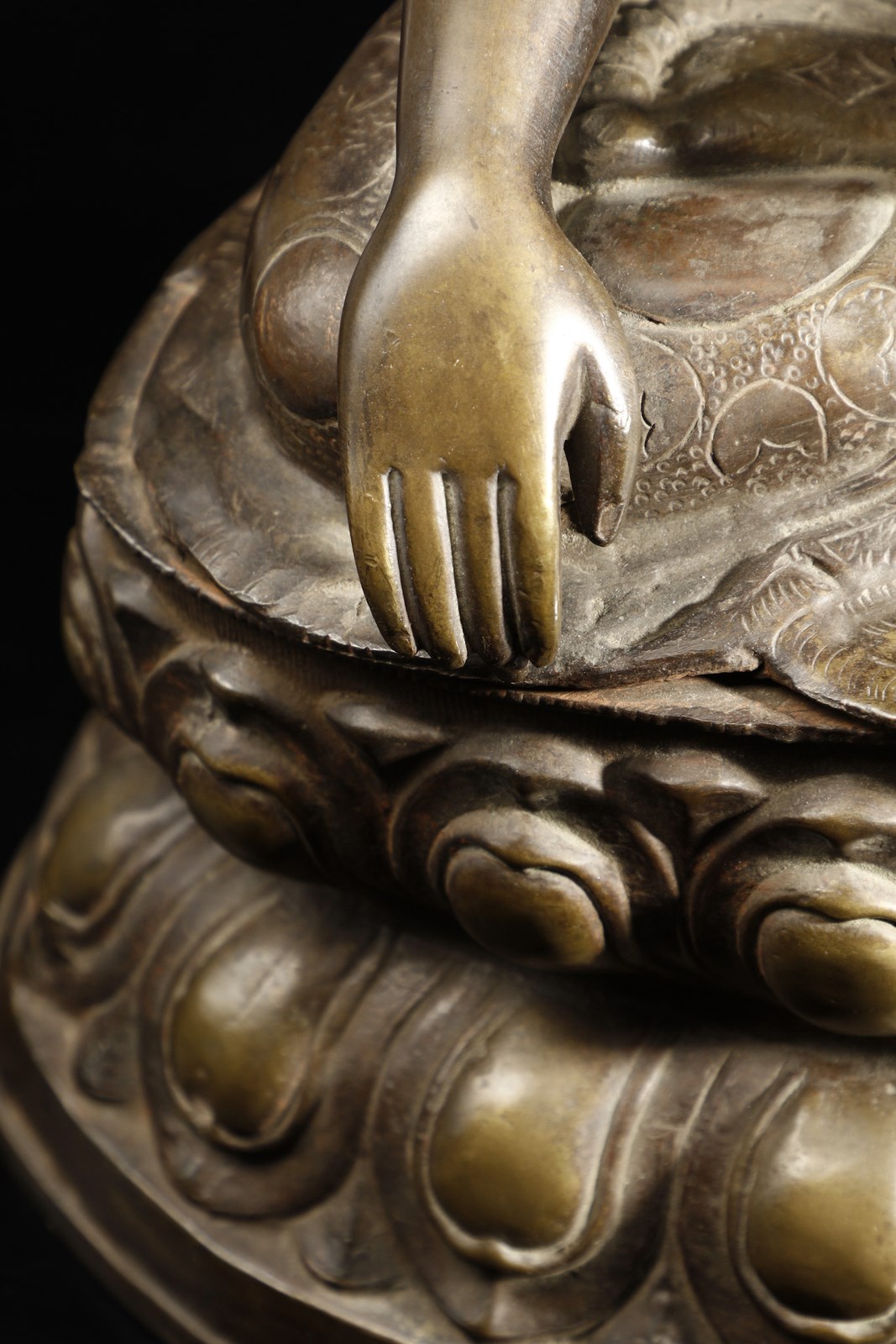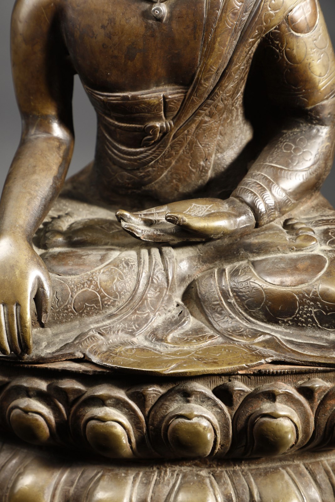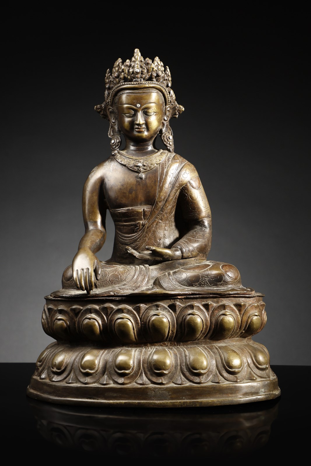 Tibet, inizio XX secolo . . Cm 43,00 x 50,00 x 27,00. In bronzo a patina bruna, raffigurante Buddha Shakyamuni seduto in padmasana su una base a doppio fiore di loto. La sua mano destra in bhumisparsamudra, la sinistra adagiata in grembo. La figura indossa ricche vesti cesellate, vistosa gioielleria e la corona a cinque punte.