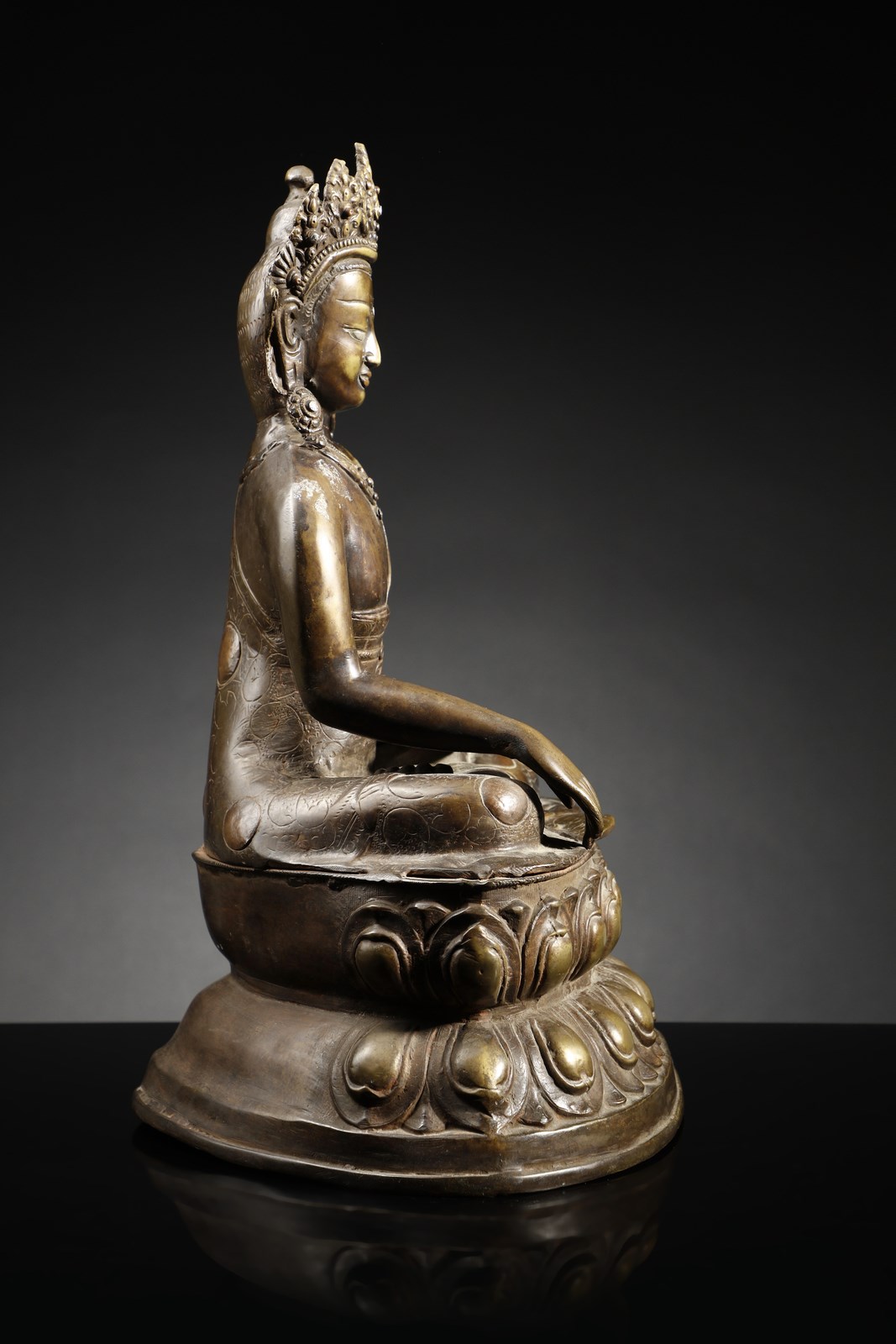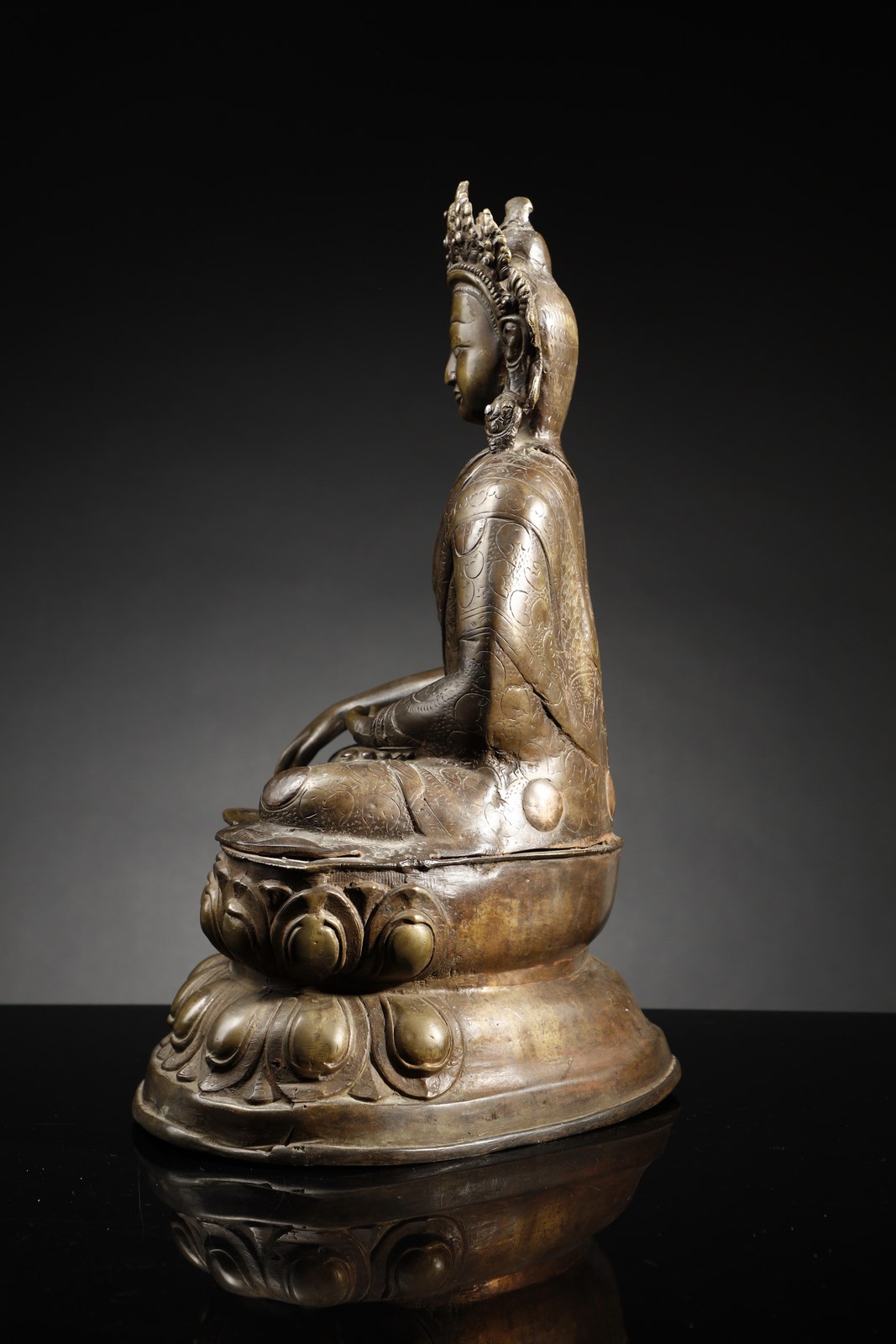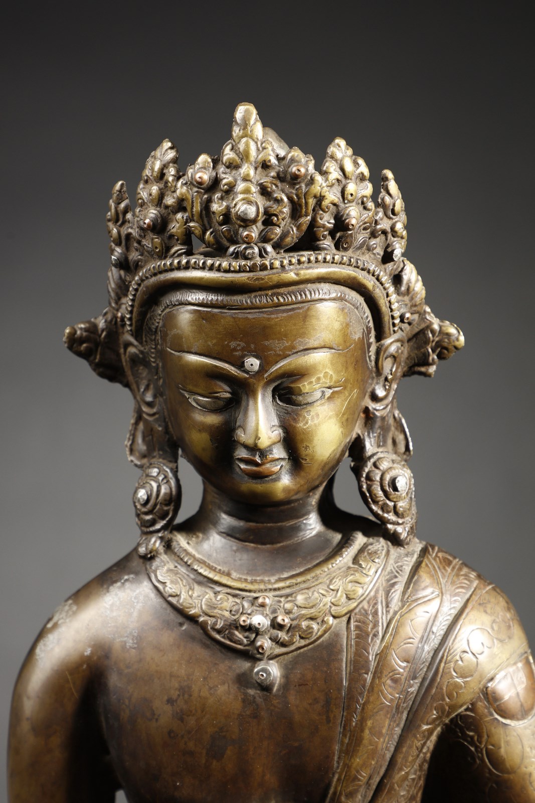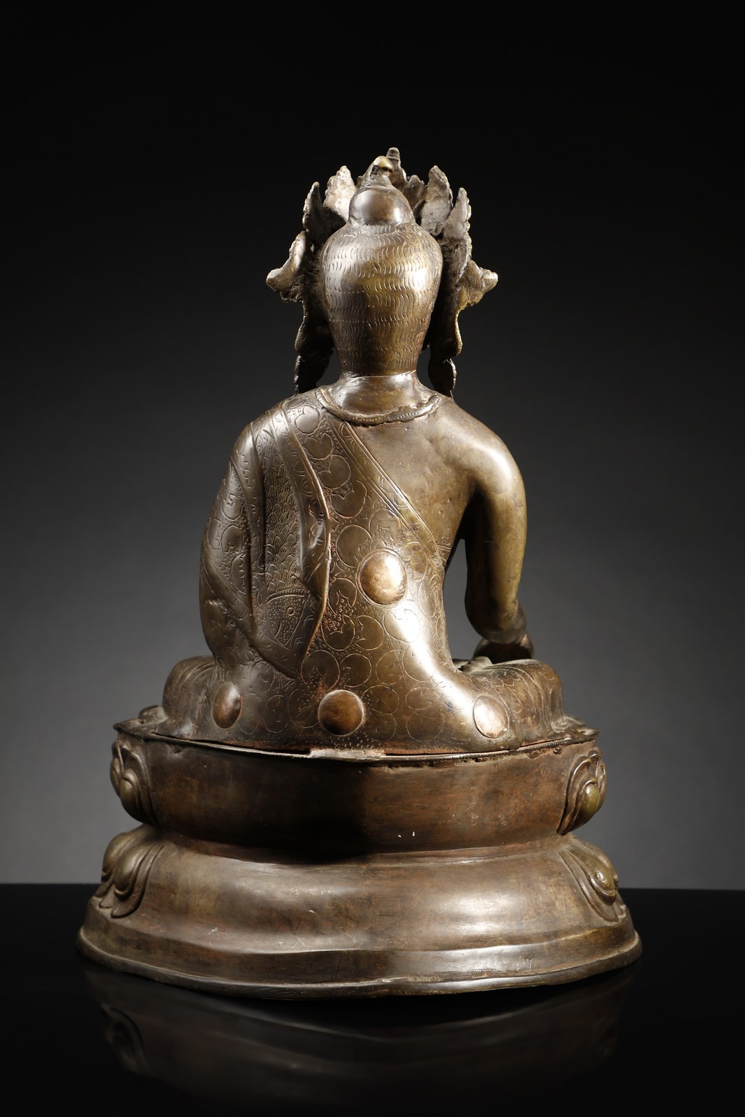 Arte Himalayana - Grande scultura in bronzo raffigurante Buddha coronato Tibet, inizio XX secolo .