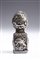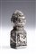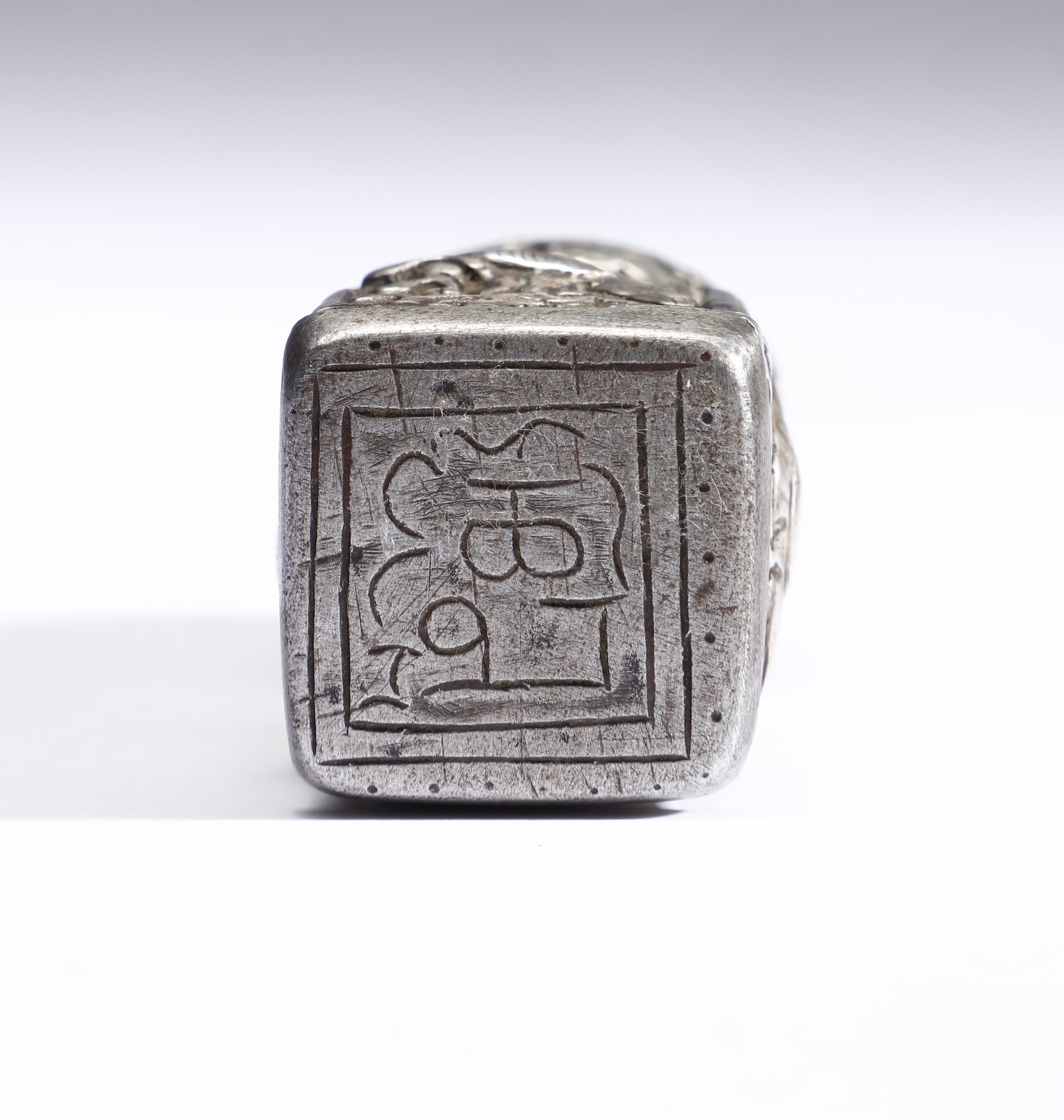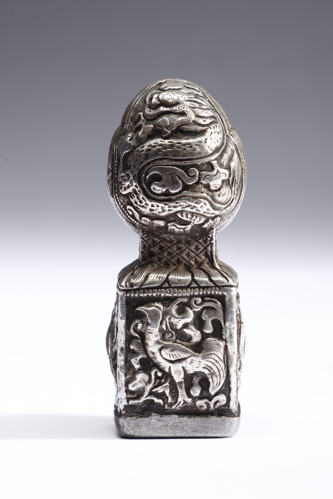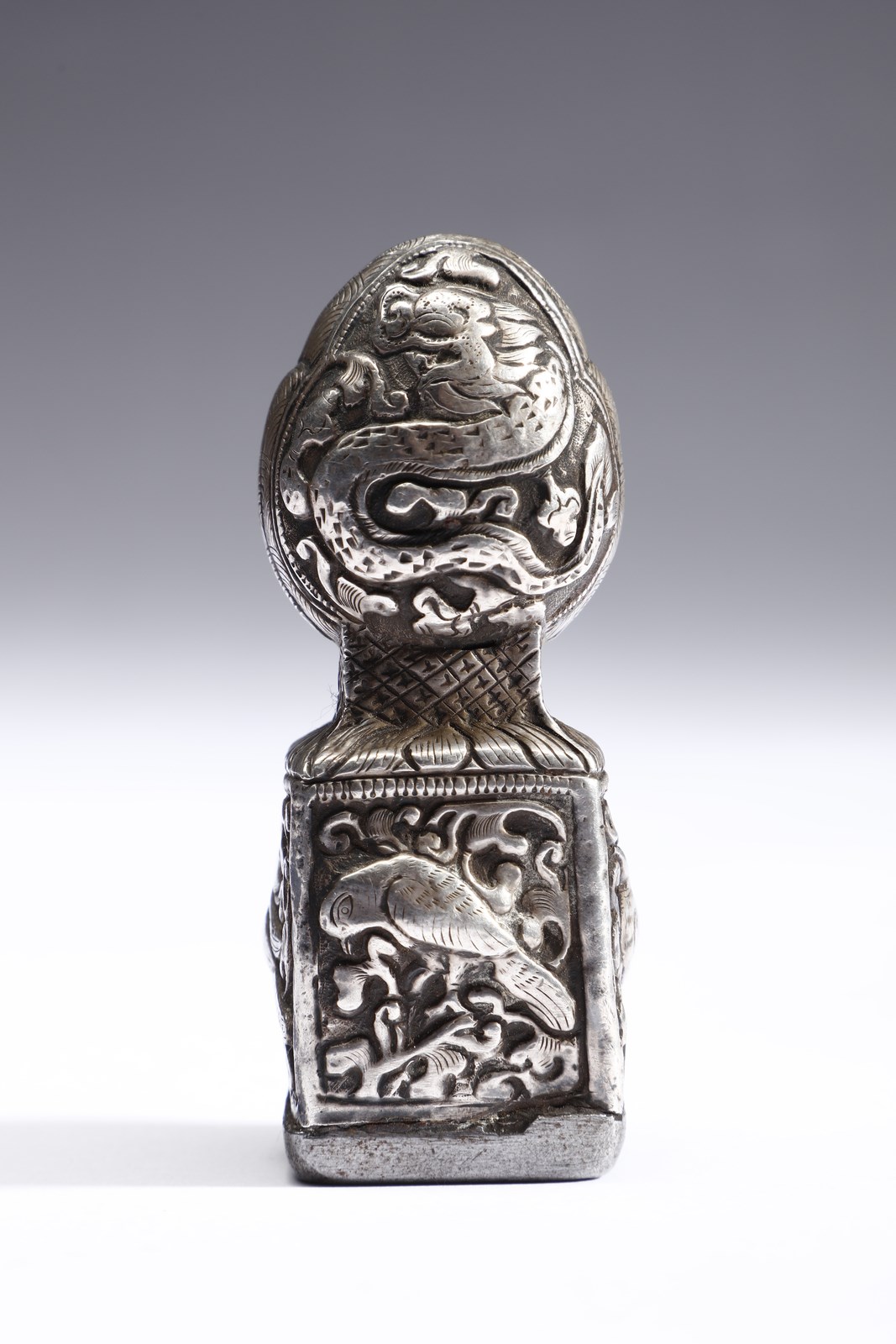 . . Cm 2,70 x 8,40. Grande timbro in argento finemente sbalzato e decorato con uccelli in rilievo sul fusto e draghi sinuosi sul pomello. La porzione sottostante con ideogramma inciso non è probabilmente coeva.