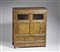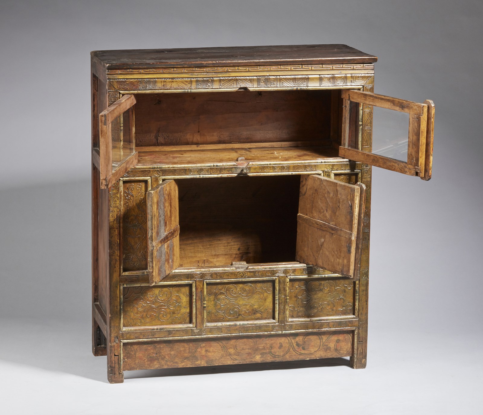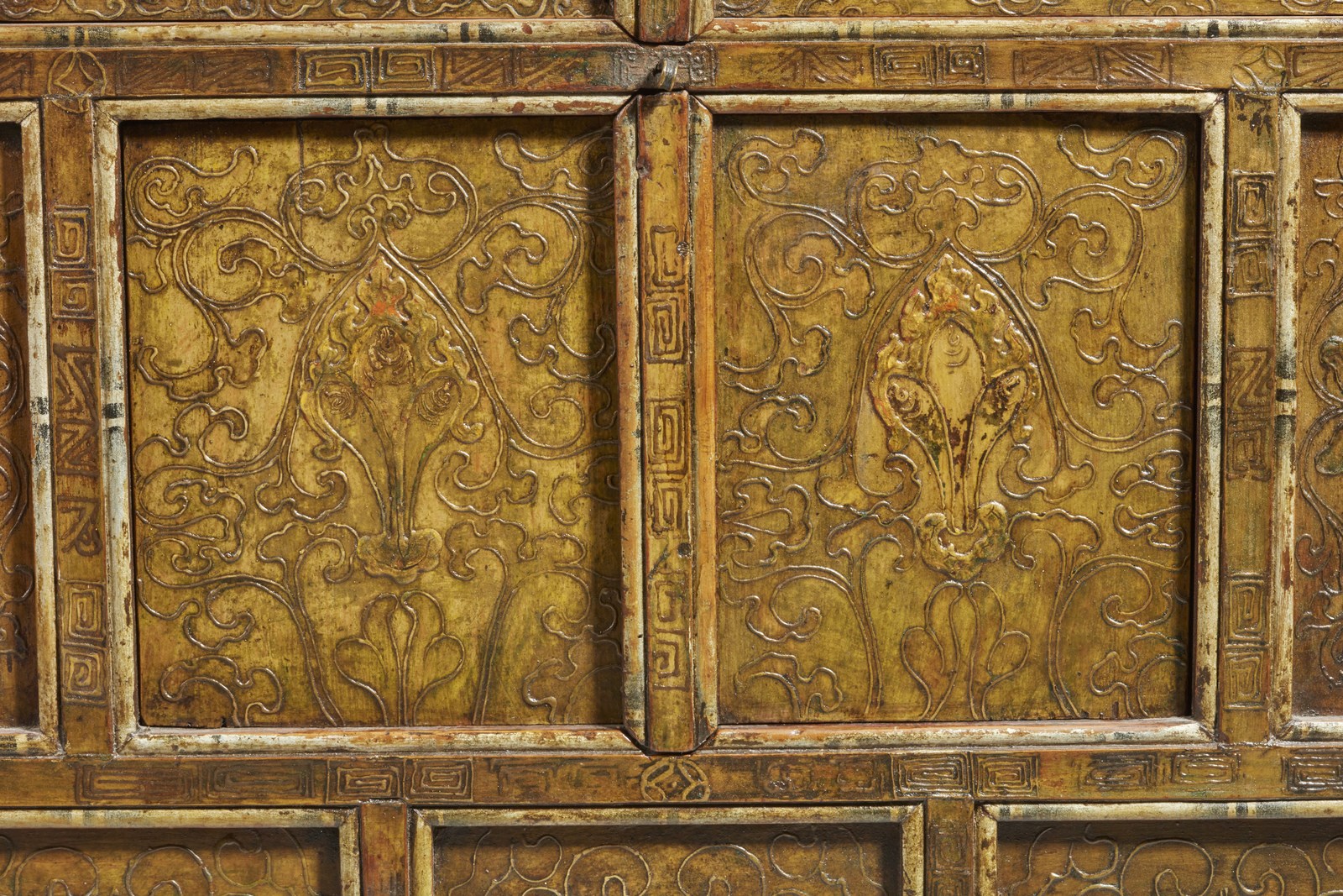 Tibet, XIX-XX secolo. . Cm 73,00 x 86,00 x 33,00. Grande mobile da monastero frontalmente laccato a pigmento dorato e decorato con motivi fitomorfi e rappresentazioni del triplice gioiello a rilievo.
