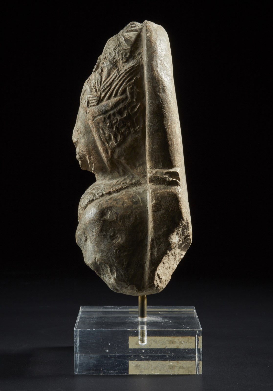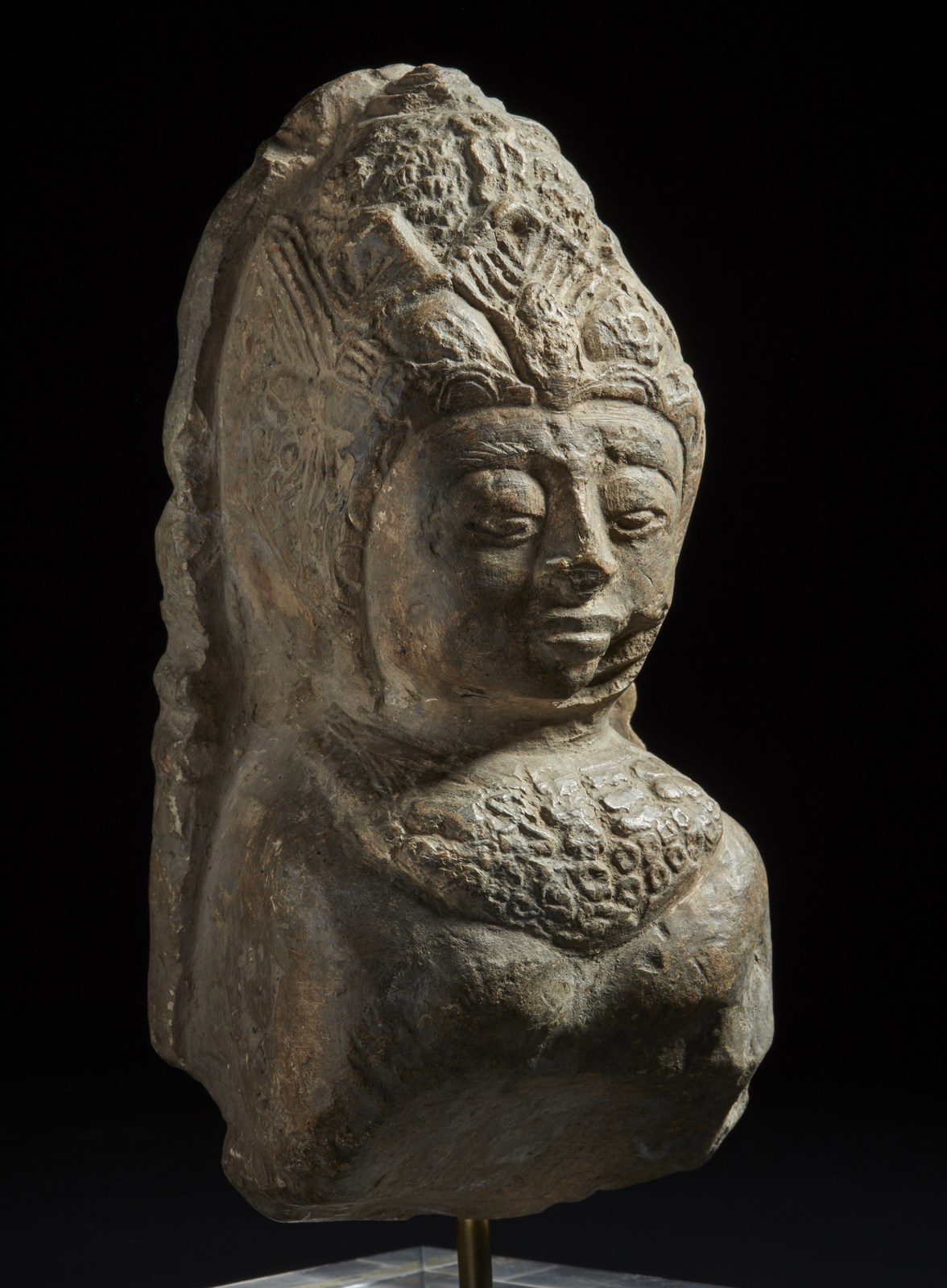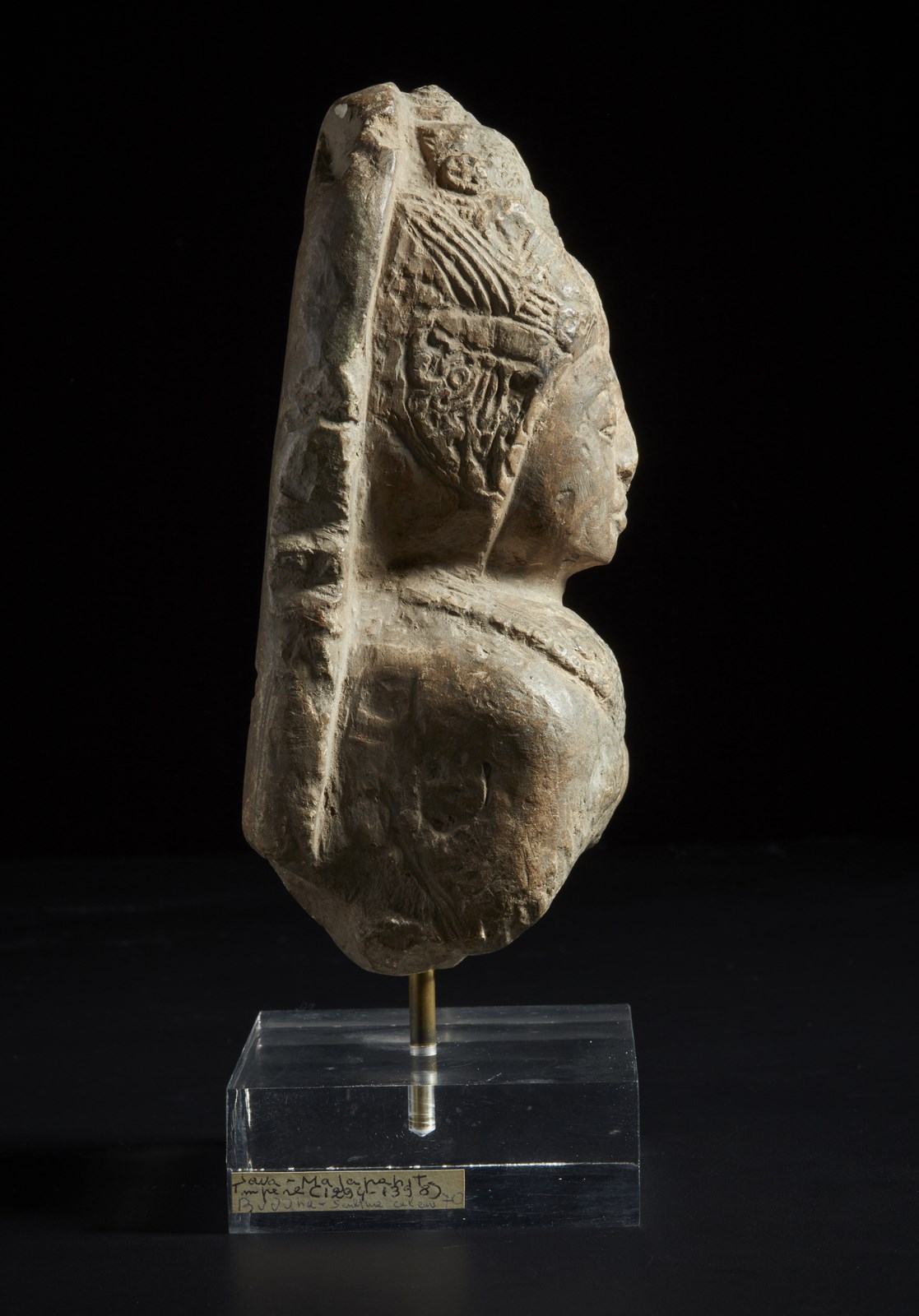 Arte Sud-Est Asiatico - Piccola scultura in pietra raffigurante testa di bodhisattva Indonesia, Giava, periodo Magiapahit, XIV-XV secolo .