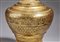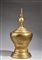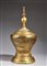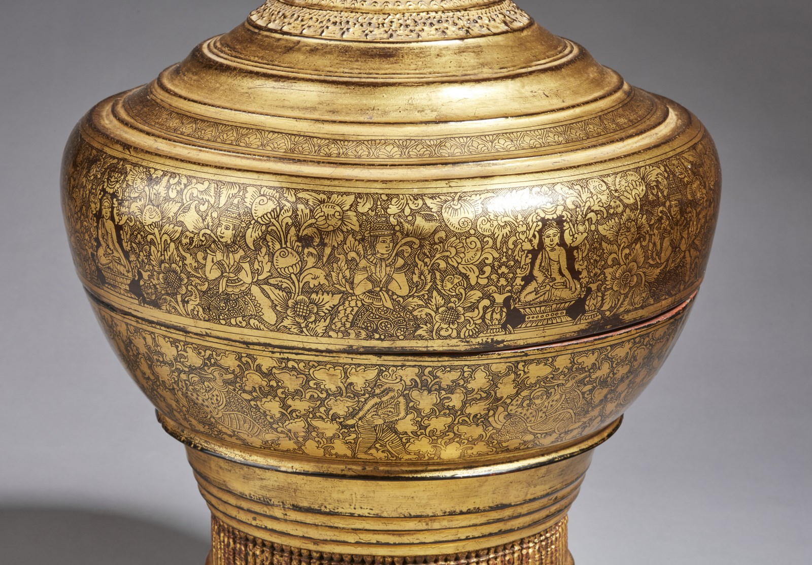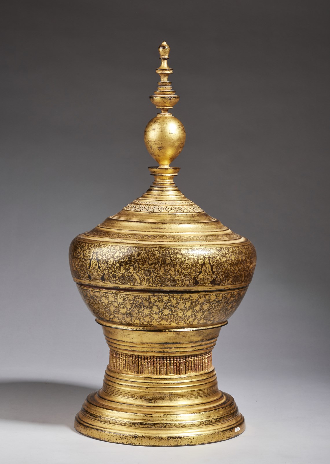 Birmania, XIX-XX secolo. . Cm 40,00 x 80,00. Grande scatola portavivande in forma di pagoda stilizzata, realizzata in lacca nera e completamente laminata a foglia d’oro. Presenti sulla superficie fitti decori floreali e rappresentazioni del Buddha storico affiancato da oranti.