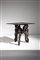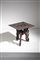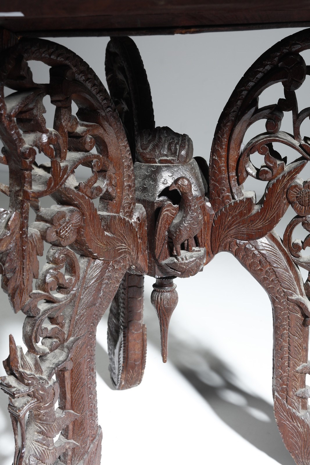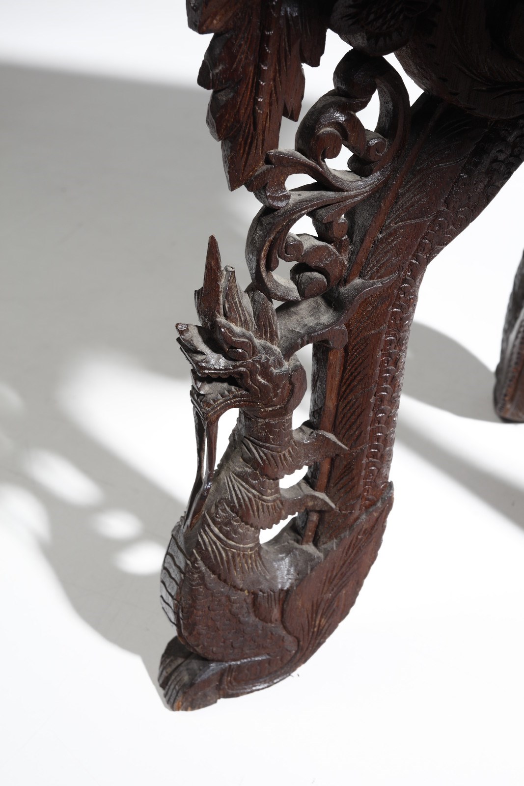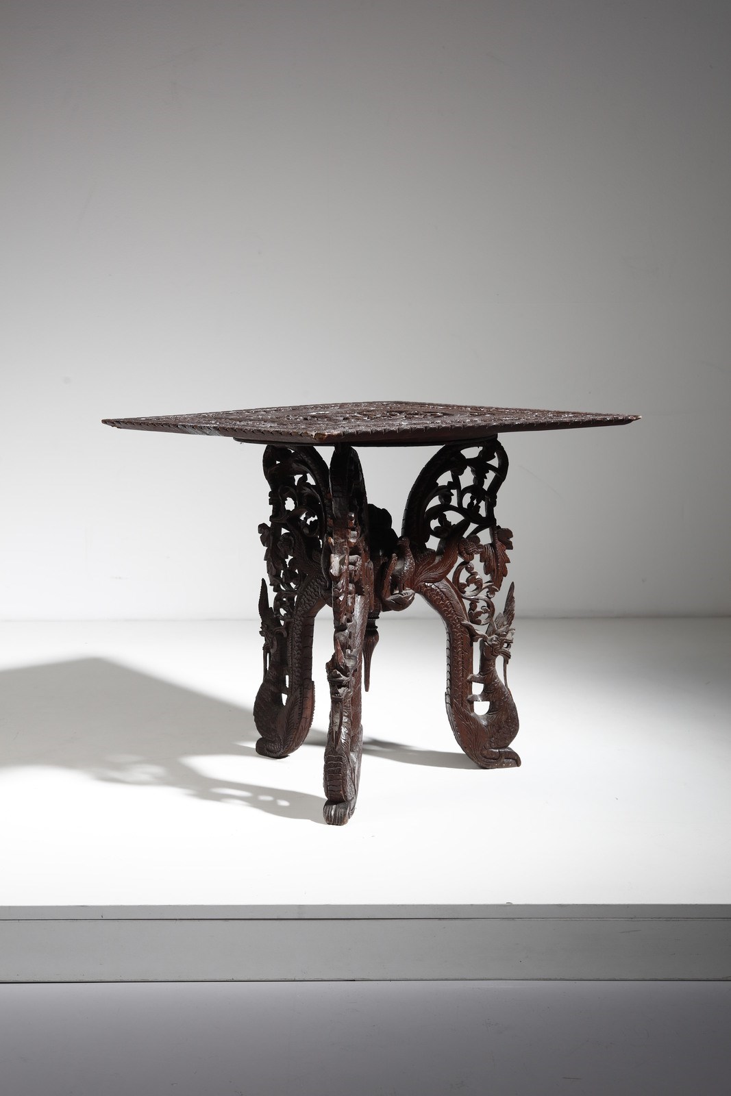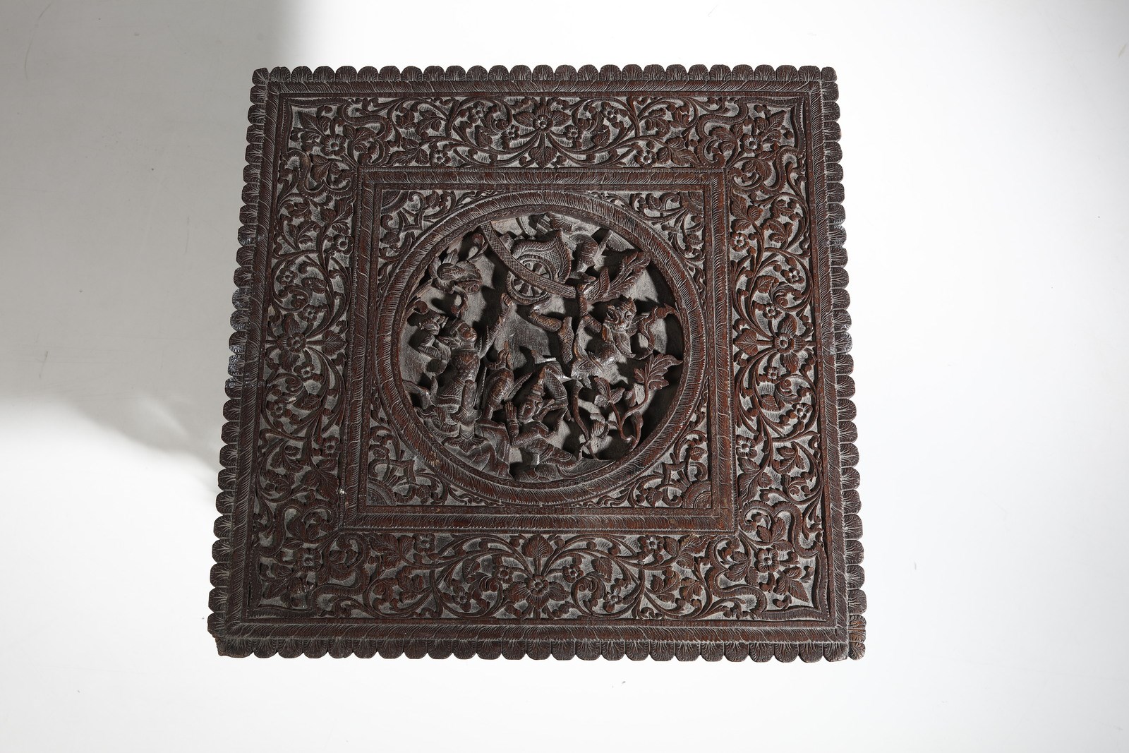 Bali, XX secolo . . Cm 61,00 x 60,00 x 61,00. In legno a patina scura, poggiante su quattro gambe intagliate con elementi vegetali ed uccelli, il piano intagliato con figure e tralci floreali.