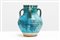 Iran, XII-XIII secolo . . Cm 16,50 x 21,50. Vaso triansato con spalla dritta e collo cilindrico leggermente everso terminante con orlo lavorato con cerchi traforati alternati a bottoni di coronamento. Il corpo è ricoperto di vetrina turchese che ha sviluppato una forte iridescenza con il tempo.