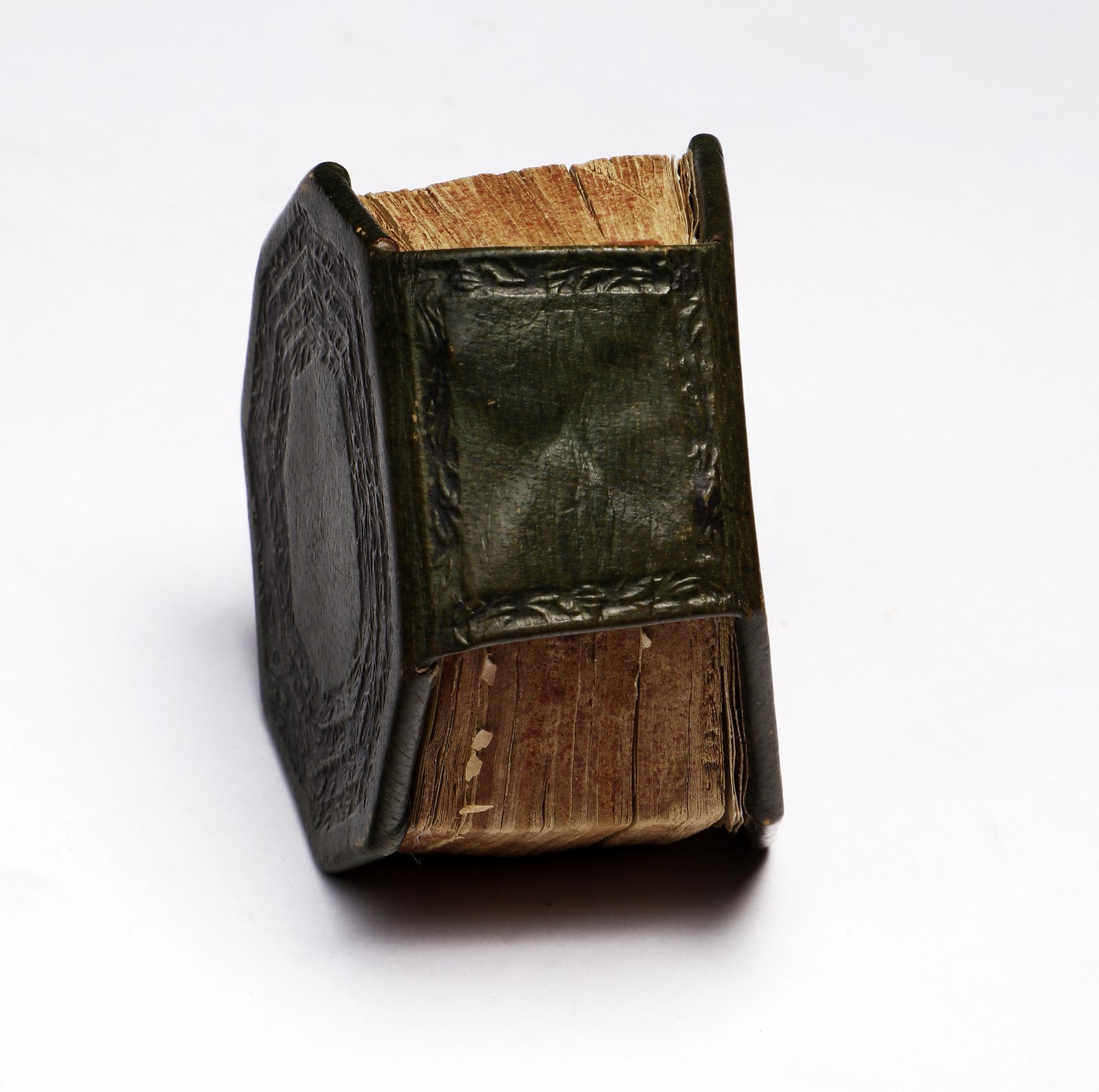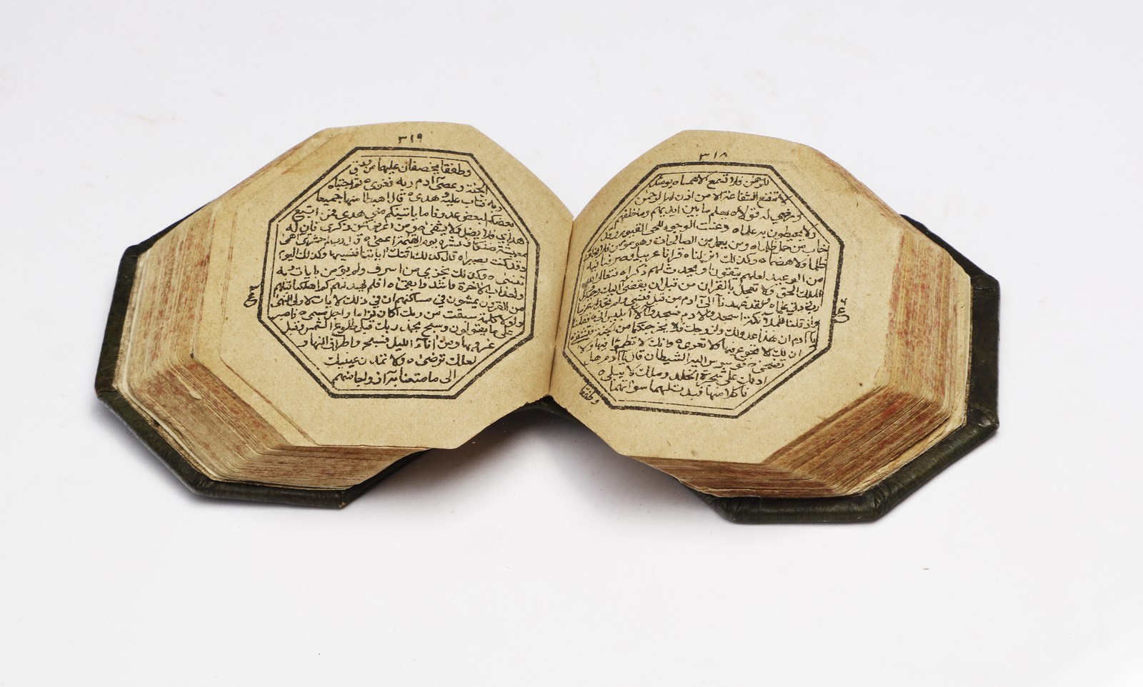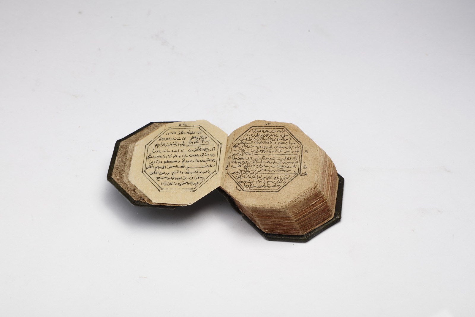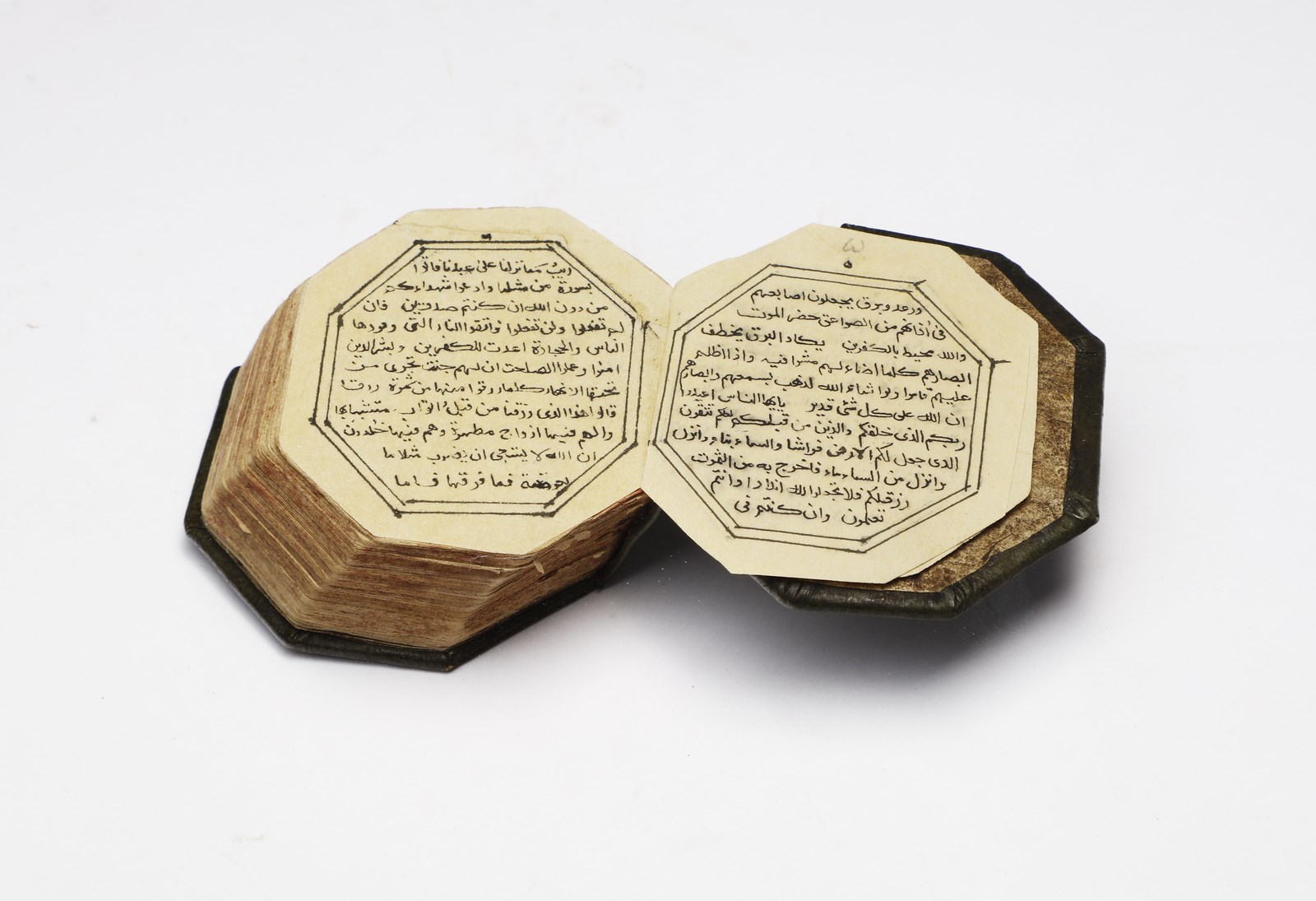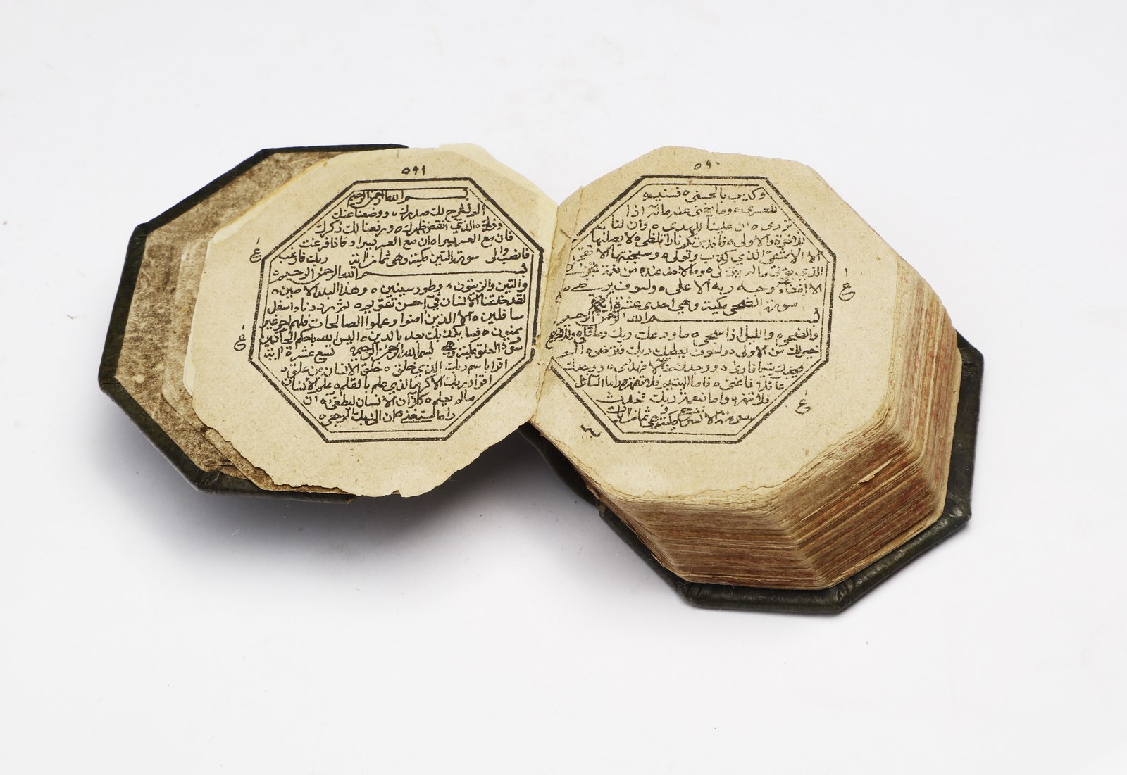 Vicino Oriente, XIX secolo . . Cm 6,00 x 3,00. Testo in arabo su carta, vergato in calligrafia naskh ed arrangiato su 15 linee entro specchio di scrittura anch'esso ottagonale. Illuminazione mancante, reclamantes e pagine numerate in alto. Rilegatura senza ribalta ricoperta in pelle verde.