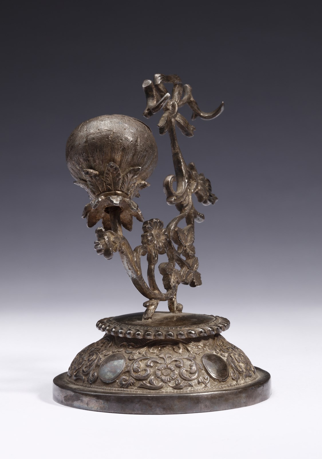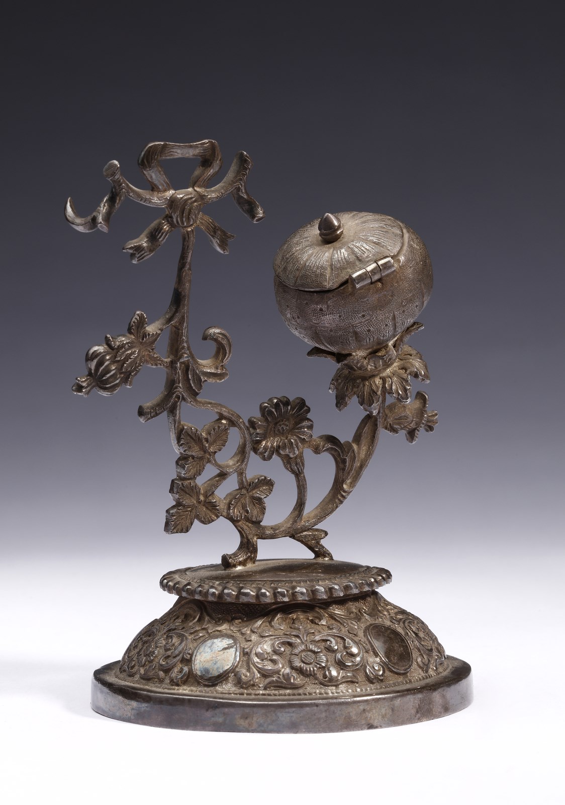 India, seconda metà XIX secolo . . Cm 8,50 x 13,40. Delicato contenitore di essenze in forma vegetale con coperchio, montato come terminale di ramo fiorito, poggiante su base circolare sbalzata con fitti tralci vegetali intrecciati.