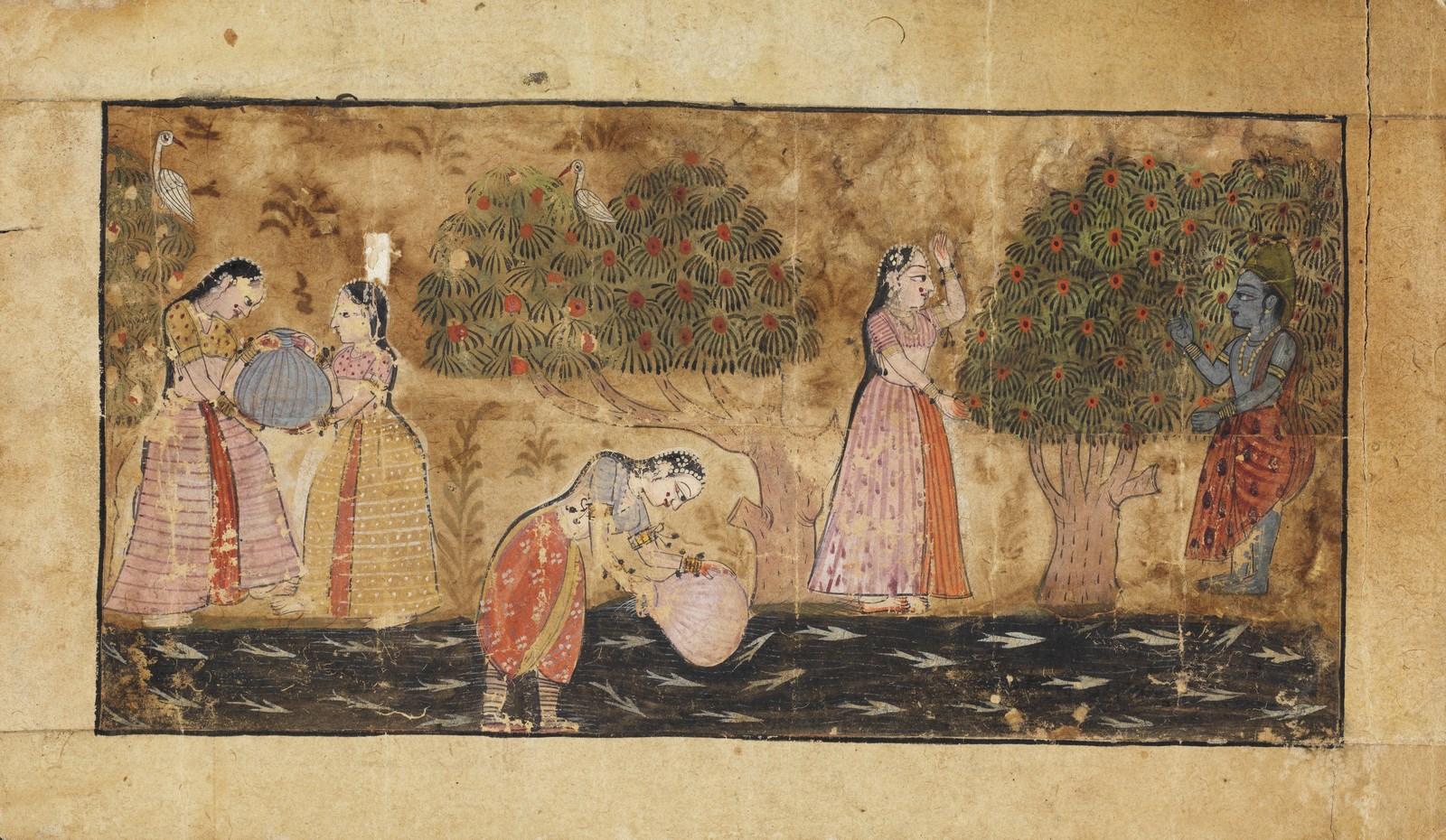 India, XIX secolo (?). . Cm 21,00 x 12,50. Piccola miniatura rettangolare in stile arcaico, raffigurante quattro donne intente a raccogliere l'acqua del fiume con delle grandi anfore. Una di loro è in colloquio con una divinità tra gli alberi.