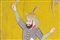Pigmenti e oro su carta . . Cm 19,30 x 27,50. Su uno sfondo monocromo verde acceso con un accenno a colline lontane, si stagliano le silhouettes di un guerriero con elmo, stendardo e spada sguainata, ed il suo cavallo tenuto per le briglie dallo stalliere. Il cielo è al tramonto.