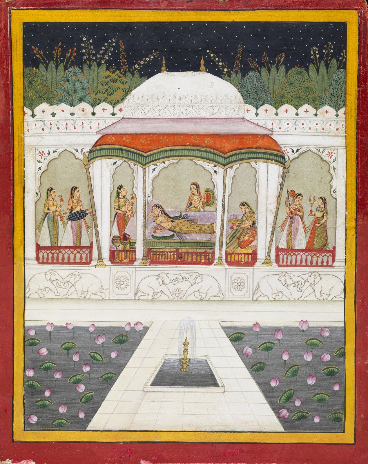 Pigmenti e oro su carta . . Cm 24,50 x 31,50. Grande miniatura notturna nello stile di Kotah, raffigurante una principessa con ancelle passare il tempo all'interno del padiglione esterno di un palazzo in marmo bianco. Davanti all'edificio la porzione terminale di un giardino quadripartito con fontana centrale e fiori di loto nelle vasche.