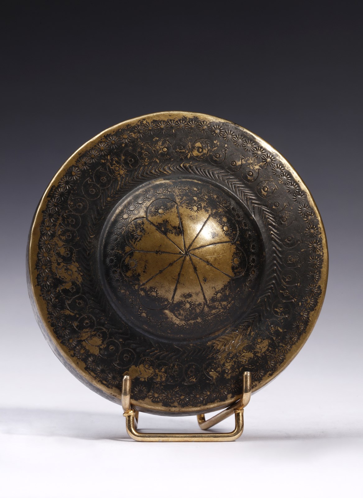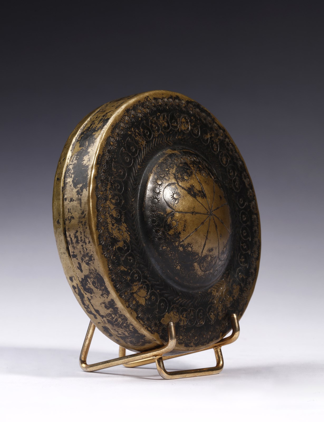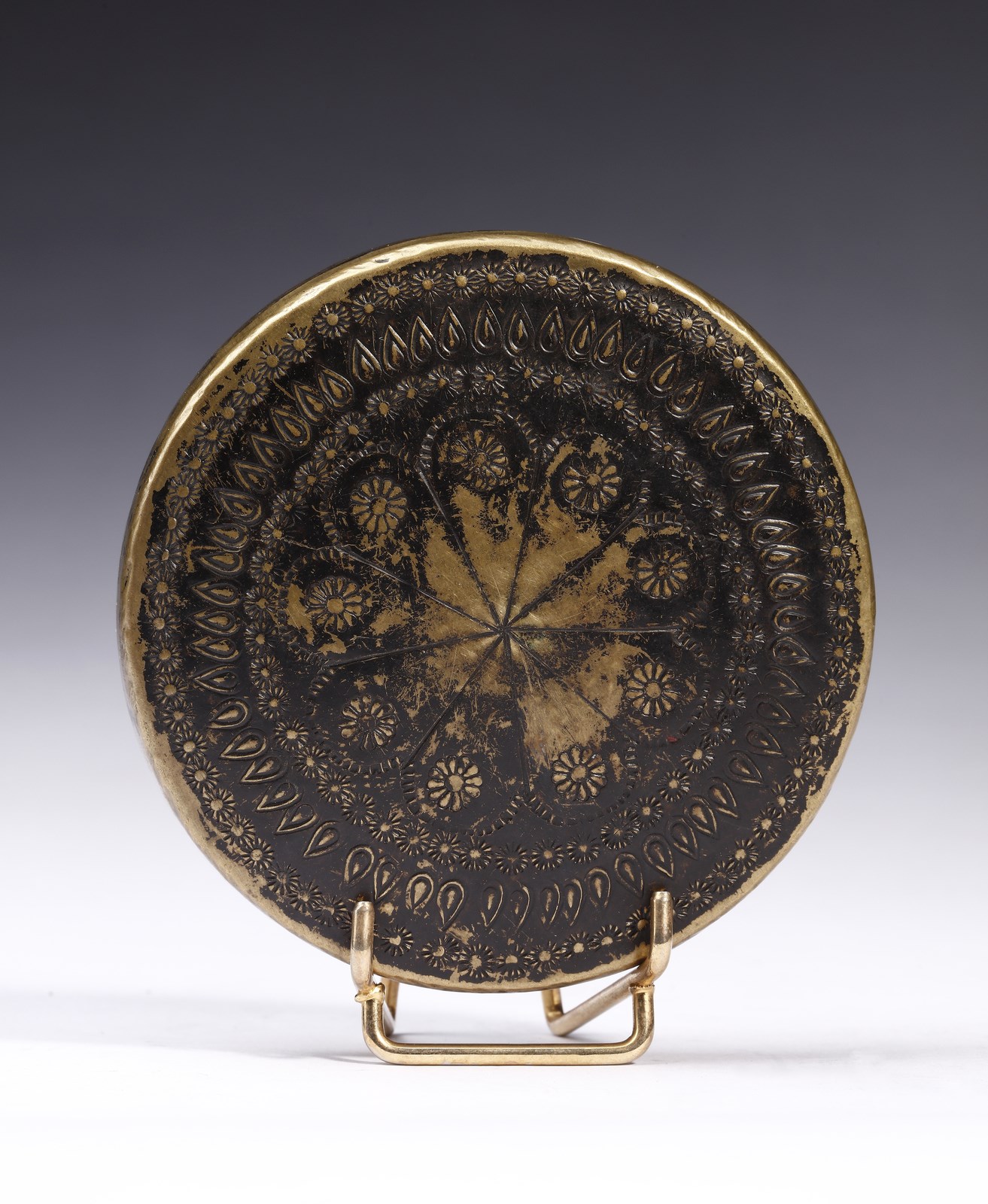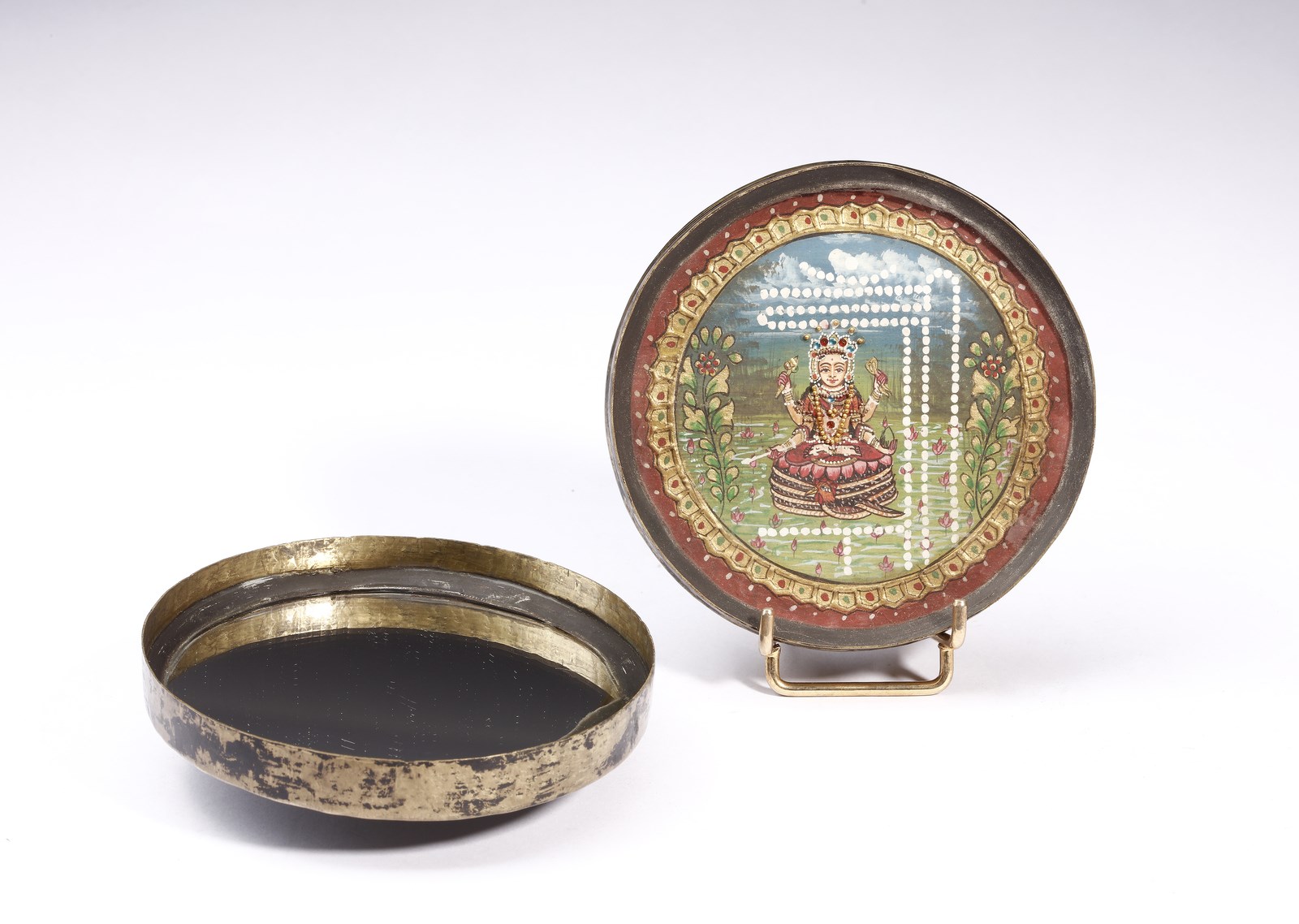 India, XIX secolo. . Cm 10,50 x 4,50. Santuario da viaggio Jainista in forma di scatola circolare realizzato in bronzo e decorato esternamente a motivi geometrici concentrici. Al suo interno sui lati dischiusi sono presenti uno specchio ed una miniatura raffigurante la dea Padmavati, la quale, seduta su di un serpente dalla testa di gallo e dotata di quattro braccia, presenta una ricca veste abbellita da gioielli in vetro.