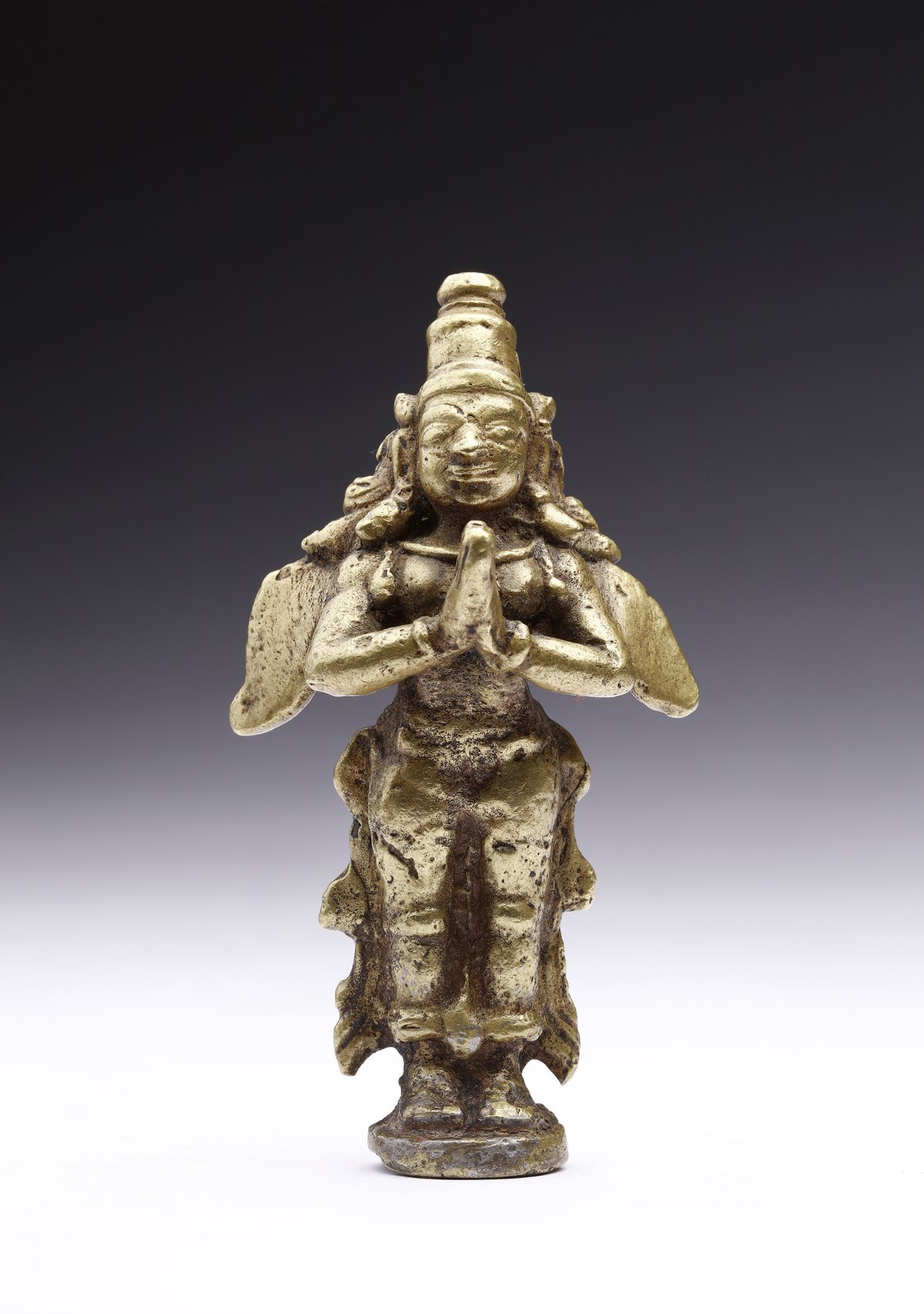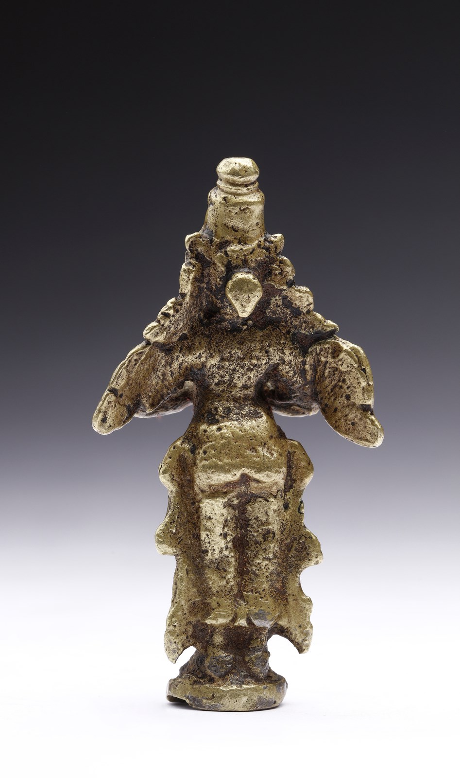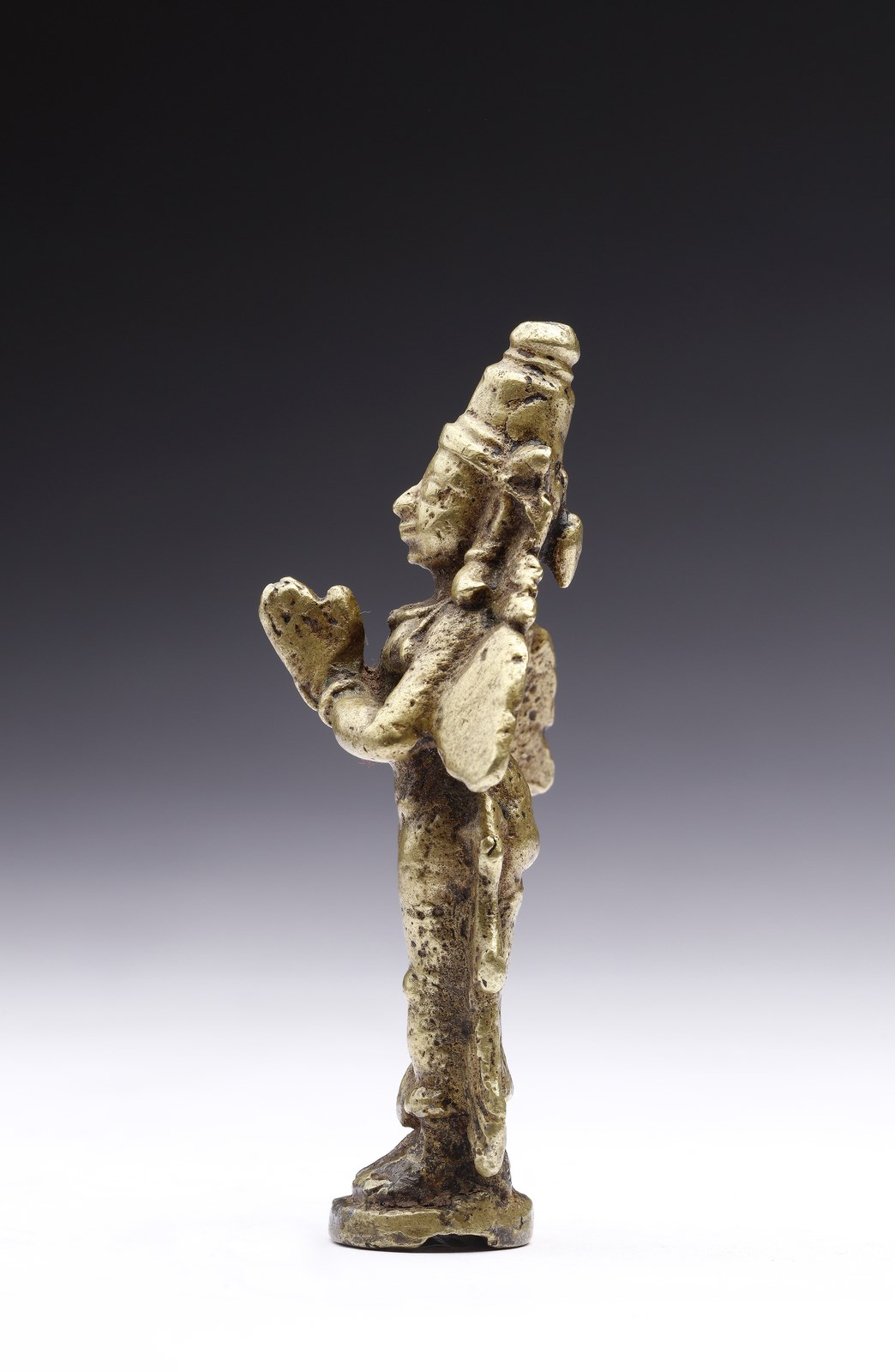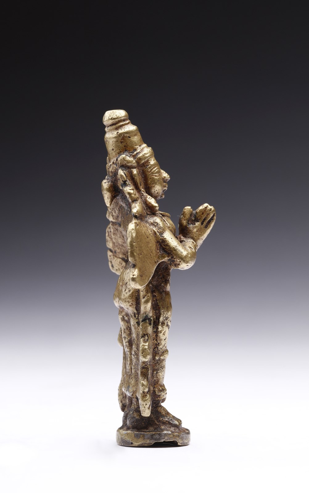 India, XVII-XVIII secolo. . Cm 4,70 x 9,00. Piccola raffigurazione in ottone della divinità alata Garuda, qui ritratto nella sua forma antropomorfa e a mani.giunte.