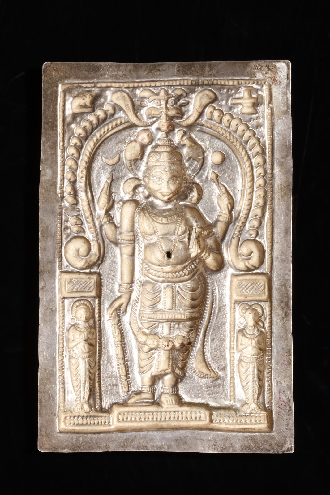 India del sud, XIX secolo. . Cm 10,50 x 16,00. Placca devozionale in argento sbalzato raffigurante Virabhadra, manifestazione irata del dio Shiva. La figura centrale é ritratta in postura stante con quattro arti ciascuno dei quali brandisce nelle rispettive mani, armi: due frecce, uno scudo e una spada. Ad affiancarlo sono presenti due figure, a destra il suocero dalla testa di ariete Daksa e a sinistra la consorte Sati.