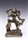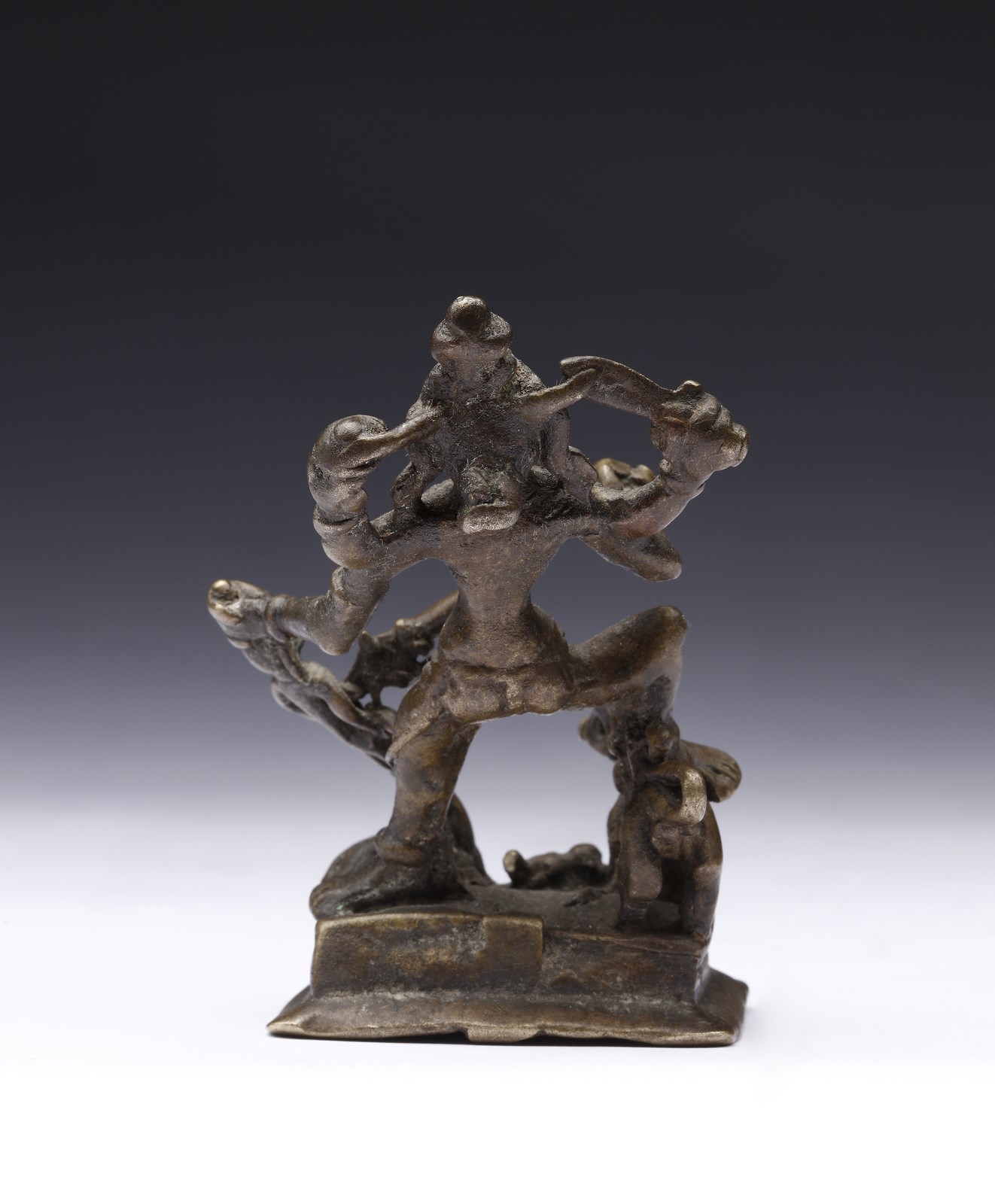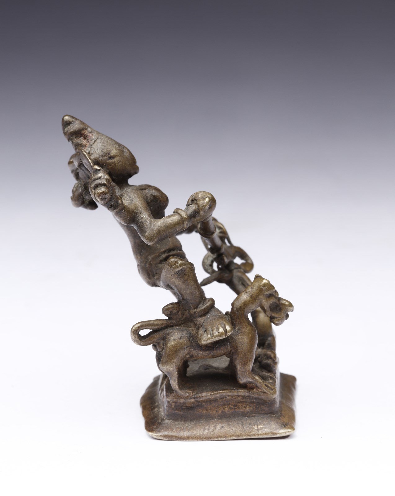 India, XVIII-XIX secolo. . Cm 4,50 x 9,50. Bronzo devozione raffigurante la dea guerriera Durga. É qui ritratta nell’atto di uccidere il demone Maishasura. Per questo motivo questa particolare rappresentazione prende il nome di Maishasuramardini. La dea é qui dotata di quattro braccia ognuna delle cui mani é fornita di armi e sovrasta al contempo la sua cavalcatura felina.