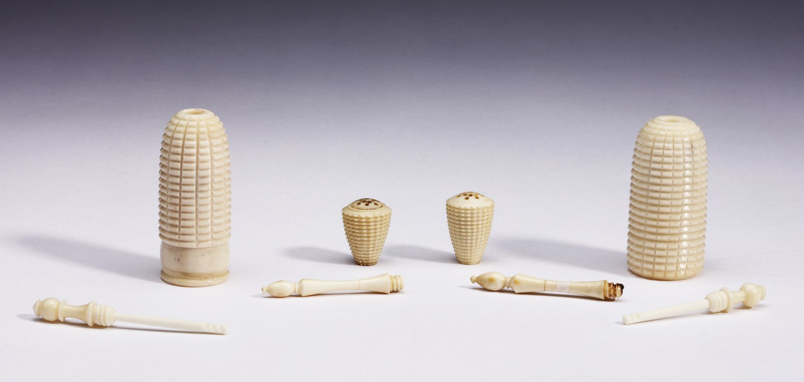 India, XIX secolo . . Cm 6,30. Due coppie di piccoli contenitori con decorazione godronata: una coppia in forma di piccoli aspersori scomponibili con finale traforato ed una coppia di piccole bottiglie con tappo.