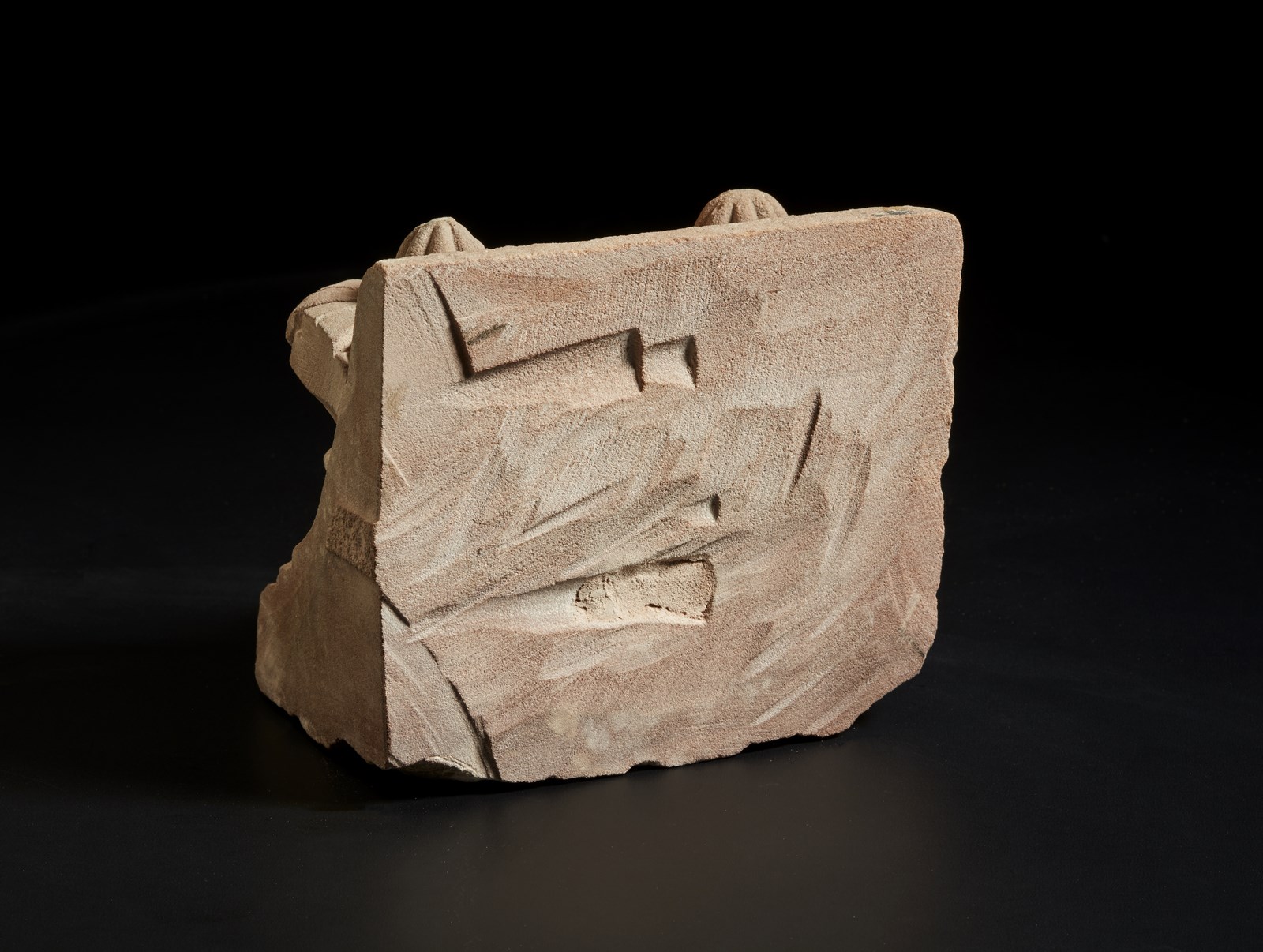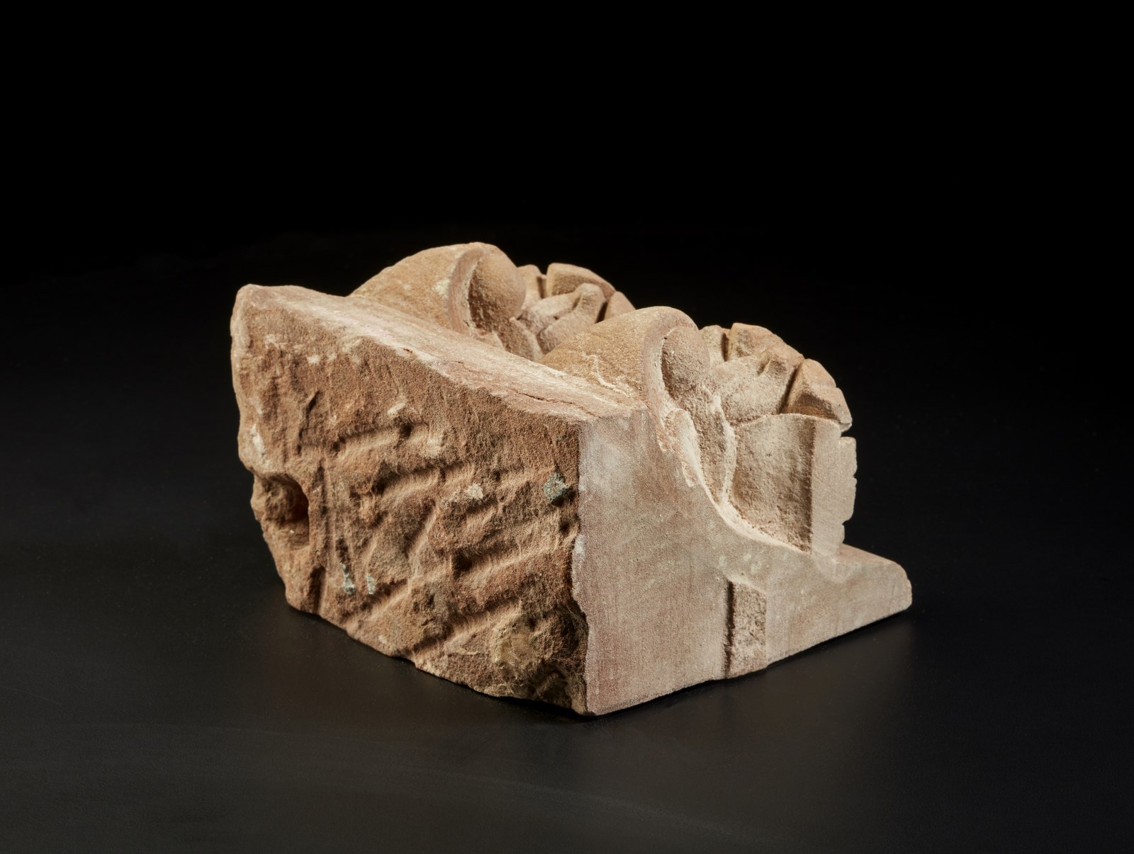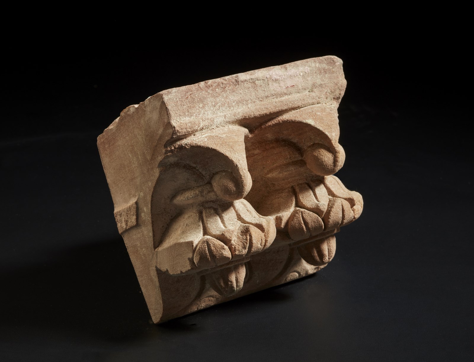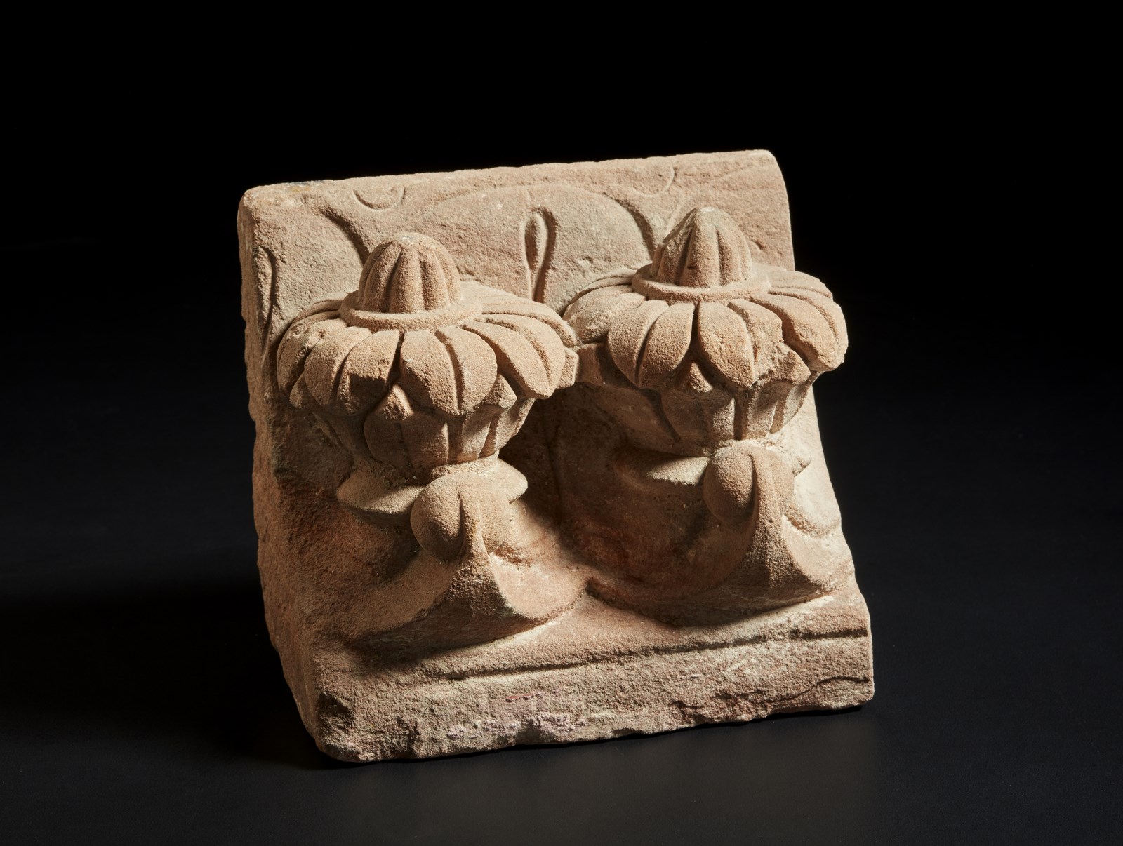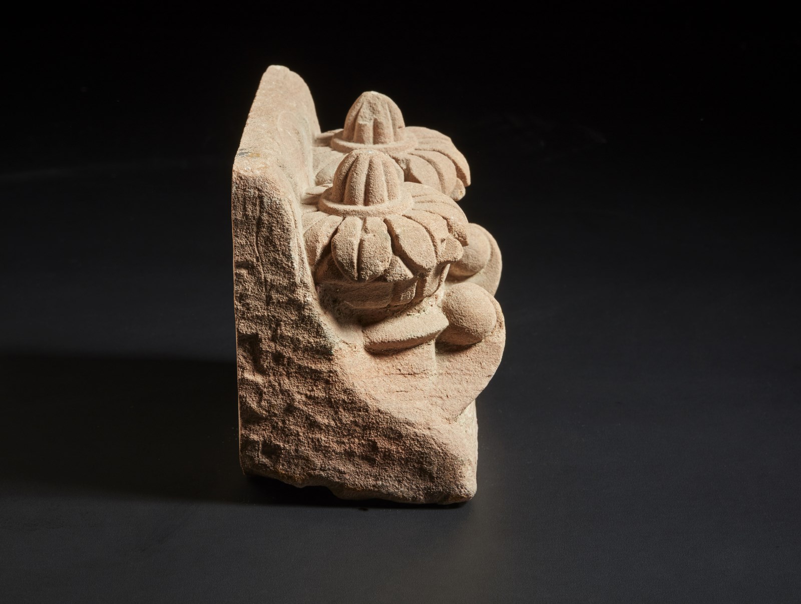 India Settentrionale, Rajasthan, Bikaner, XIX secolo . . Cm 15,00 x 12,50 x 9,00. Frammento di elemento architettonico decorativo, finemente scolpito con con bulbi dai petali sovrapposti.