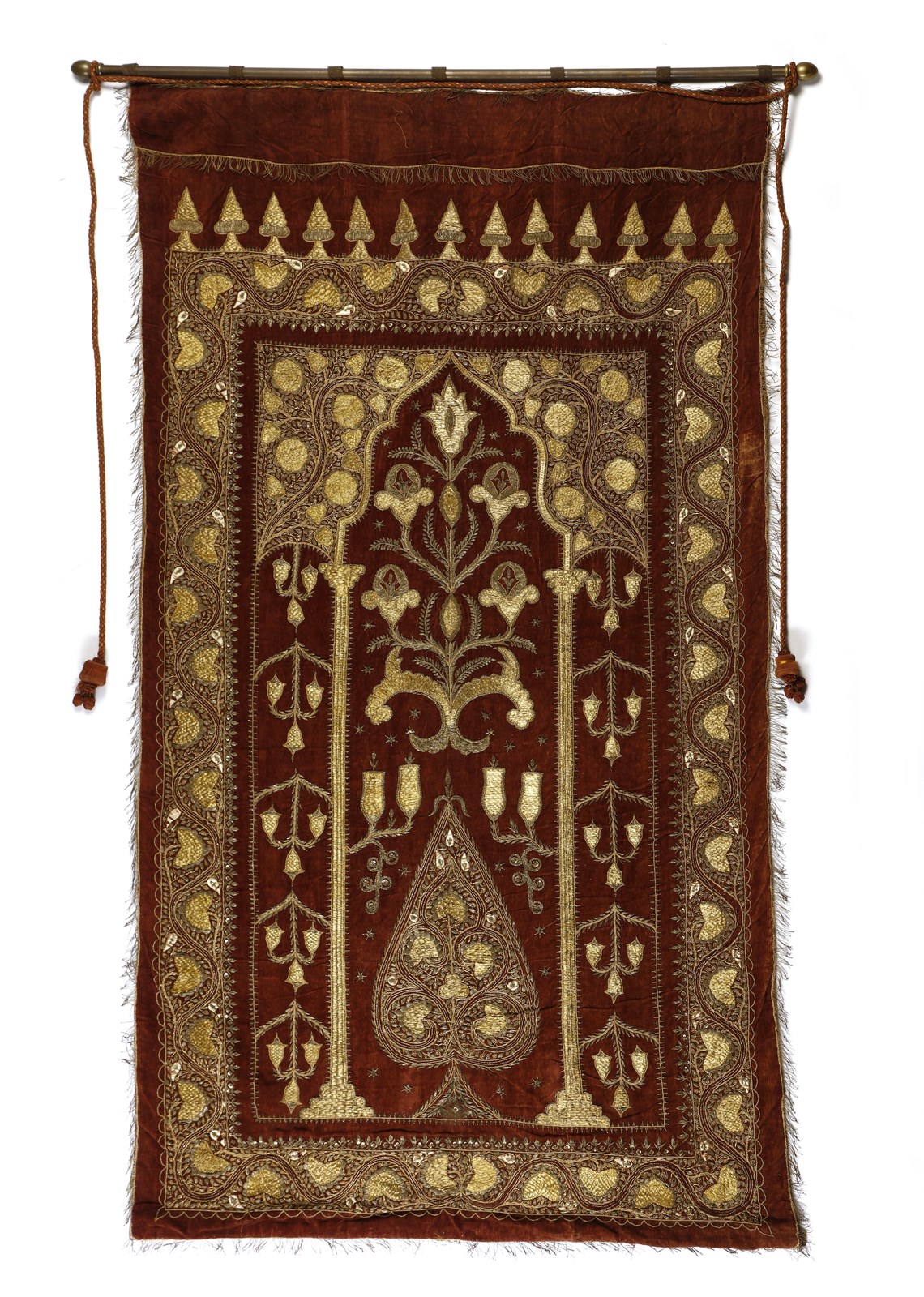 India, XIX secolo. . Cm 119,00 x 211,00. Grande e importante arazzo in stile Moghul realizzato in velluto di seta bordeaux e fini ricami in rilievo a fili oro e argento in stile zardozi.