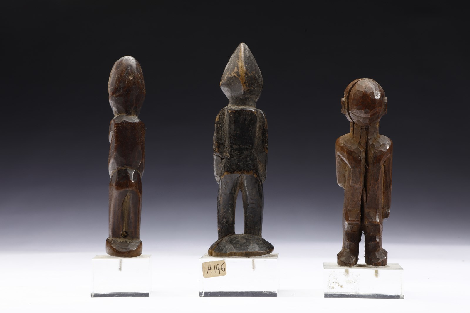 . . Cm 11,00. Tre piccole sculture in legno raffiguranti uomini in piedi, forse statuette Ere Ibeji legate al culto dei gemelli.