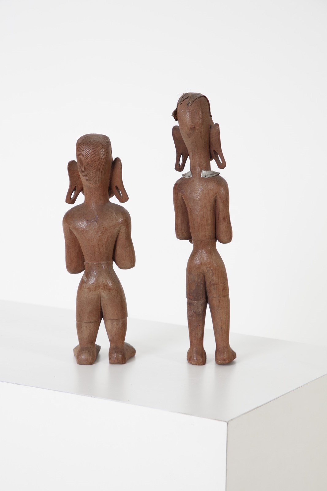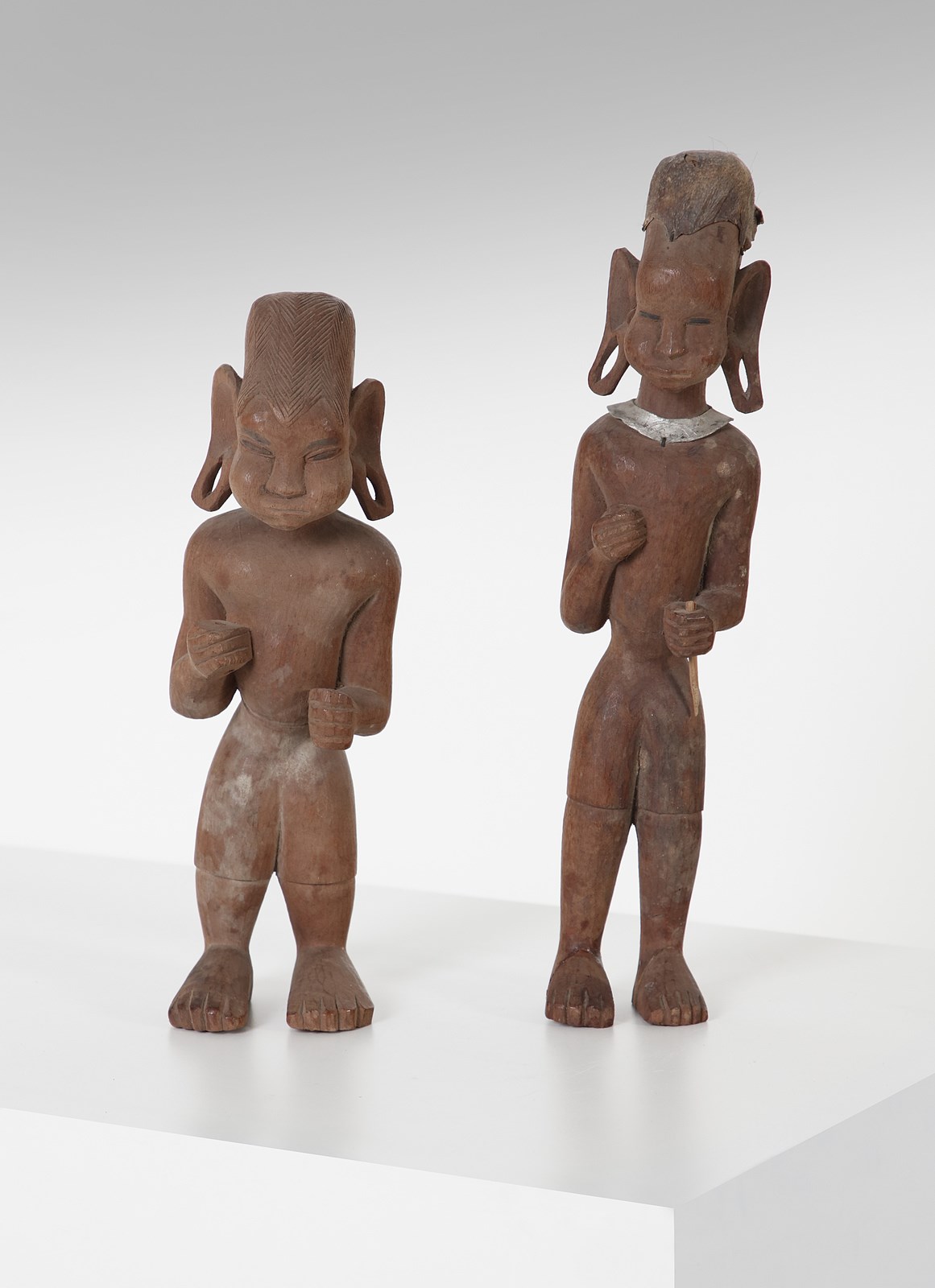 Rep.Dem.Congo (?). -. Cm 8,00 x 34,00. due sculture in legno tenero non patinato raffiguranti due guerrieri in piedi caratterizzati dai grandi lobi auricolari traforati. Una delle due figure porta un collare realizzato in alluminio.