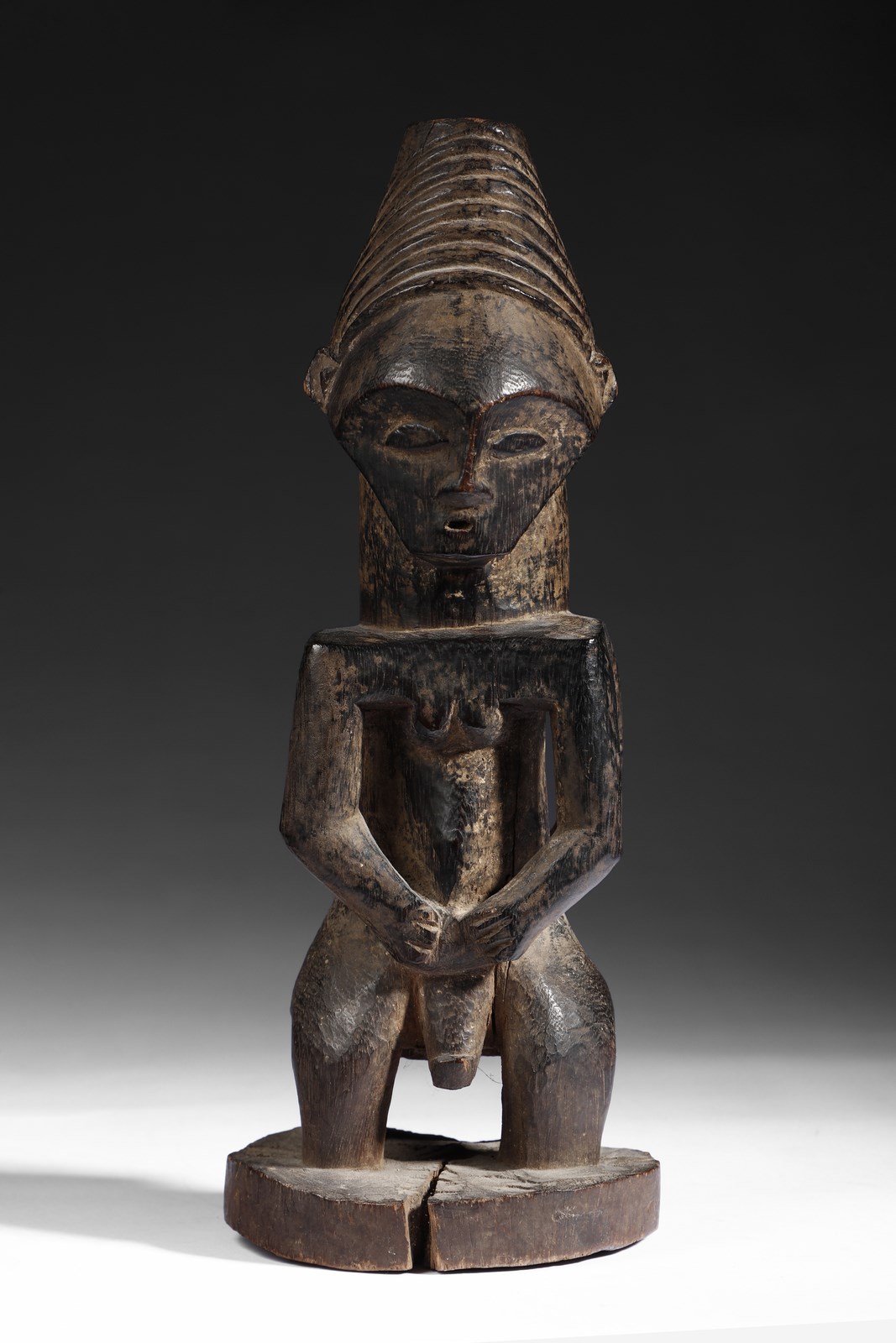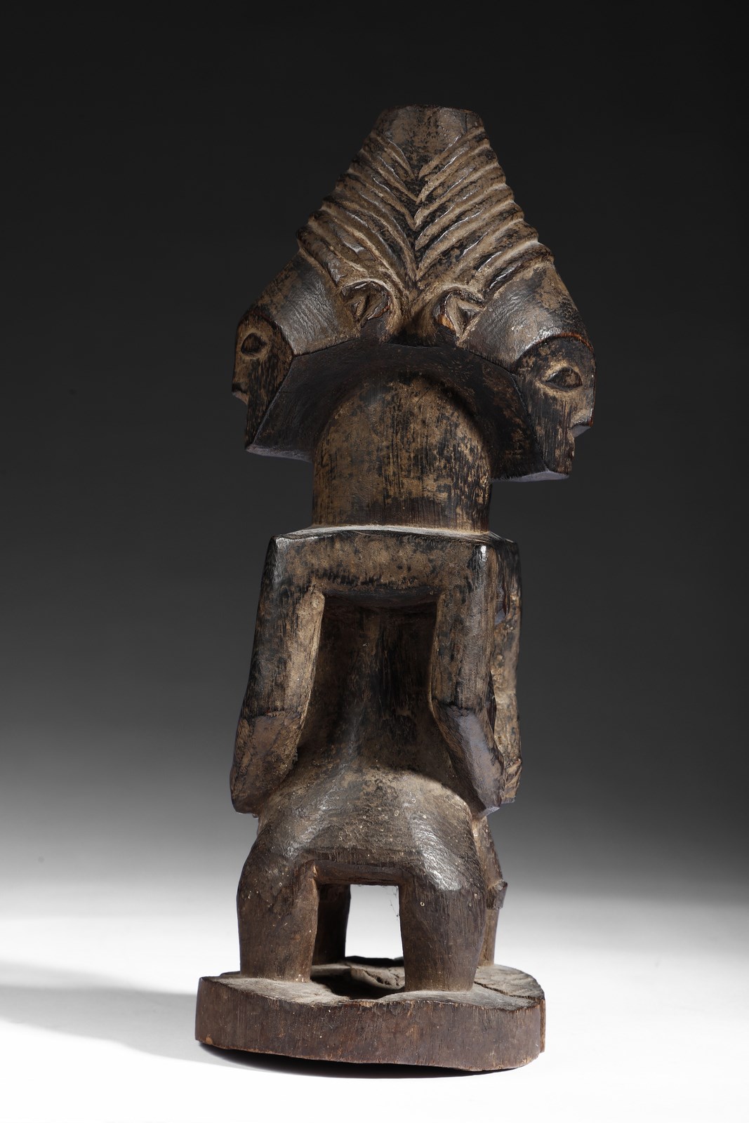. . Cm 12,50 x 30,50. Statuetta in legno intagliato a patina nera raffigurante due gemelle siamesi unite per la schiena sedute con le mani sul ventre. Questa scultura è riconducibile al culto dei gemelli, tema molto sviluppato in tutta l'Africa equatoriale.