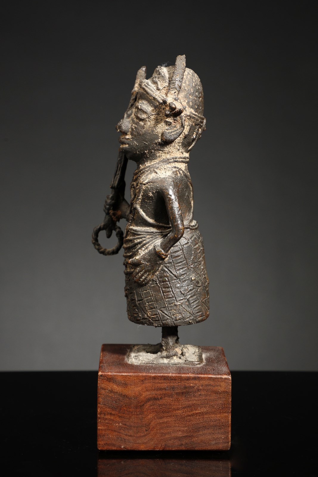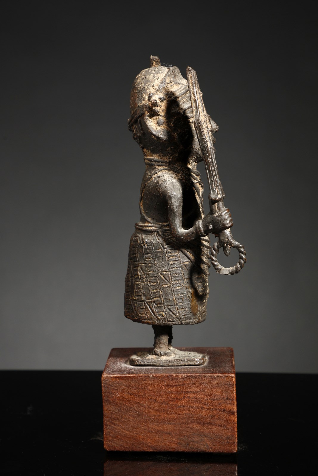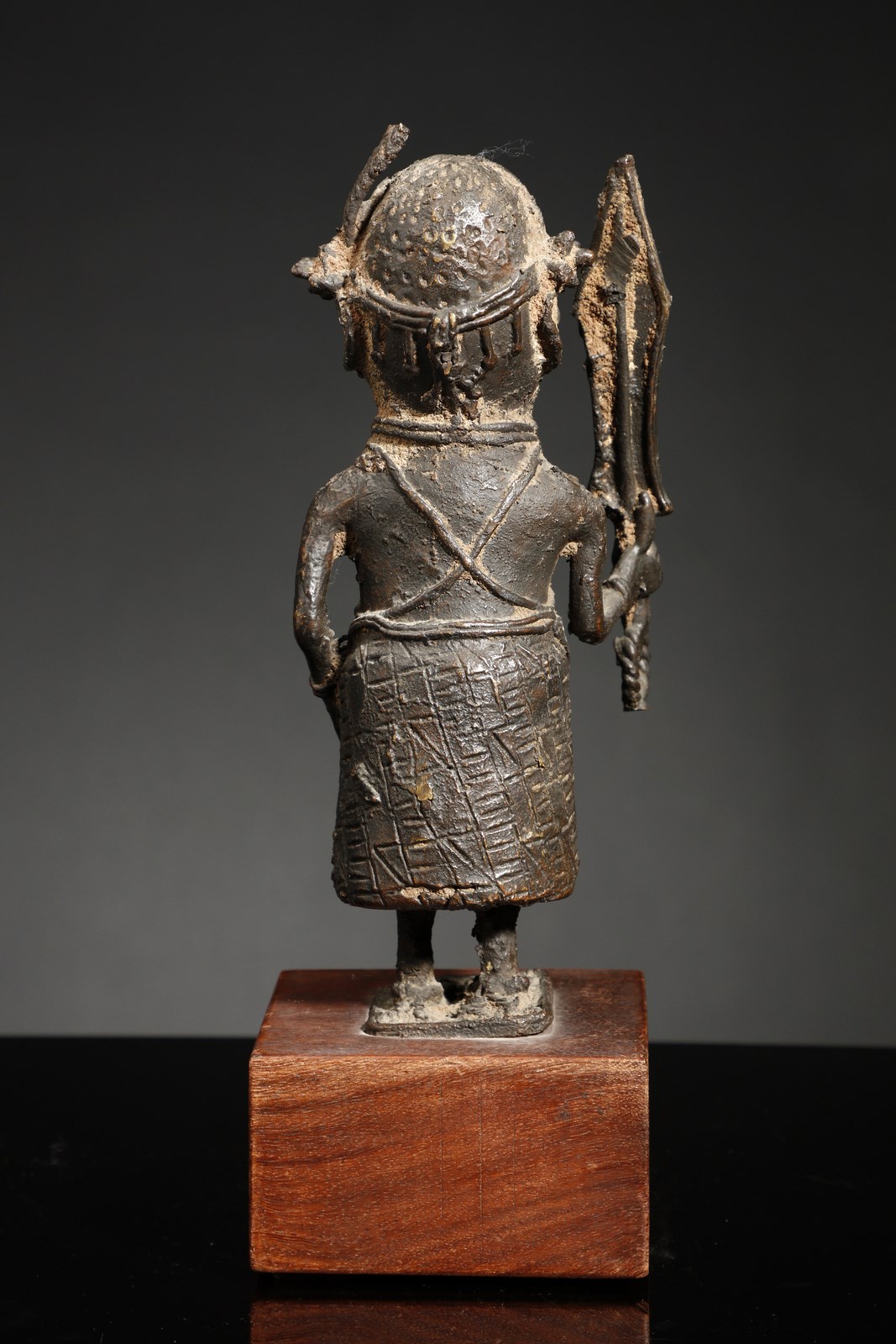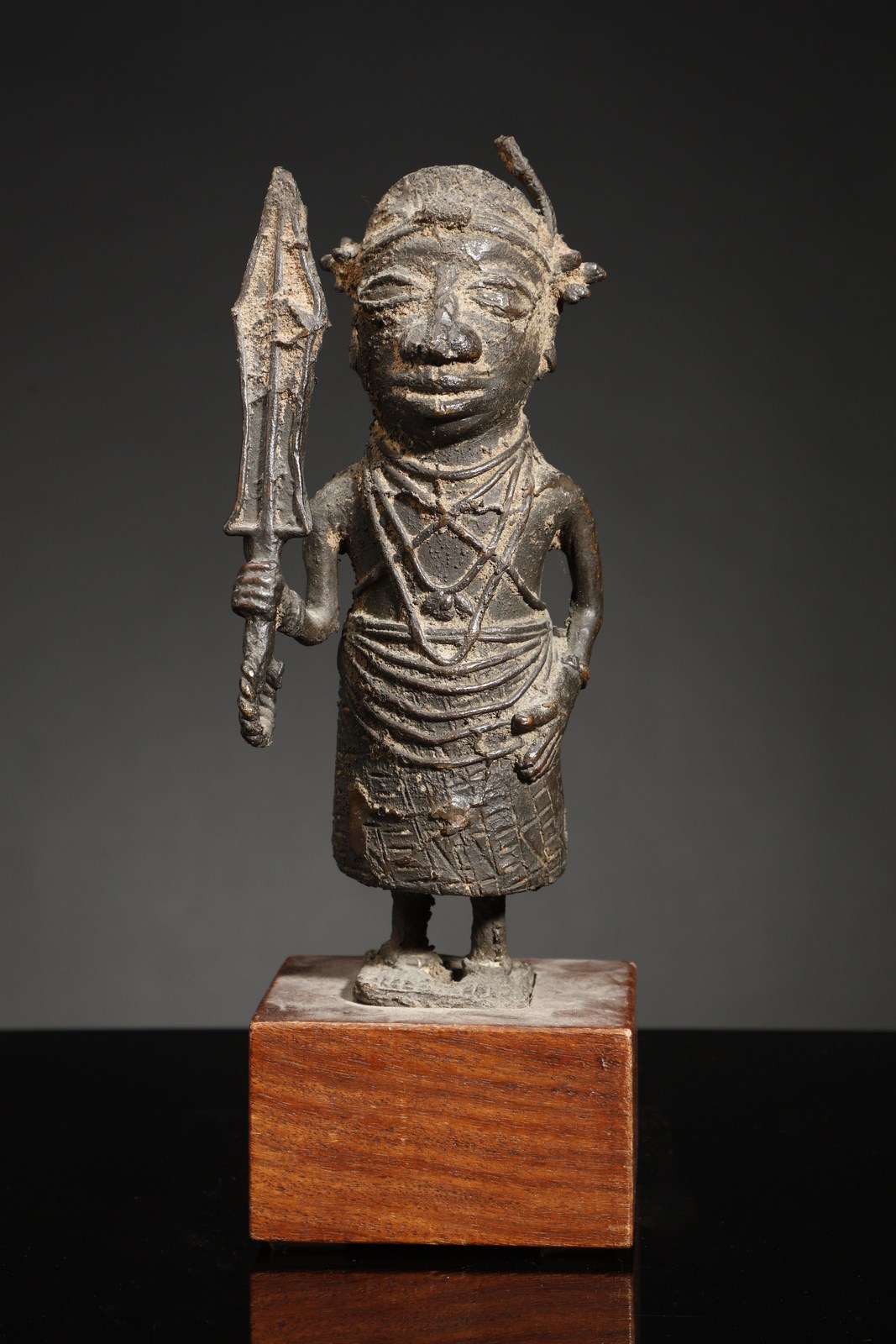 . . Cm 25,00. Piccola fusione in bronzo raffigurante un uomo in piedi armato di lancia, realizzato nello stile del Benin del XVII secolo.