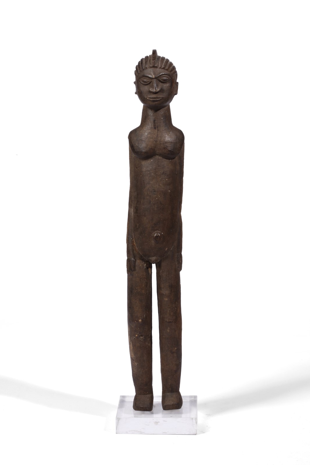 . . Cm 11,00 x 68,00. Figura di uomo in piedi con le braccia distese lungo i fianchi realizzata in legno a patina scura incrostata.