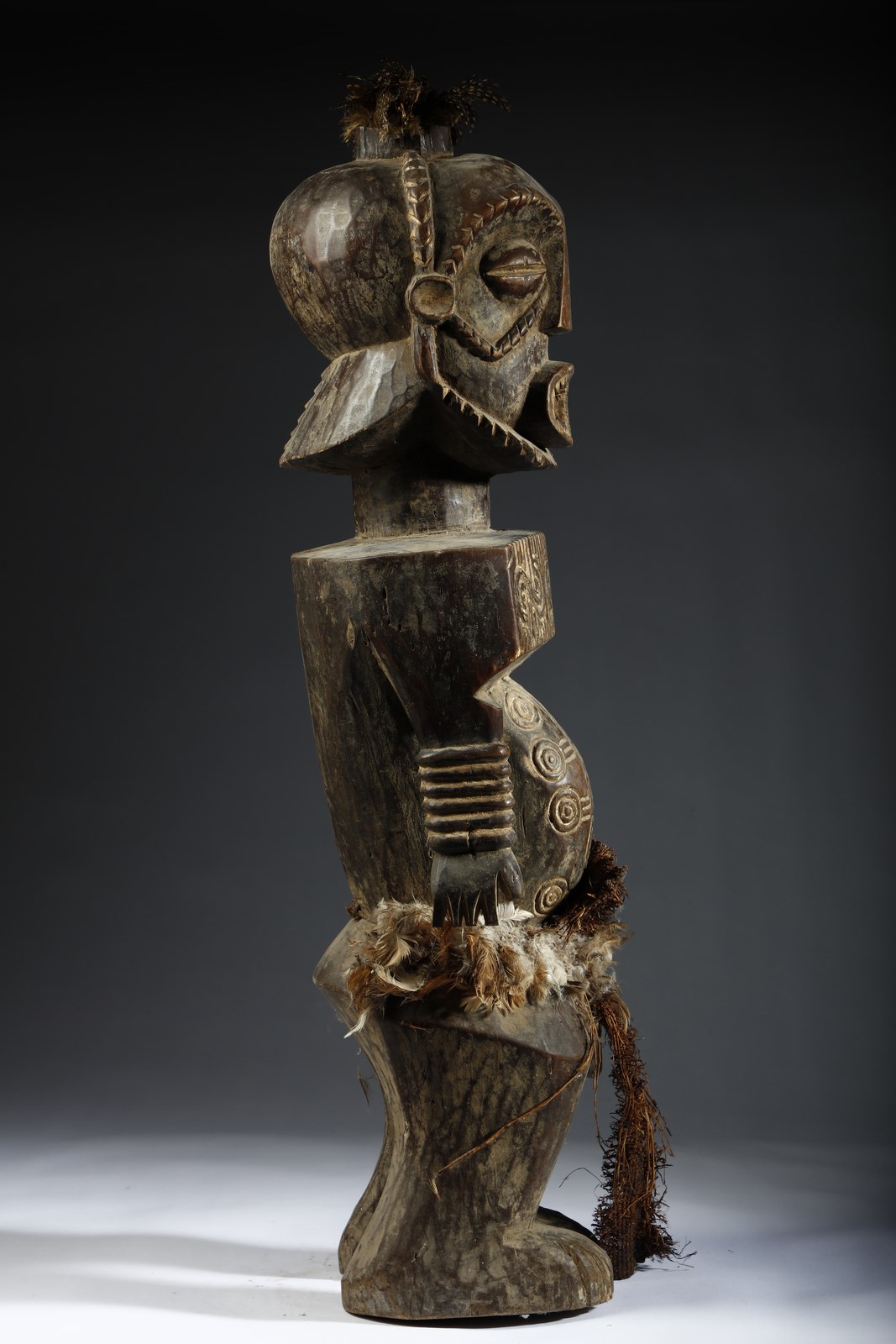 . . Cm 84,00. Importante statua in legno a patina bruna con tracce di pigmentazione colorata raffigurante uno spirito ancestrale. La scultura, caratterizzata dalle particolari volumetrie delle parti anatomiche, presenta l'intera superficie coperta da elaborati disegni geometrici. Questo tipo di manufatti vengono realizzati dai Buyu, piccolo gruppo etnico della regione di Kabambare del Congo sulle sponde del lago Tanganca.