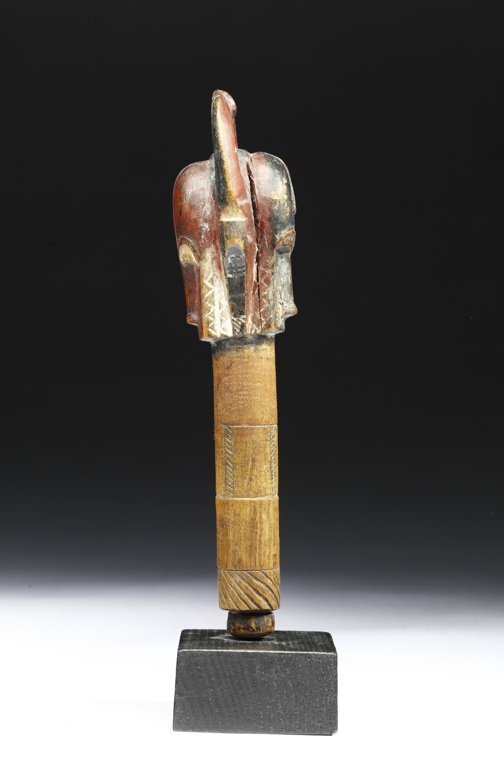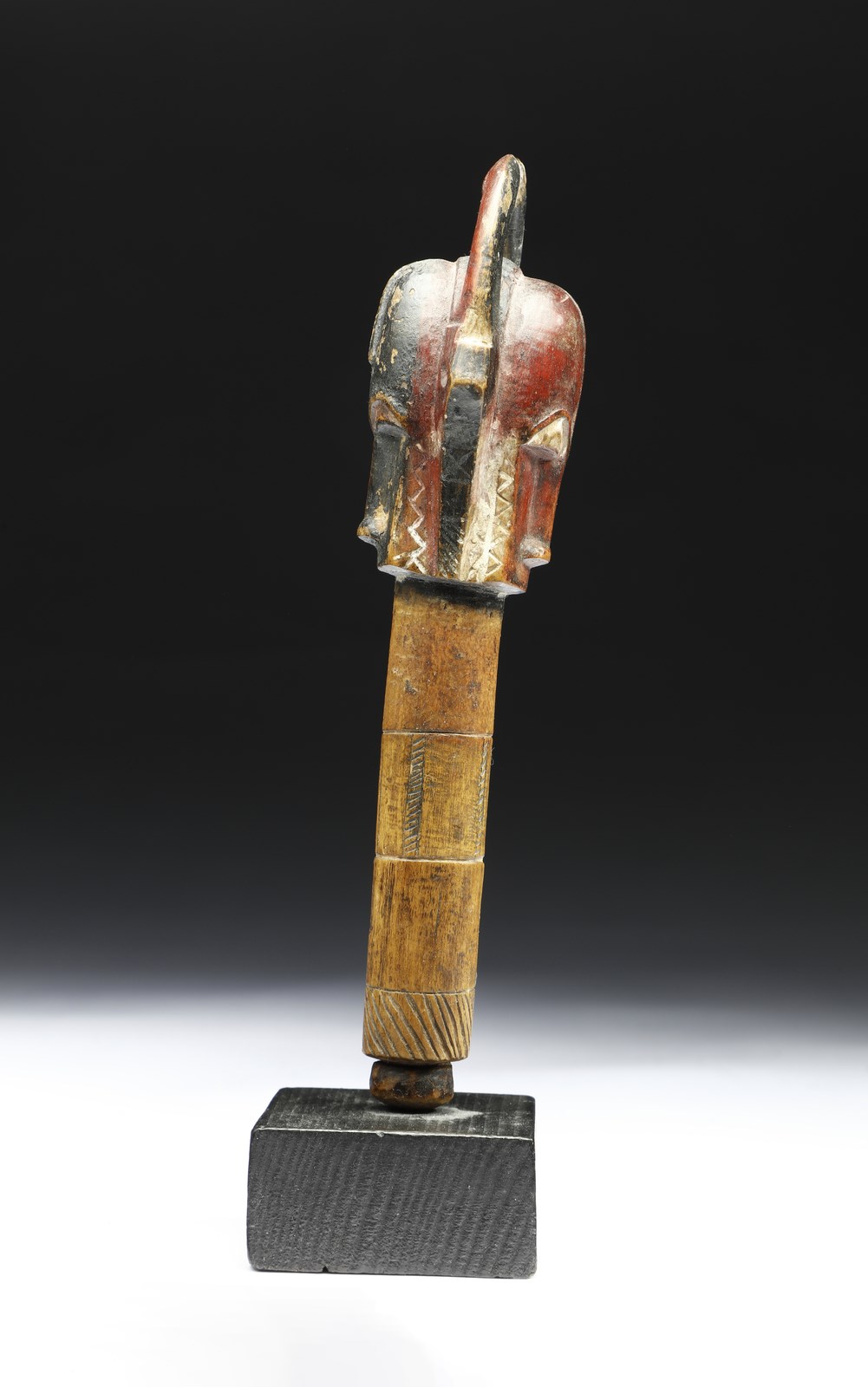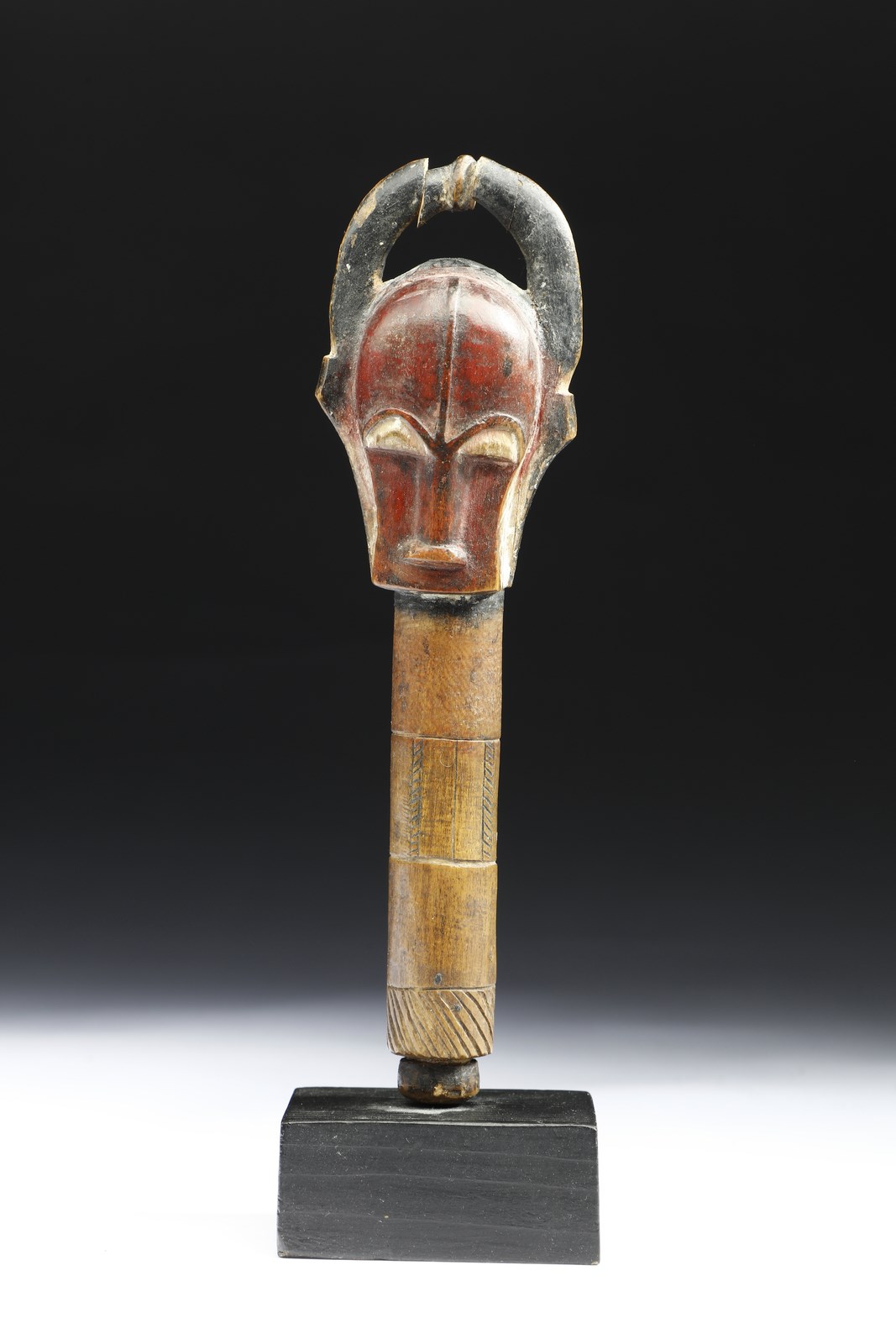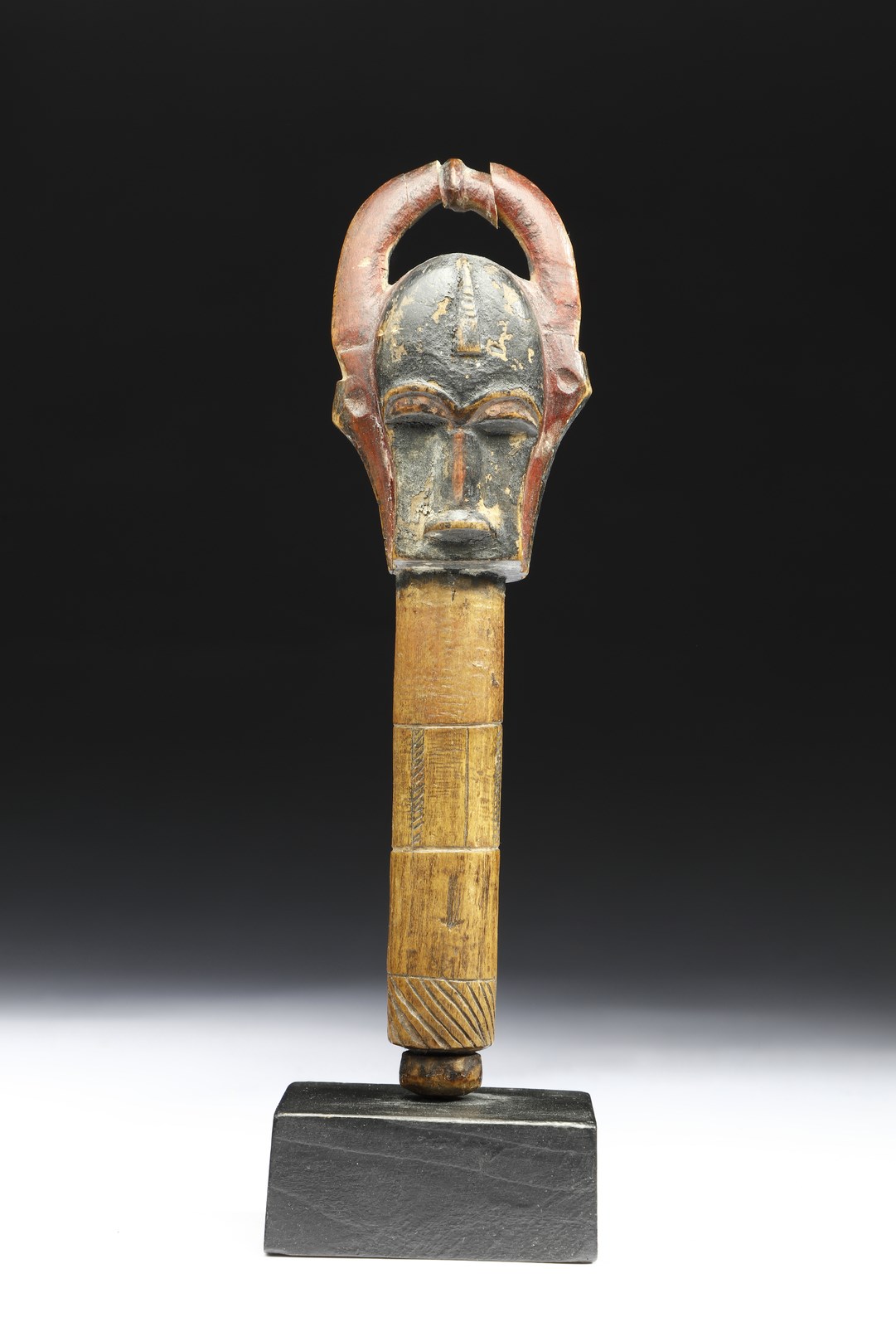 Baulè, Costa d'Avorio. . Cm 19,00. Interessante ed inconsueta impugnatura realizzata in legno a patina bruna e sormontata da una immagine gianiforme del dio Guli, venerato dalle popolazioni di etnia Baulè.