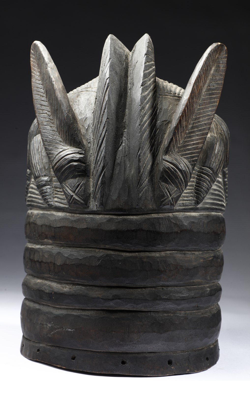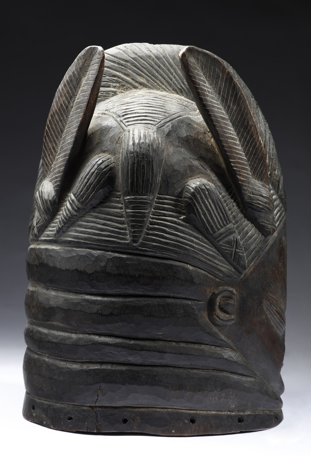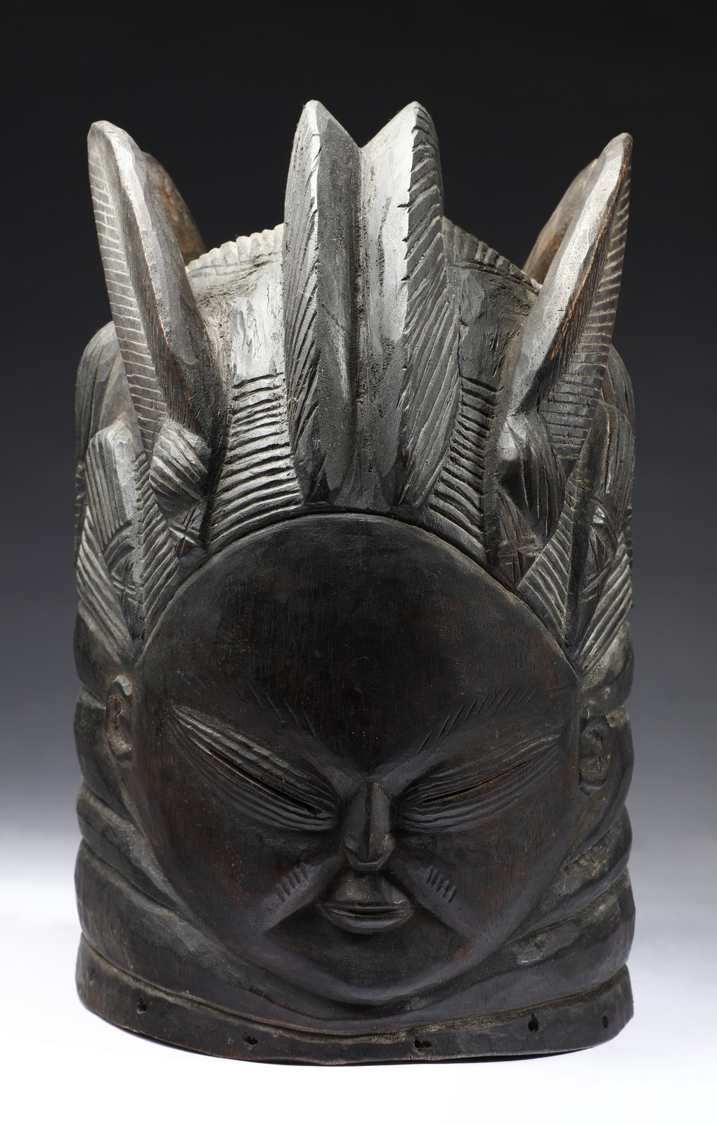 Mende, Sierra Leone. . Cm 34,00. Imponente maschera a casco in legno a patina scura realizzata per la società femminile Sande. Il volto liscio e rotondo sormontato da una elaborata acconciatura a cresta.