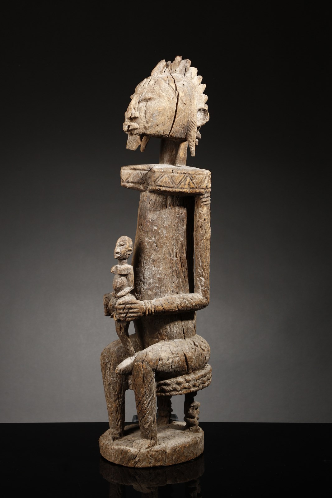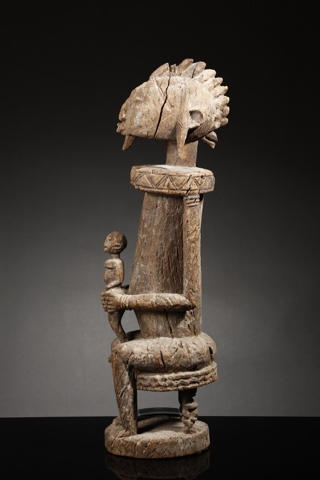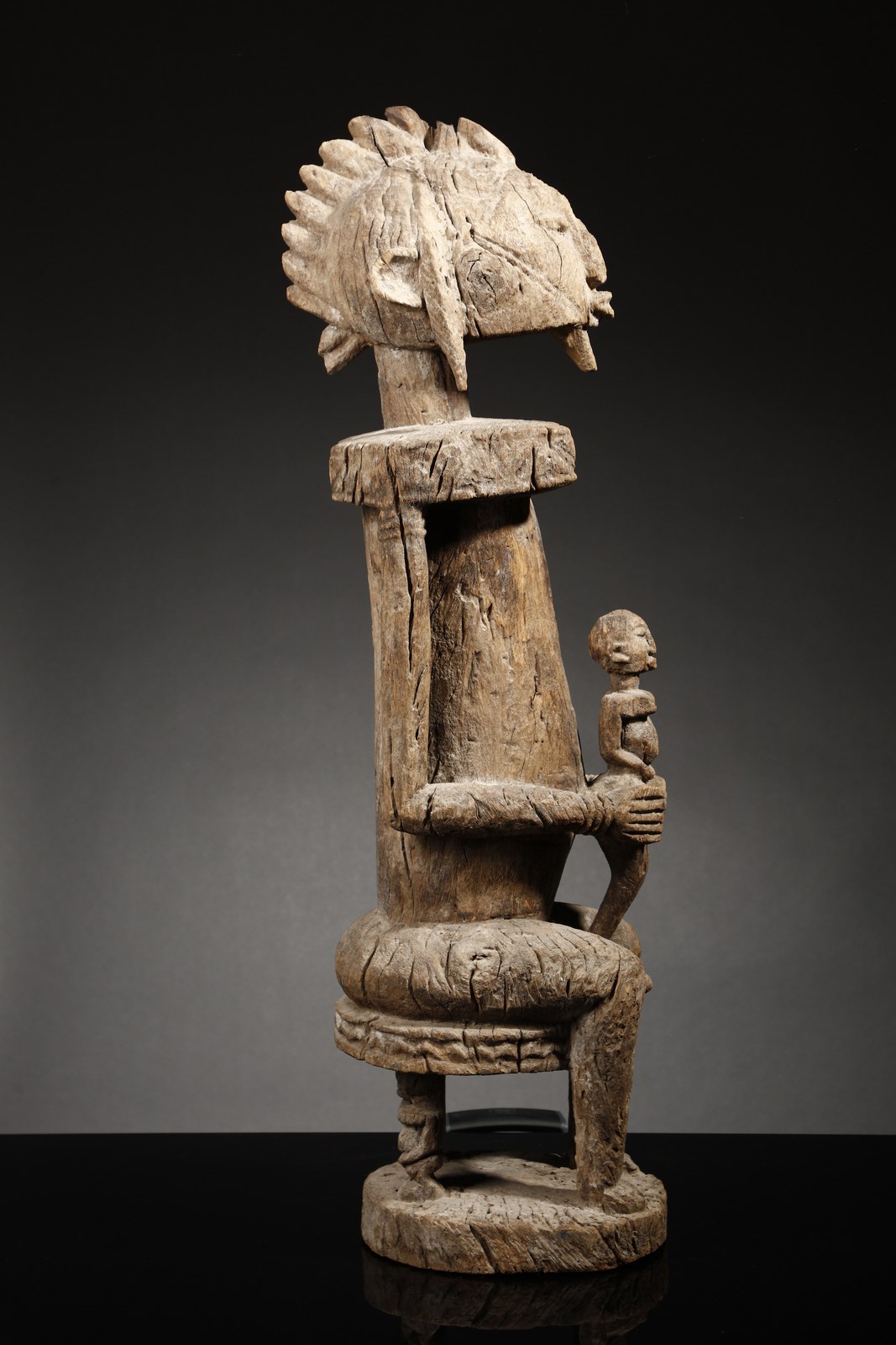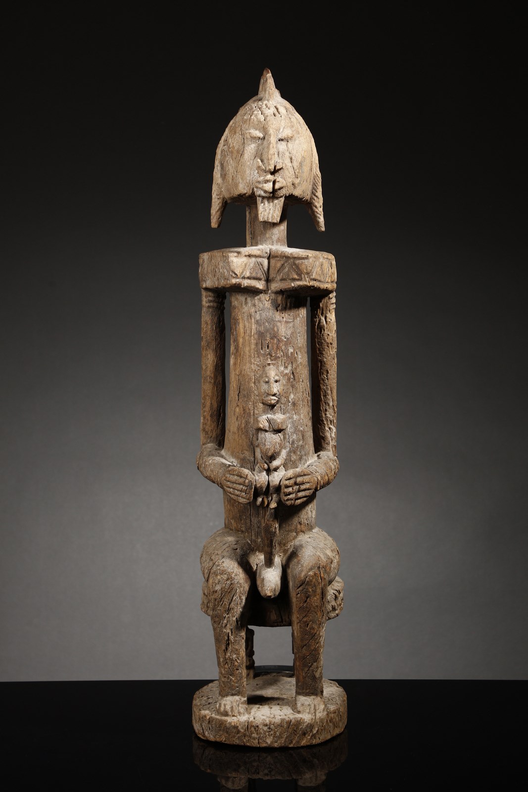 . . Cm 88,00. Scultura in legno pesante raffigurante l'Ermafrodito primigenio che stringe a se un Nommo. Il tema dell'ermafrodito assiso su sgabello sorretto da Nommi è ricorrente nella statuaria Dogon e si ricollega alla complessa e affascinante cosmogonia di questa antica popolazione del Mali.