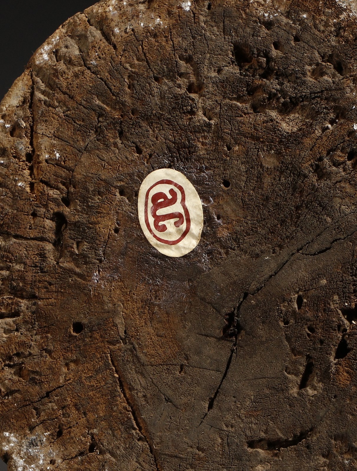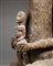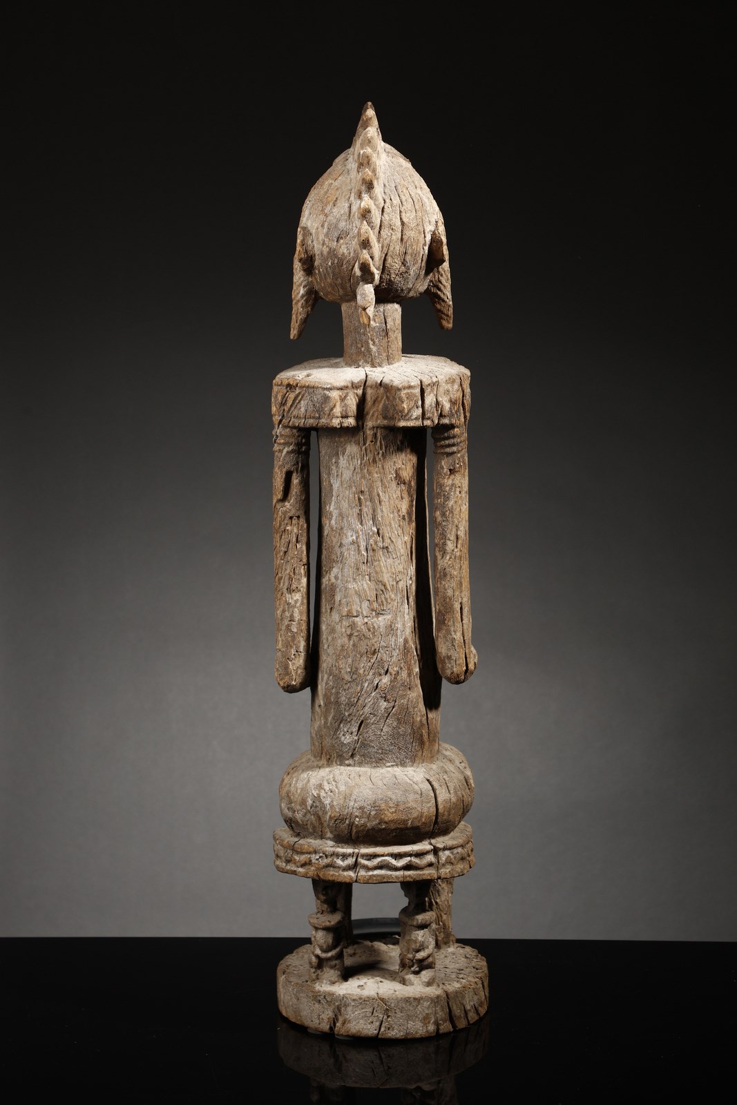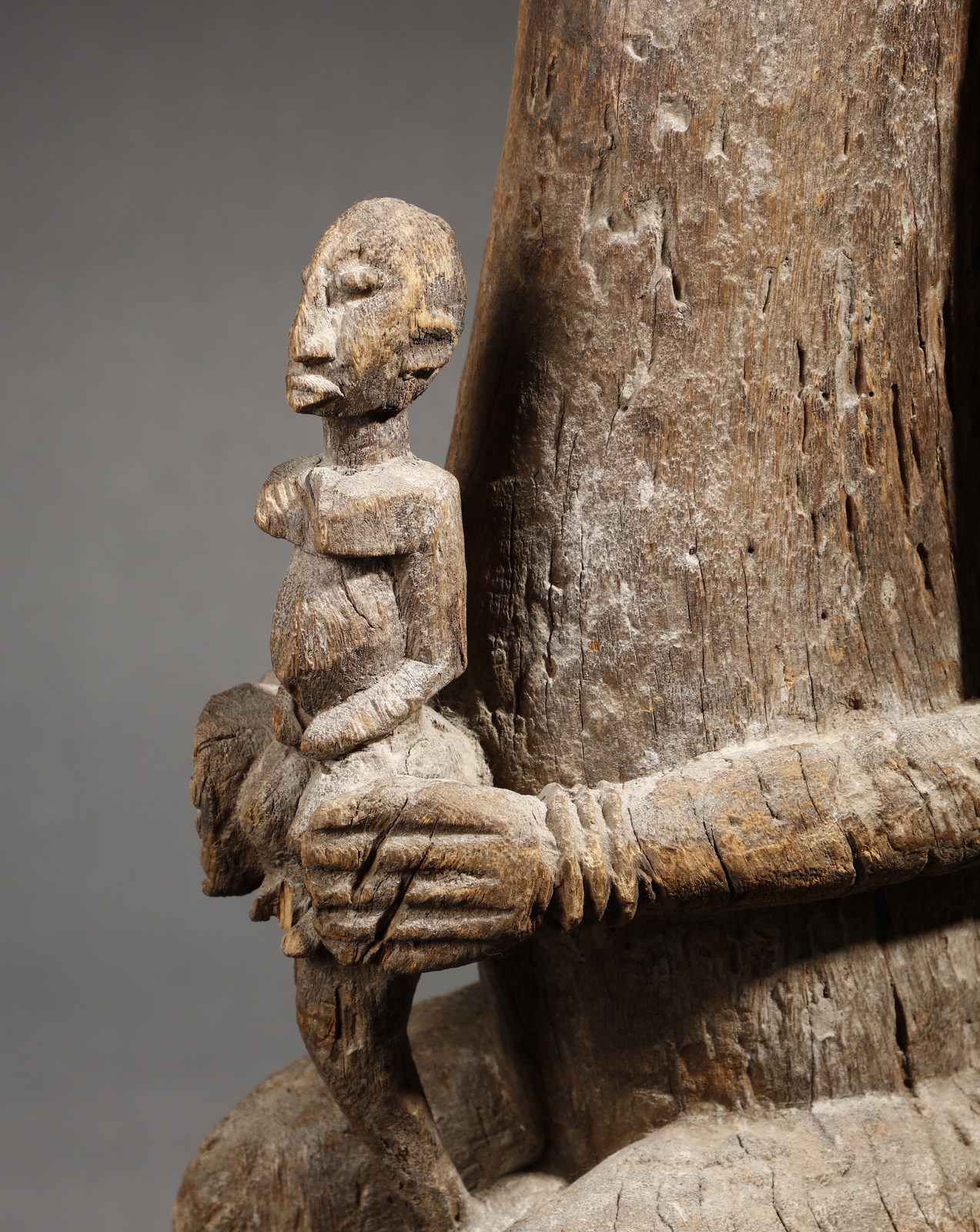 . . Cm 88,00. Scultura in legno pesante raffigurante l'Ermafrodito primigenio che stringe a se un Nommo. Il tema dell'ermafrodito assiso su sgabello sorretto da Nommi è ricorrente nella statuaria Dogon e si ricollega alla complessa e affascinante cosmogonia di questa antica popolazione del Mali.
