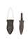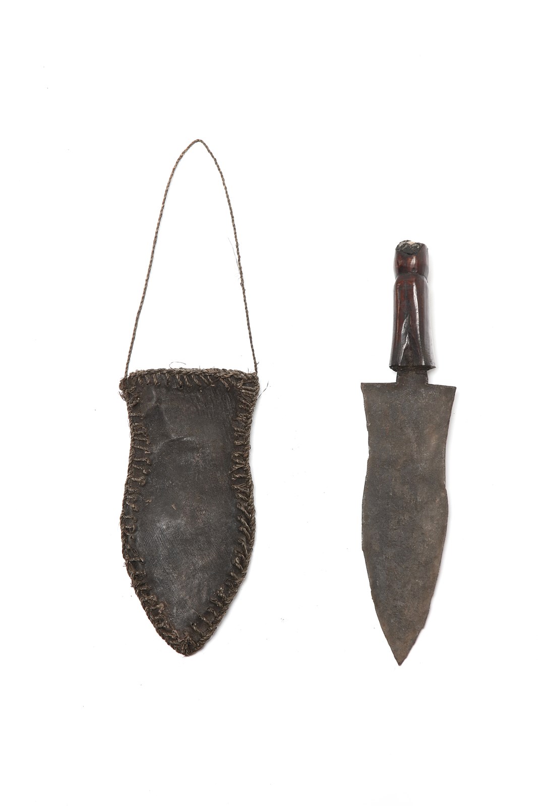 Rep.Dem.Congo. -. Cm 10,00 x 32,00. Arma corta con lama in ferro forgiato, impugnatura in osso terminante con testa maschile e fodero abbellito da nove conchiglie che fanno da cornice ad una maschera passaporto in osso intagliato cucita al centro del fodero stesso.
