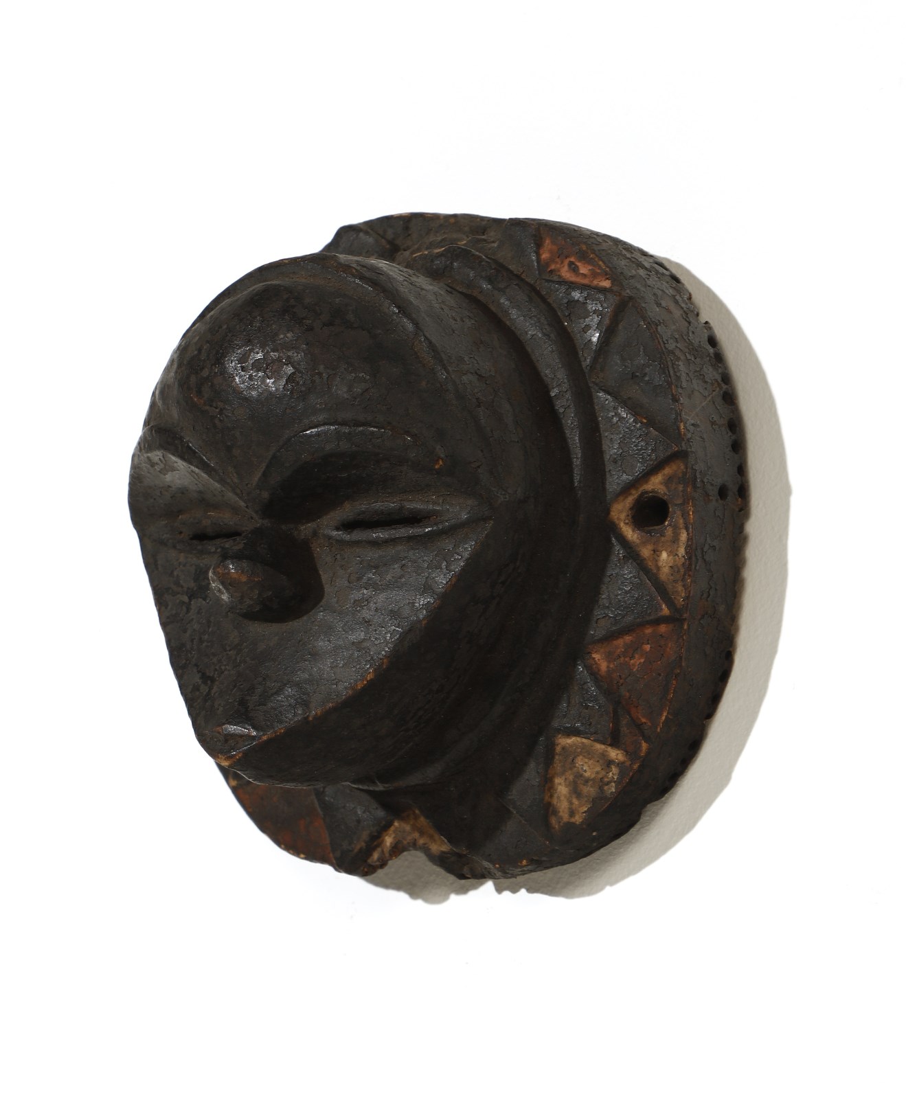 . . Cm 18,00. Piccola maschera circolare in legno a spessa patina nera incrostata con lumeggiature bianche e rosse. Questo tipo di maschera legato alla società misterica Ekpo, viene impiegata all'interno dei rituali propiziatori per il raccolto della comunità Eket stanziata nella regione dell'Akwa Ibom nel sud della Nigeria.
